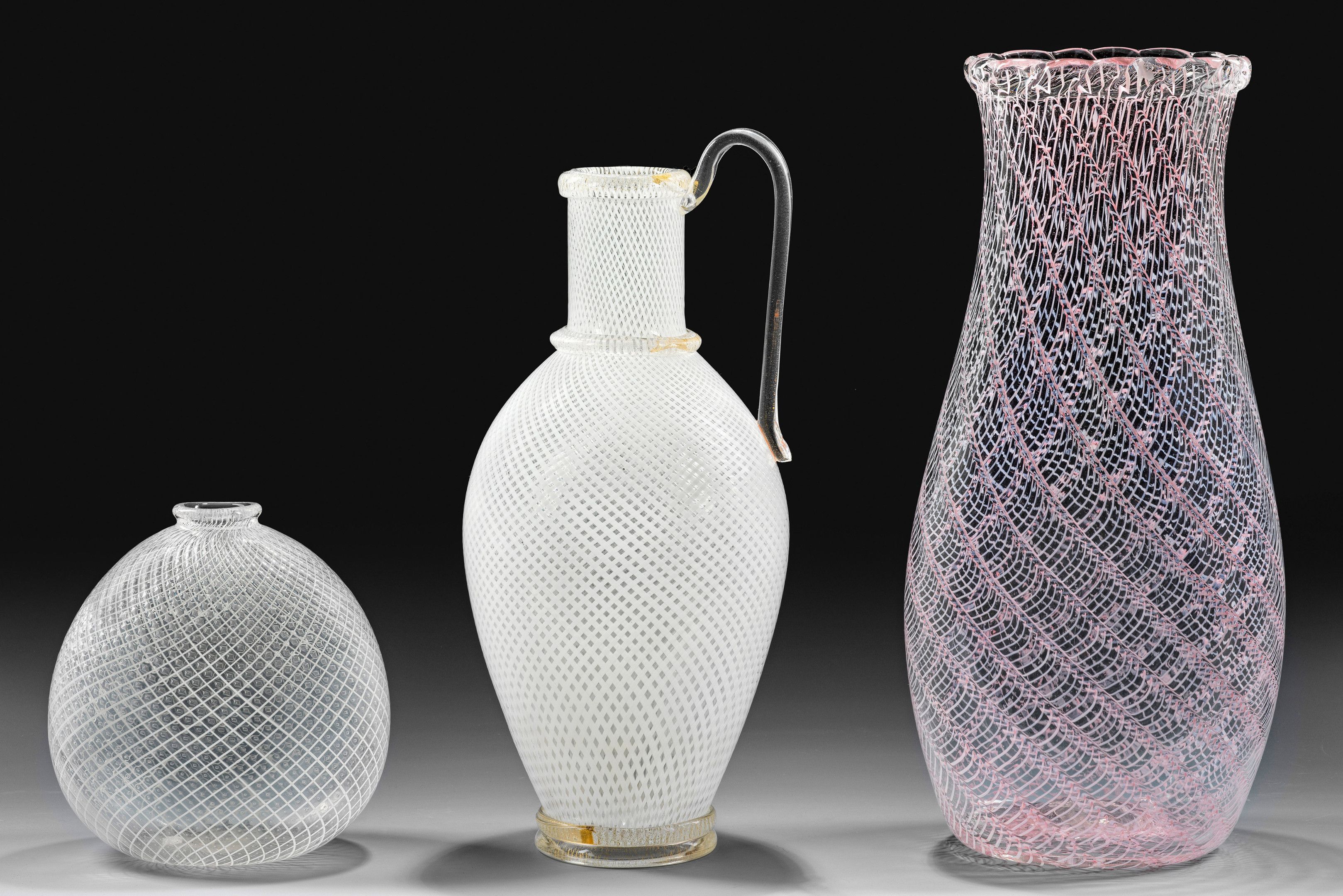 Große "Zanfirico"- und zwei "Reticello"-Vasen Farbloses, teilweise leicht schaumiges Glas mit feinen Bandeinlagen in Weiß und Rosa sowie teilw. zersprengter Goldfolie. Eine große, leicht konische Vase mit umgestülptem Abschluss in feiner "Zanfirico"-Technik. Eine amphorenförmige Henkelvase und eine ins Oval gedrückte Kugelvase in "Reticello"-Technik. Aufgrund der Technik und der Qualität wohl von Aureliano Toso. 19,5 cm - 45 cm.