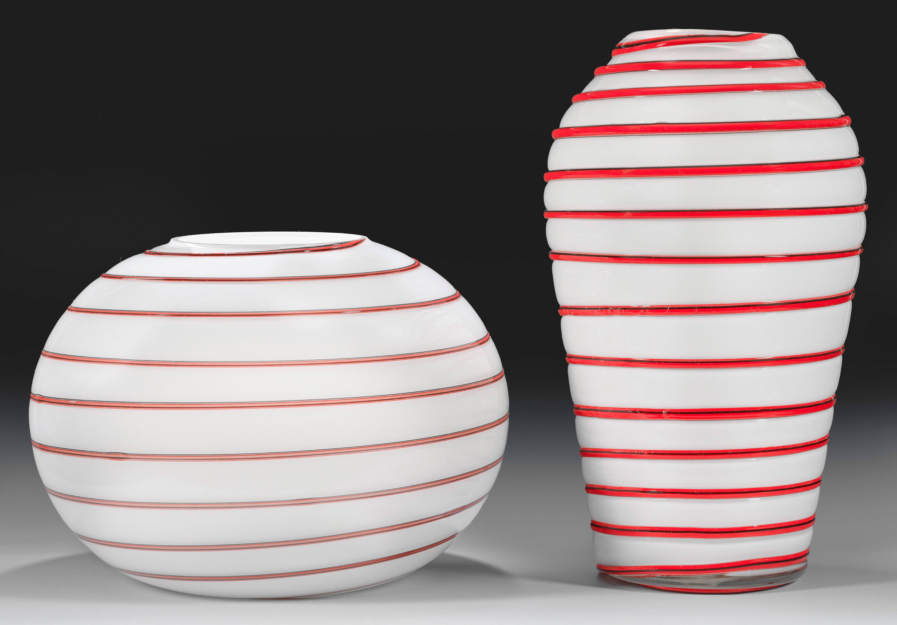 Zwei Murano Glasvasen Längsoval- und Kugelvase. Farbloses Glas mit Unterfang in Weiß. Aufgesetzte Bandeinlagen in Rot und Schwarz, sich spiralförmig um den Korpus nach oben windend. H. 25 cm - 38,5 cm.