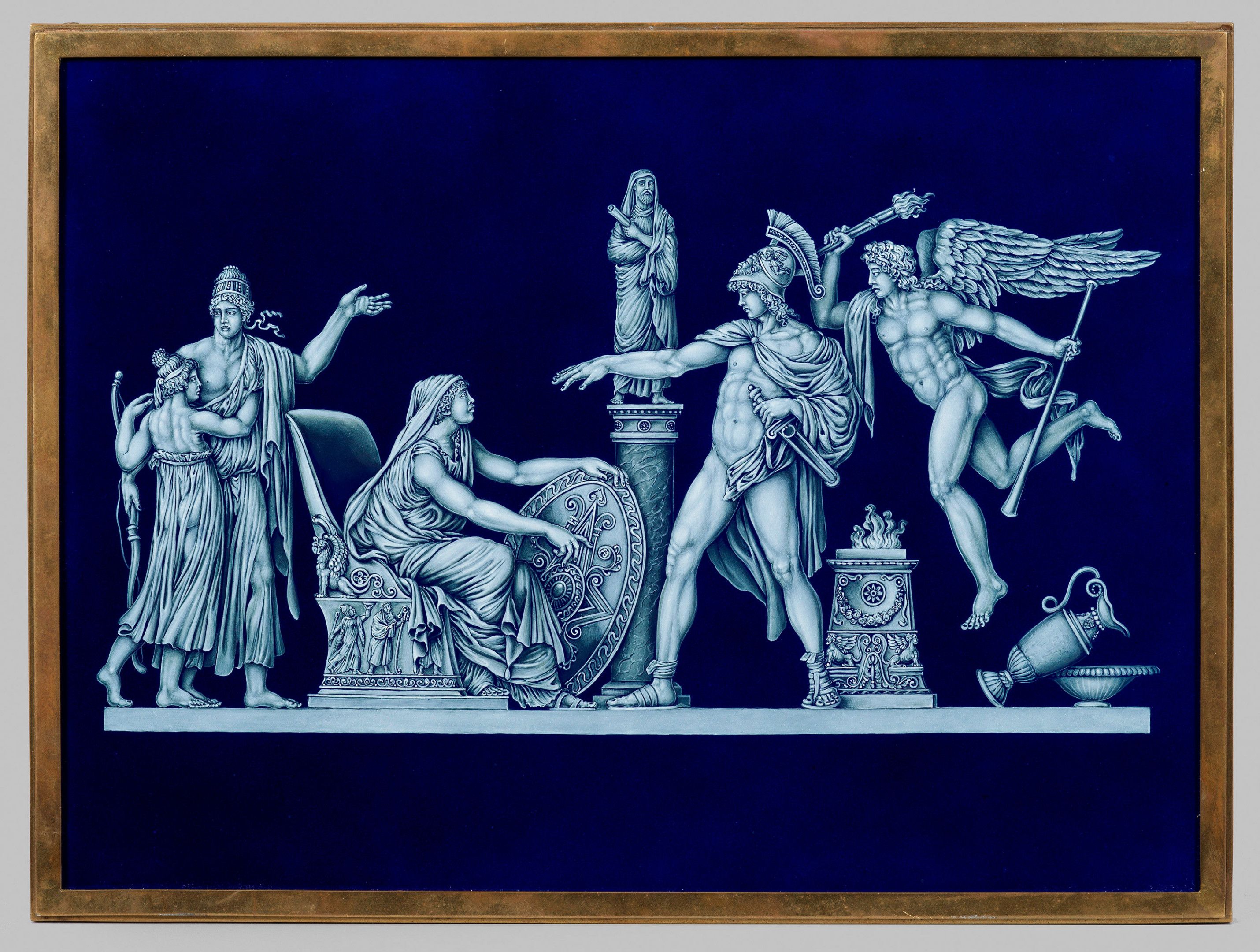 Rechteckige Platte. Auf kobaltblauem Fond szenische Darstellung der Antike. Der Abschied eines Kriegers von seiner Mutter vor dem Einzug in eine Schlacht in feiner, reliefartiger, in Weiß aufgetragener Emailmalerei. Nach der graphischen Vorlage von Pierre-Michel Alix um 1795 betitelt "Avec ou dessus" nach Jean-Guillaume Moitte. (Metropolitan Museum of Art, New York, Inv.-Nr. 2007.66). Modell-Nr. 118 C. Messingrahmen. Schwertermarke. Sichtmaß 43,5 cm x 31,5 cm. Rahmen 46 cm x 34 cm.