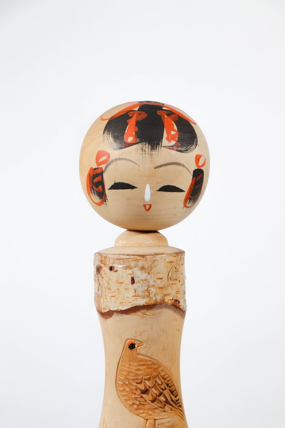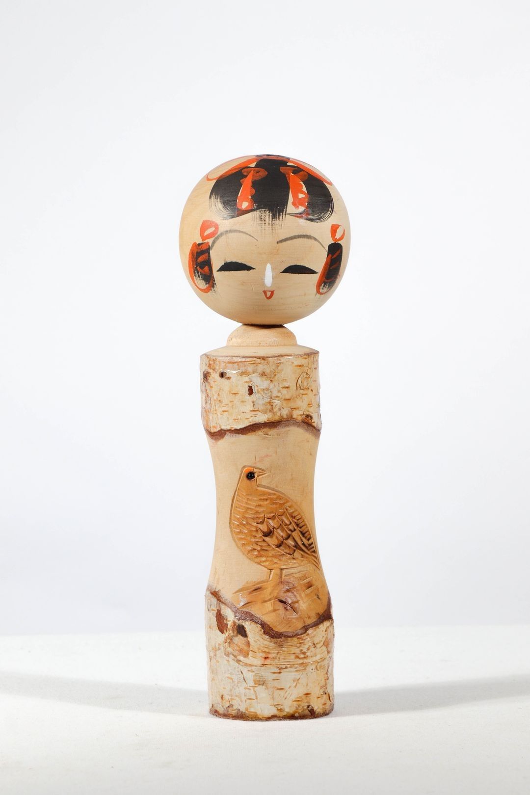 Traditional Kokeshi doll in polychrome and carved birch wood decorated with a "raicho" partridge (divine animal)
