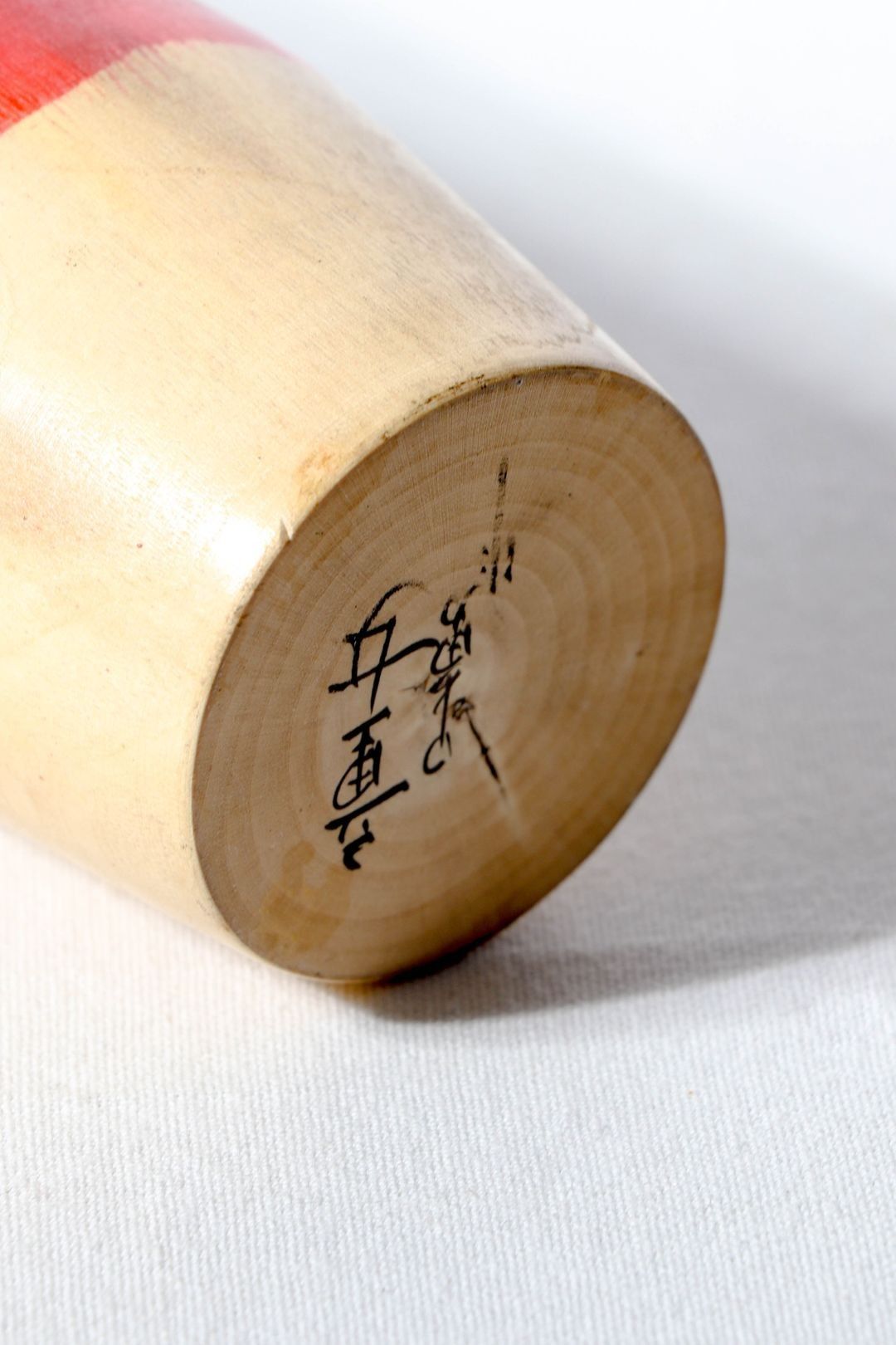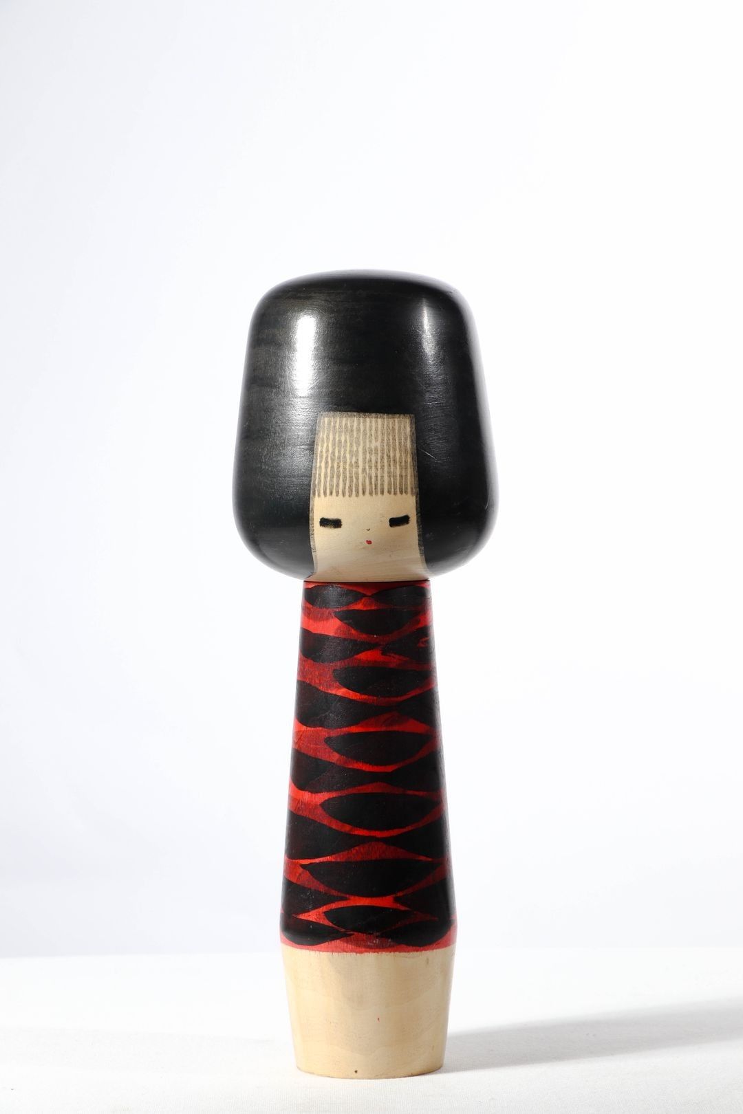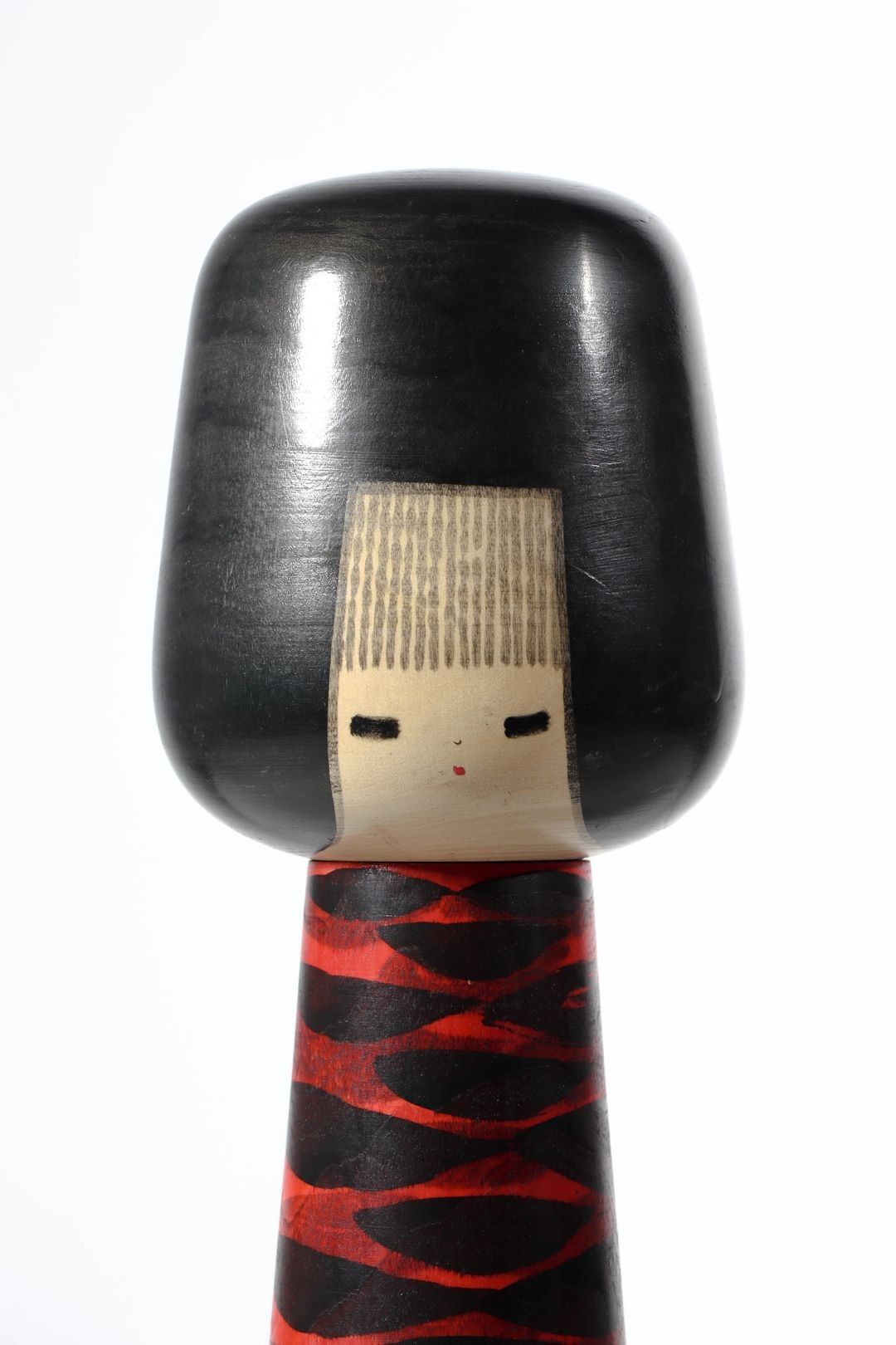 Kokeshi Sosaku doll in polychrome wood by Hideo Ishihara (1925-1999) Unusually shaped doll in two-tone red and black kimono Circa 1980 Signed under the base H. 30 cm - This lot is available anywhere in mainland France from €12.24