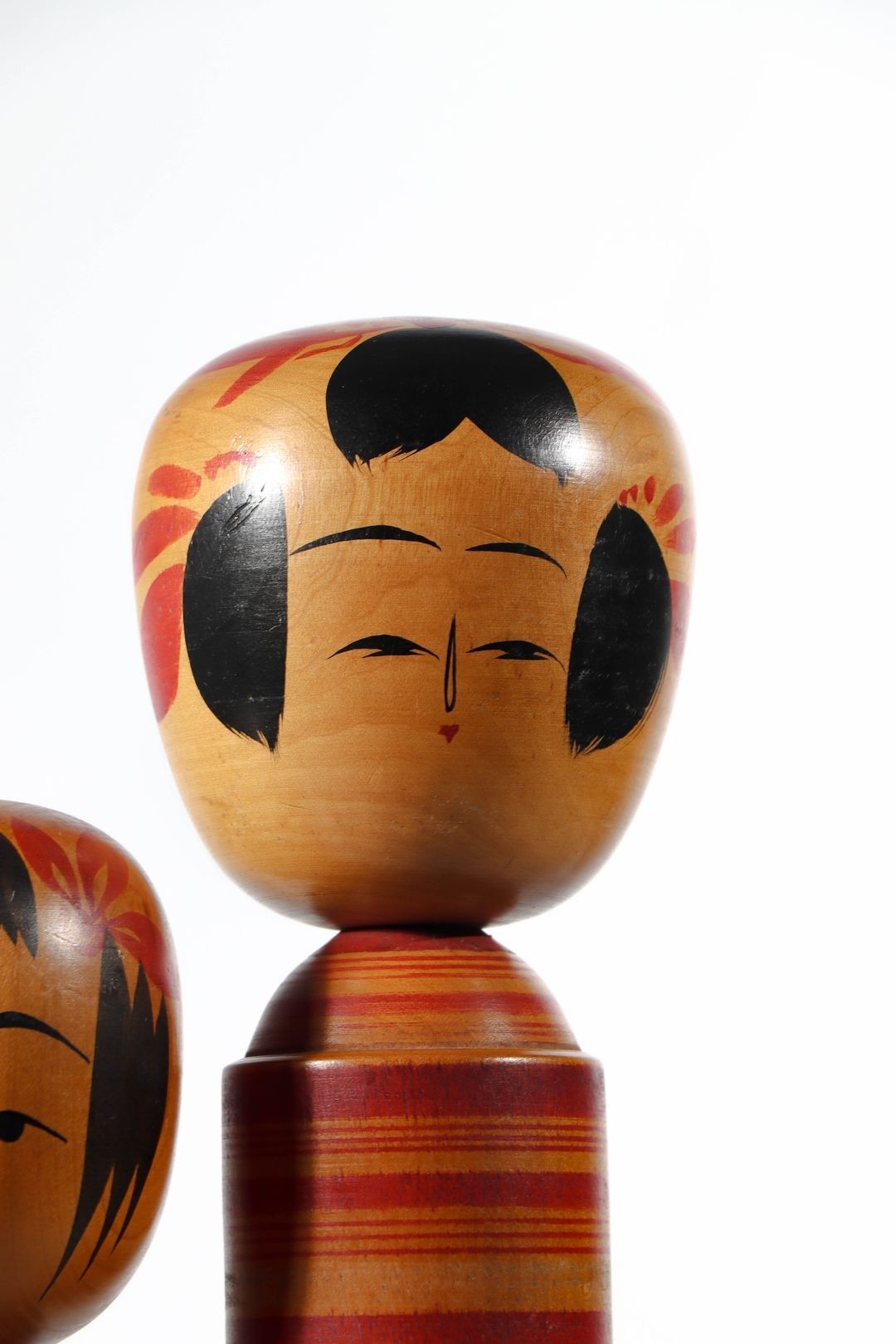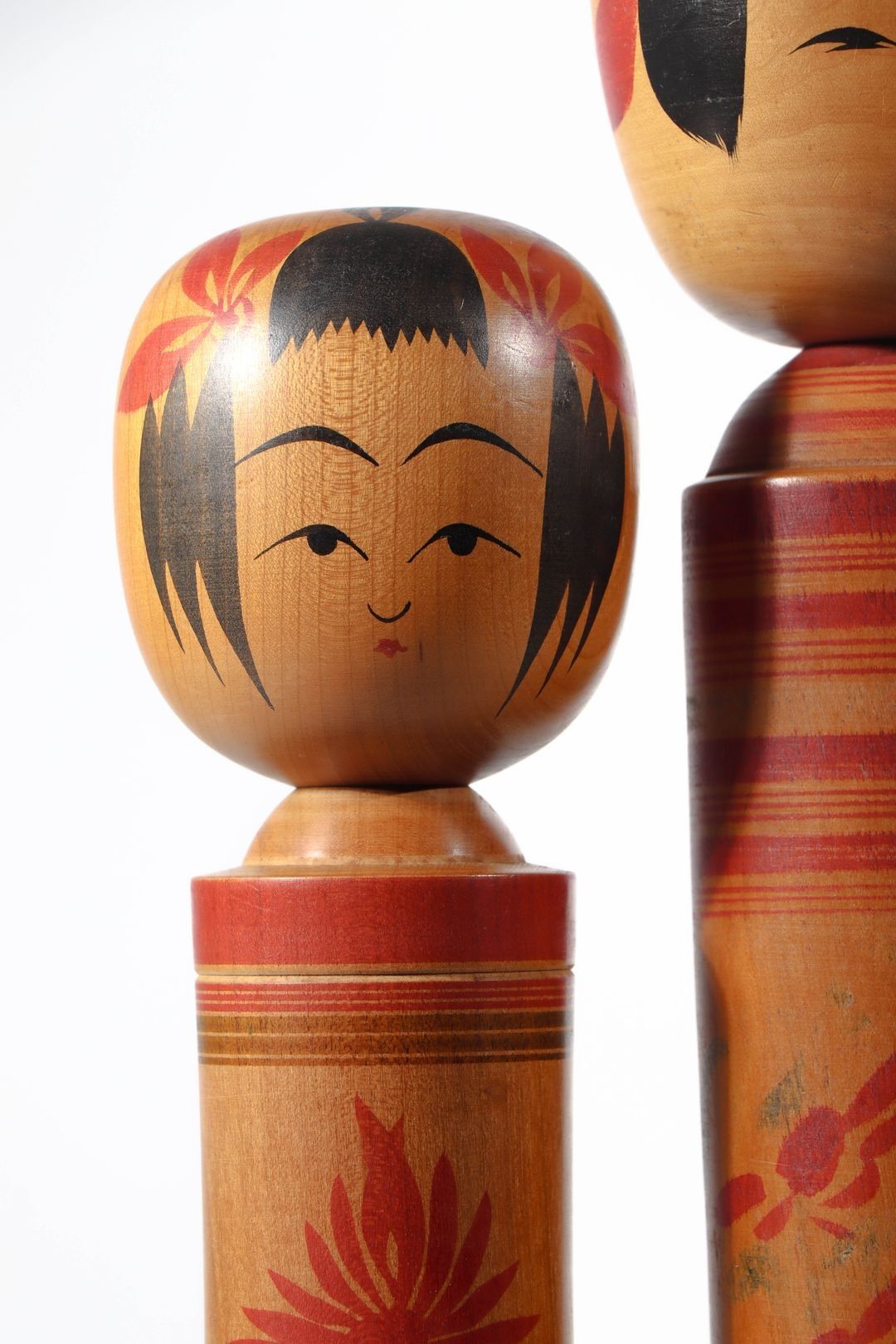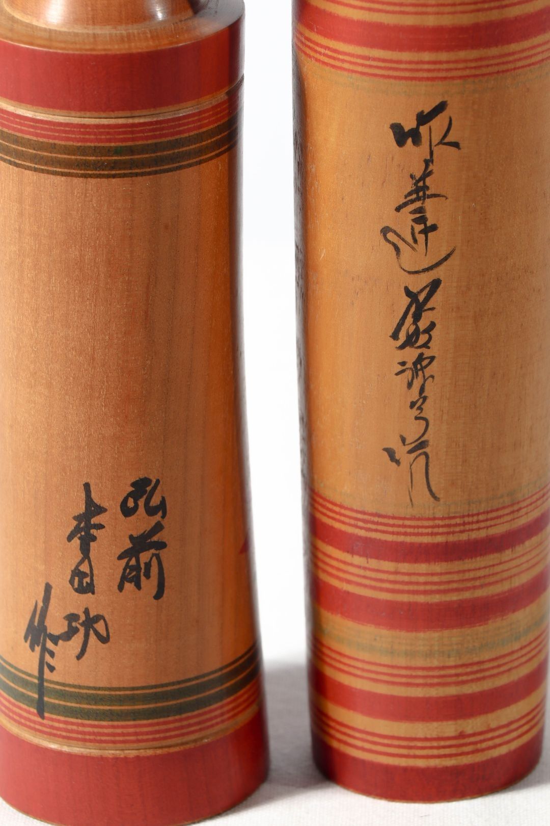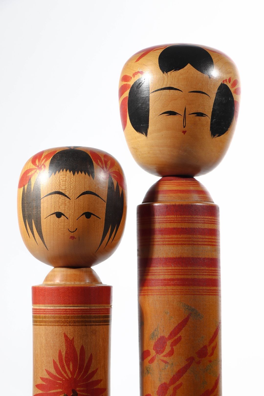 Duo of traditional Kokeshi dolls with antique patina in polychrome wood