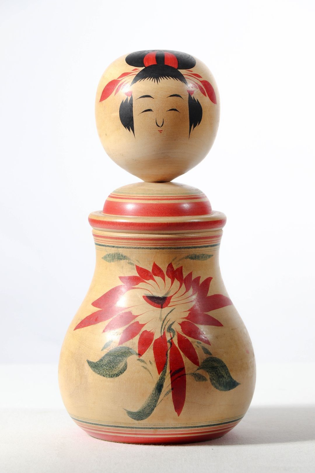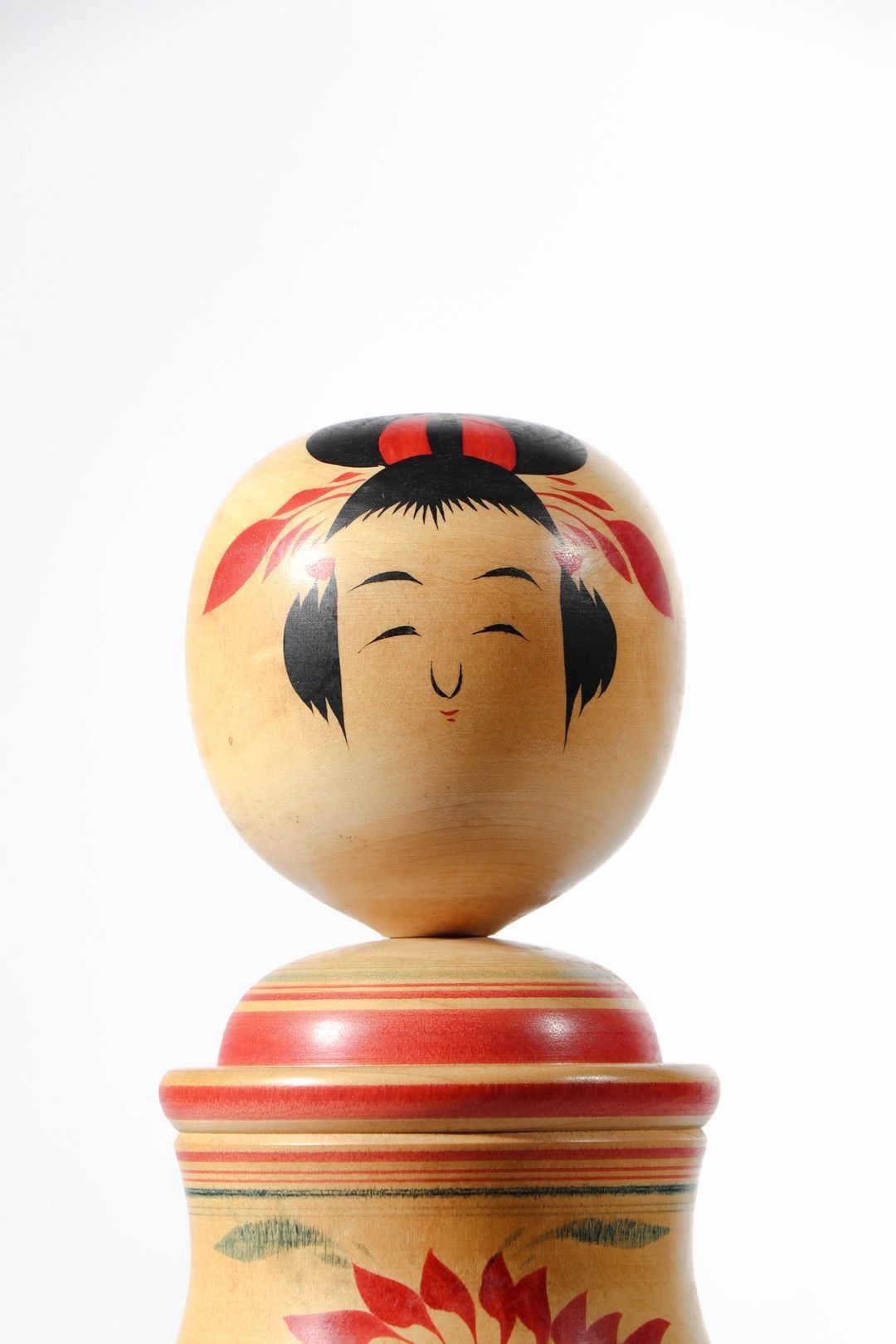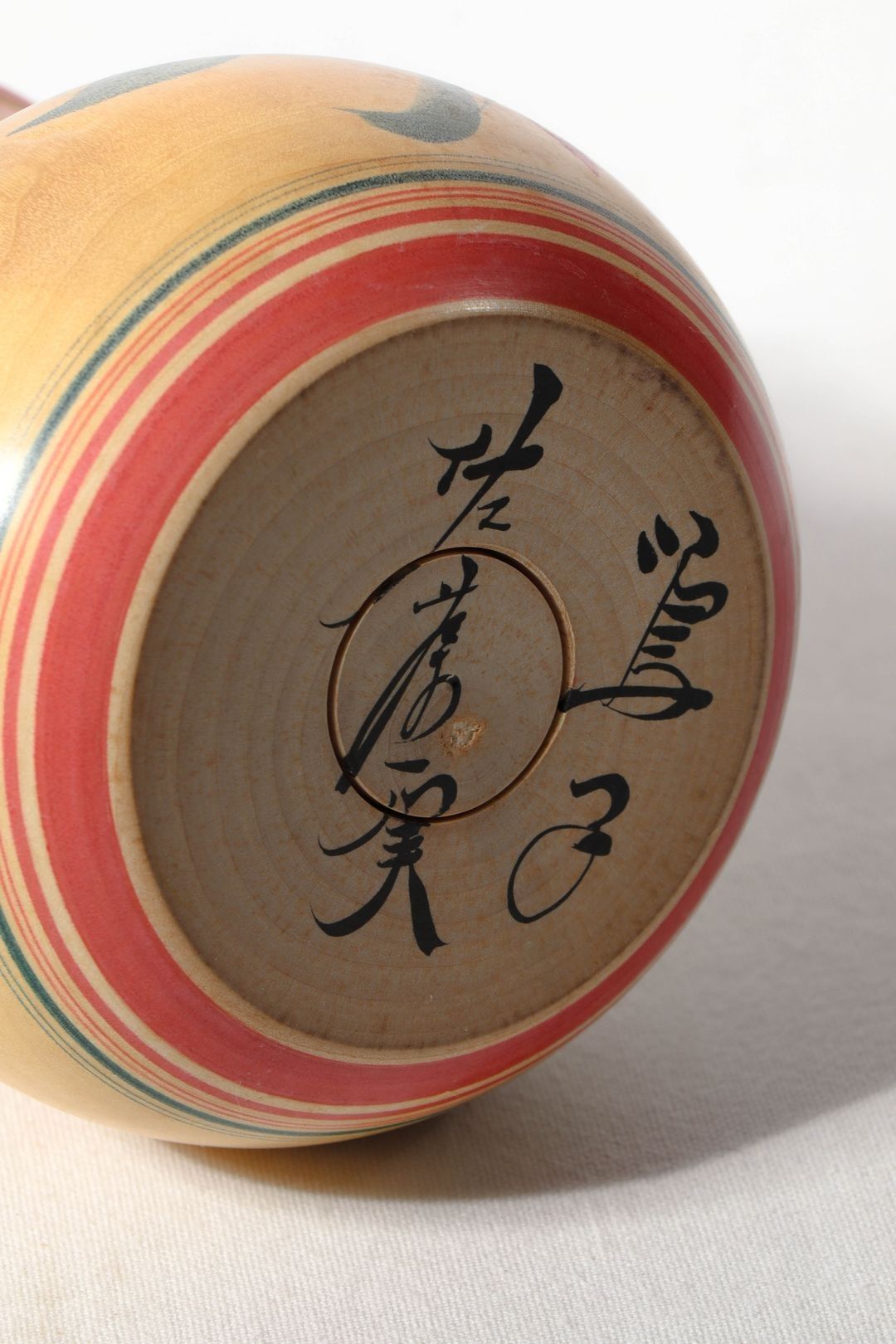 Naruko "Ejiko" Kokeshi doll (child in basket) in polychrome wood by Sato Minoru (1932-2021)