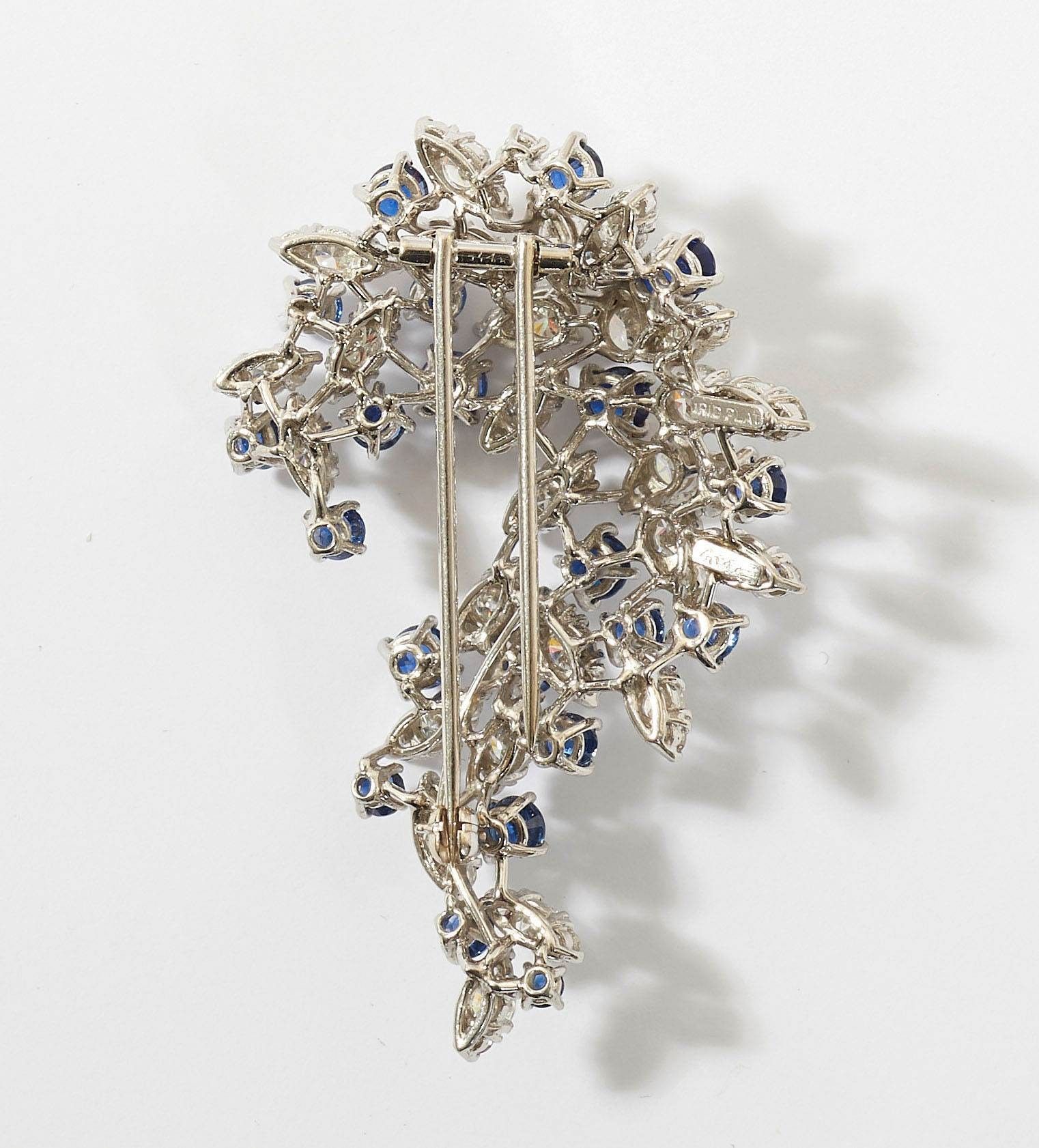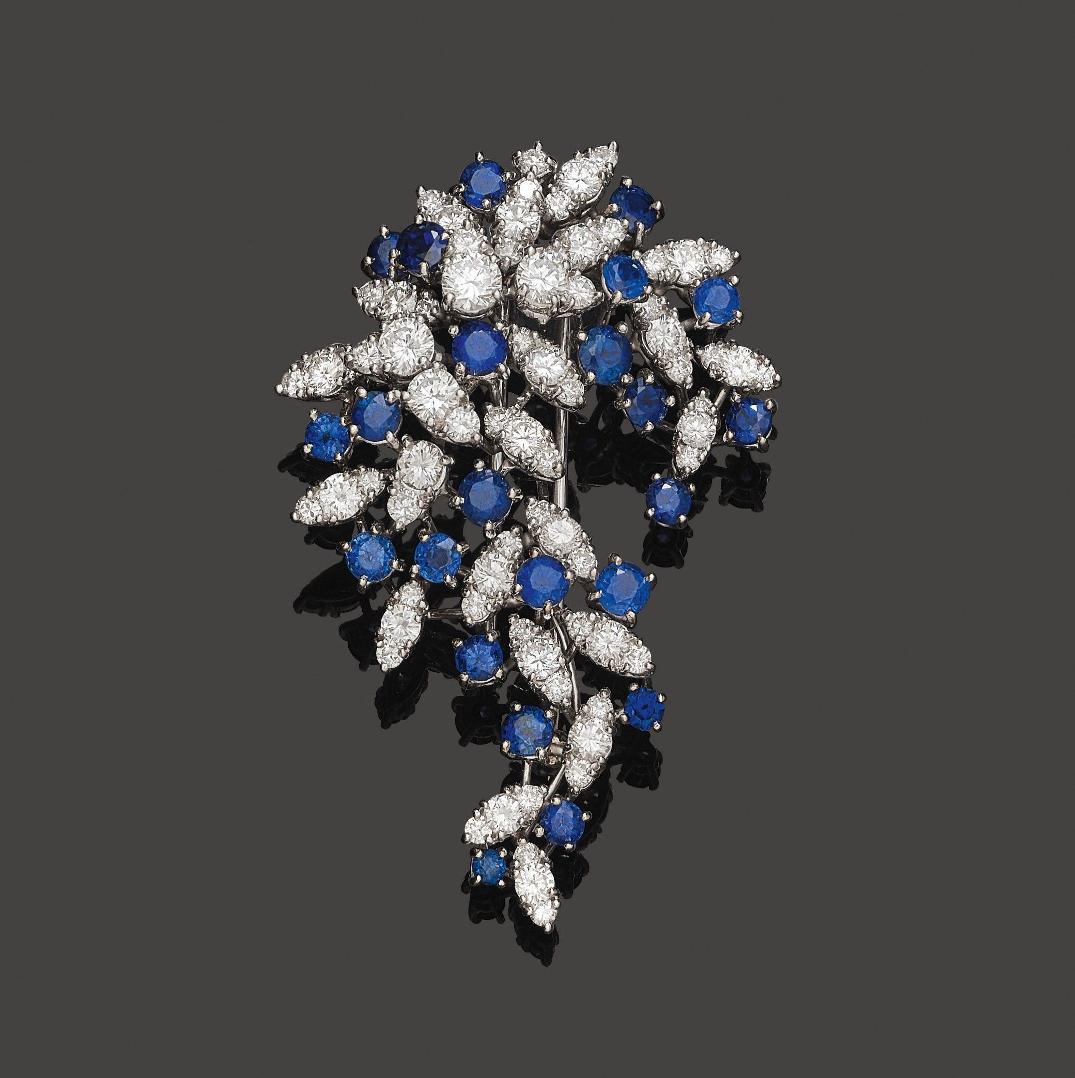 Set with 74 brilliant-cut diamonds totalling ca. 2.8 ct, of good quality, and 23 sapphires weighing ca. 2.0 ct. Engraved numbers 544? and 4011. Ca. 5.2 × 3.4 cm.
