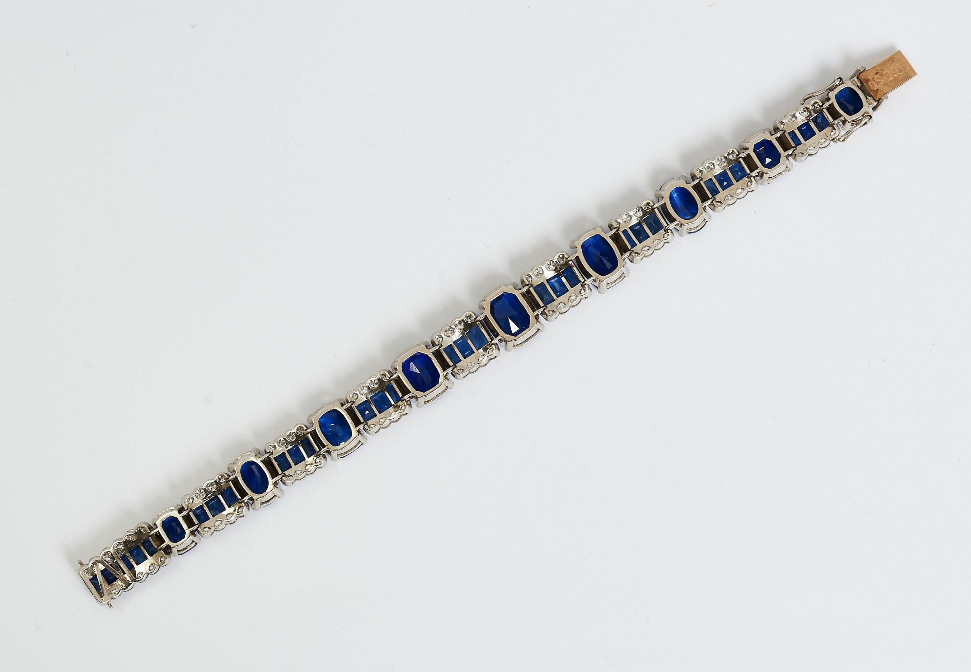 Set at the centre with 3 cushion-shaped sapphires of ca. 6.9 ct resp. 5.0 ct and 4.7 ct, probably Madagascar, unheated, 6 cushion-shaped sapphires weighing ca. 16.0 ct, probably unheated, and 29 sapphire carrés weighing ca. 8.5 ct resp. 76 brilliant-cut diamonds totalling ca. 1.5 ct. L ca. 17 cm.