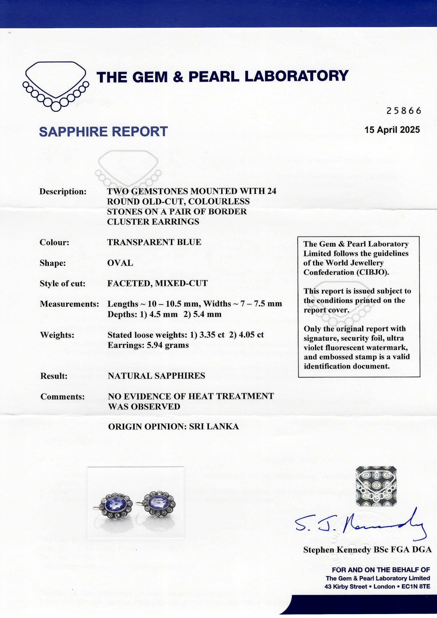 With verbal short test by GGTL for 1 sapphire, October 2025, and Gem & Pearl Laboratory report no. 25866, April 2025, for both sapphires, where they are described as unheated.