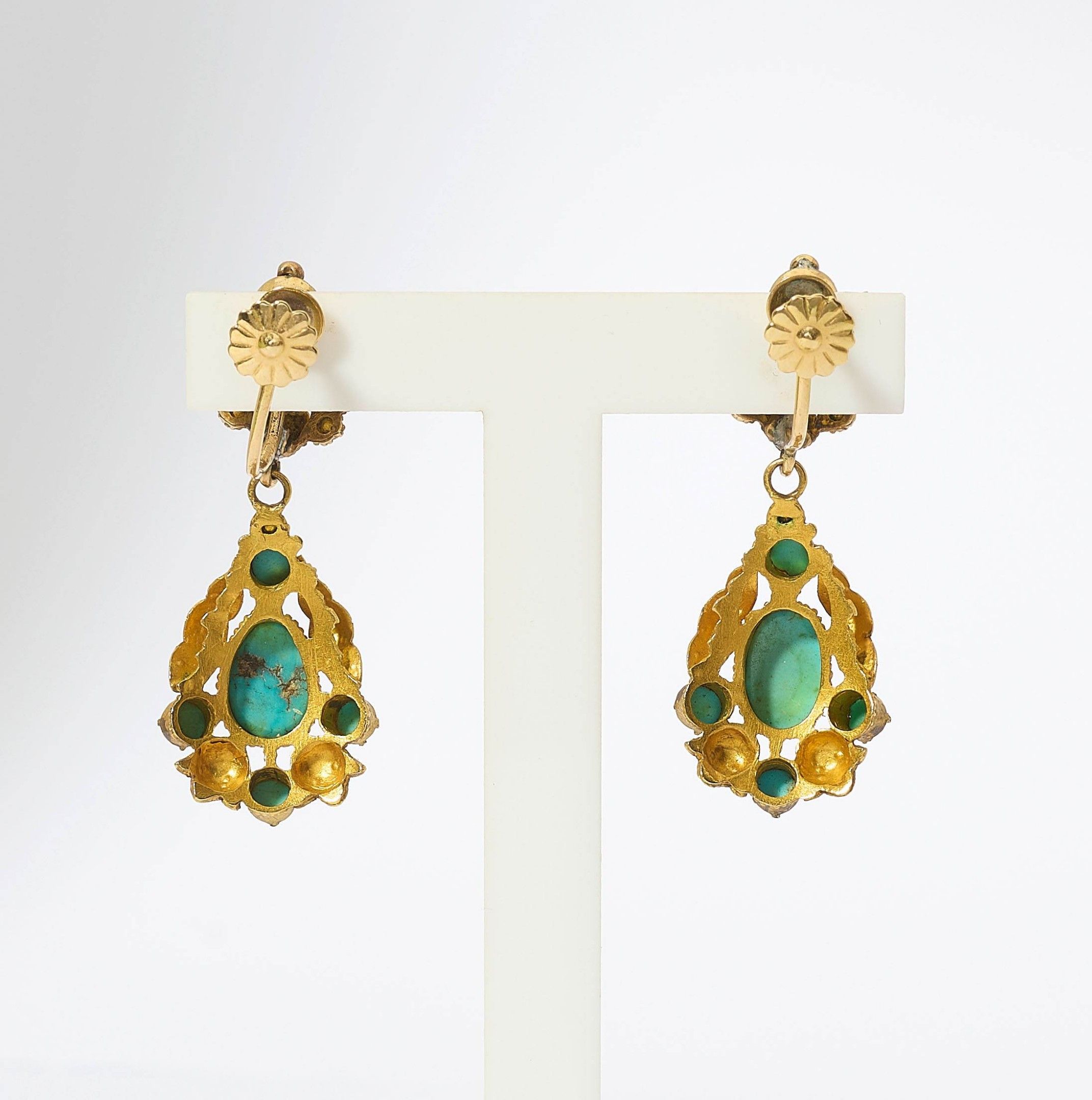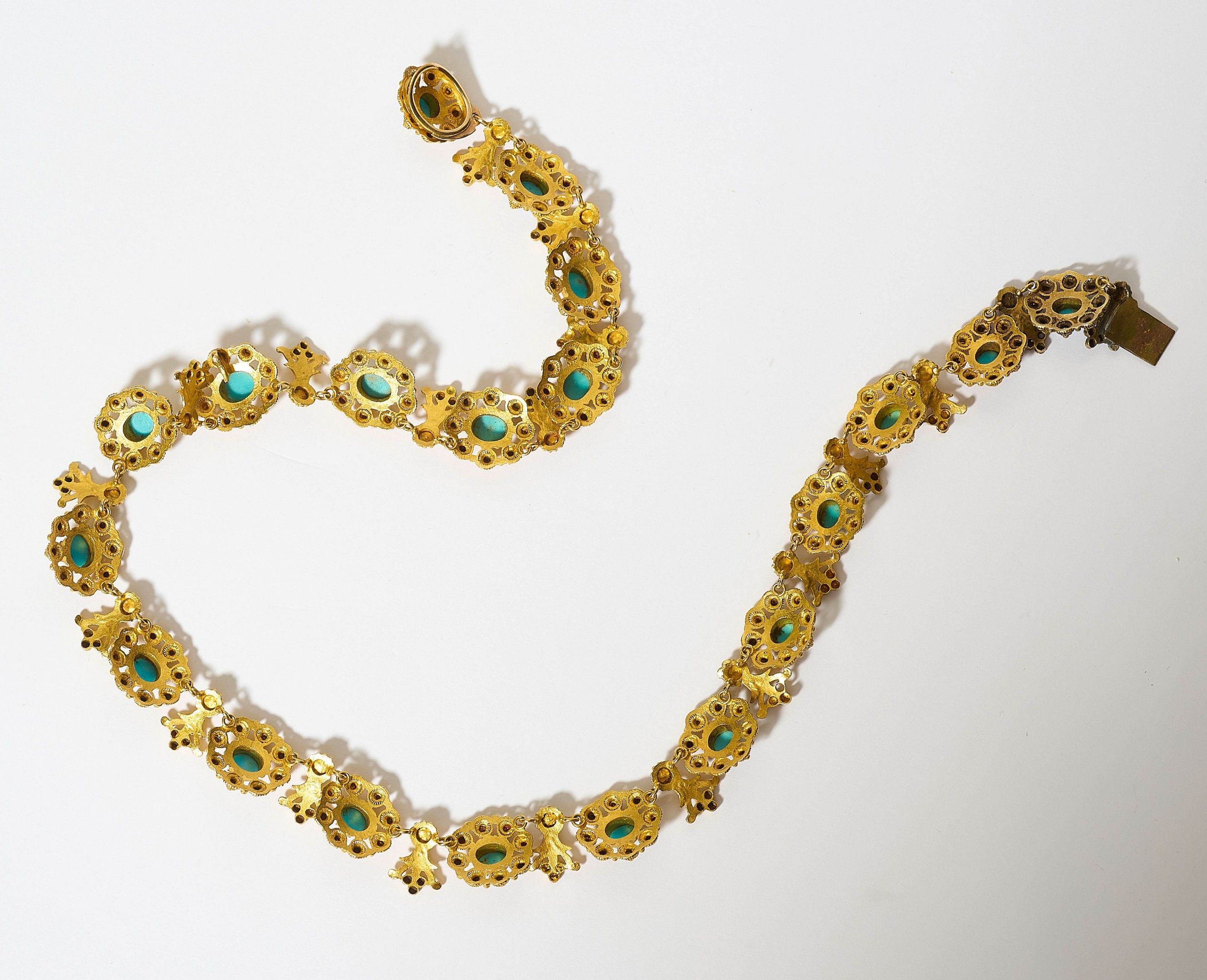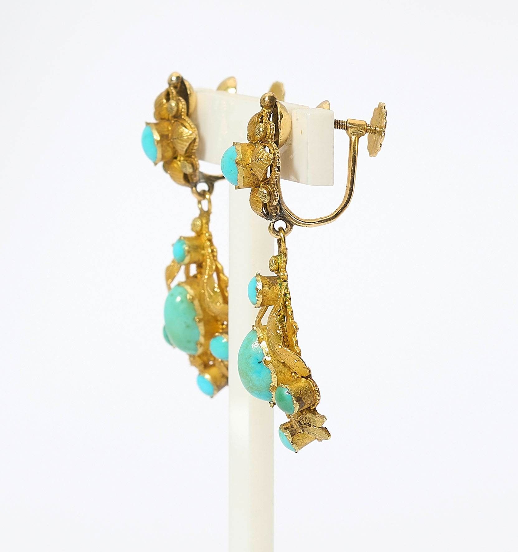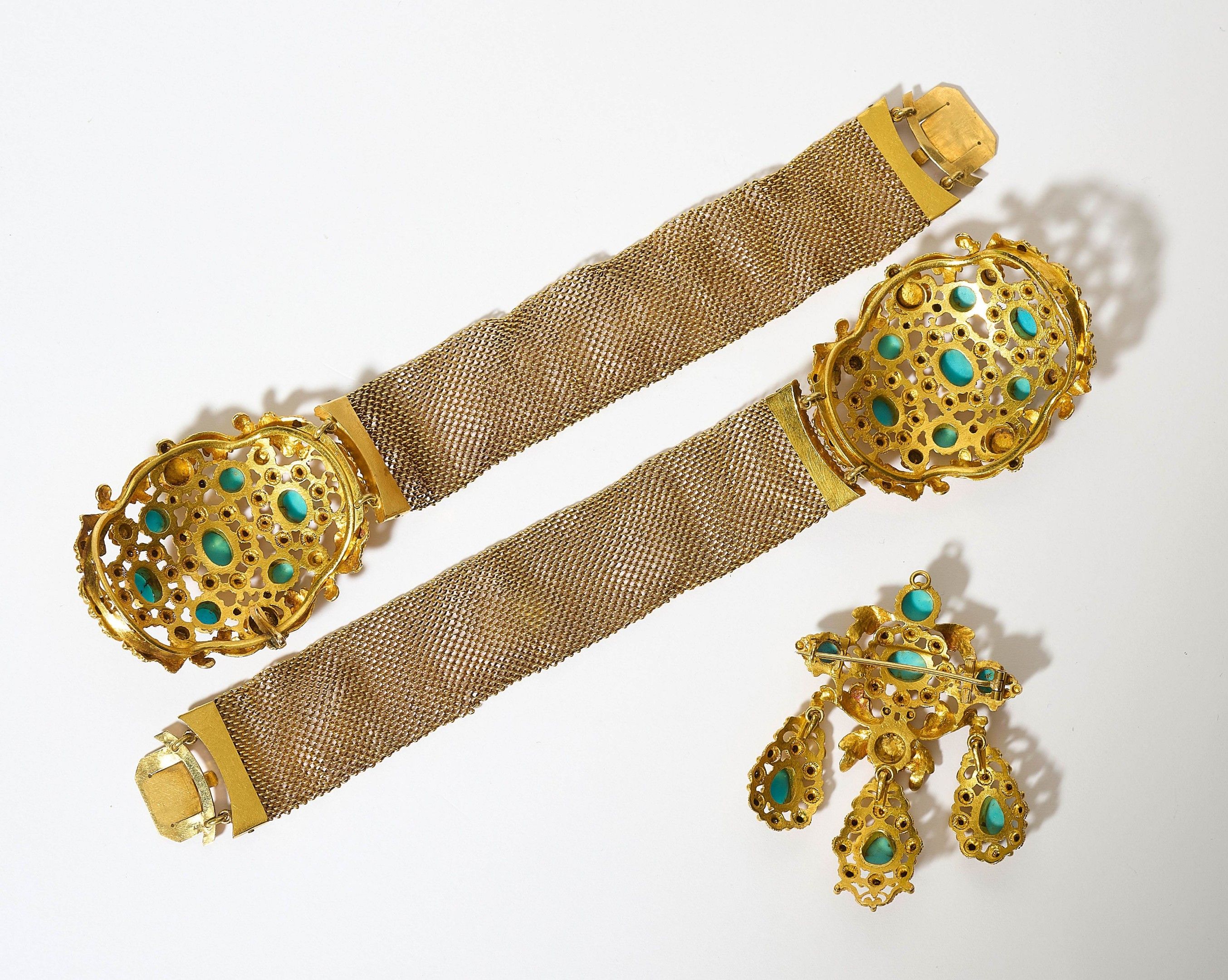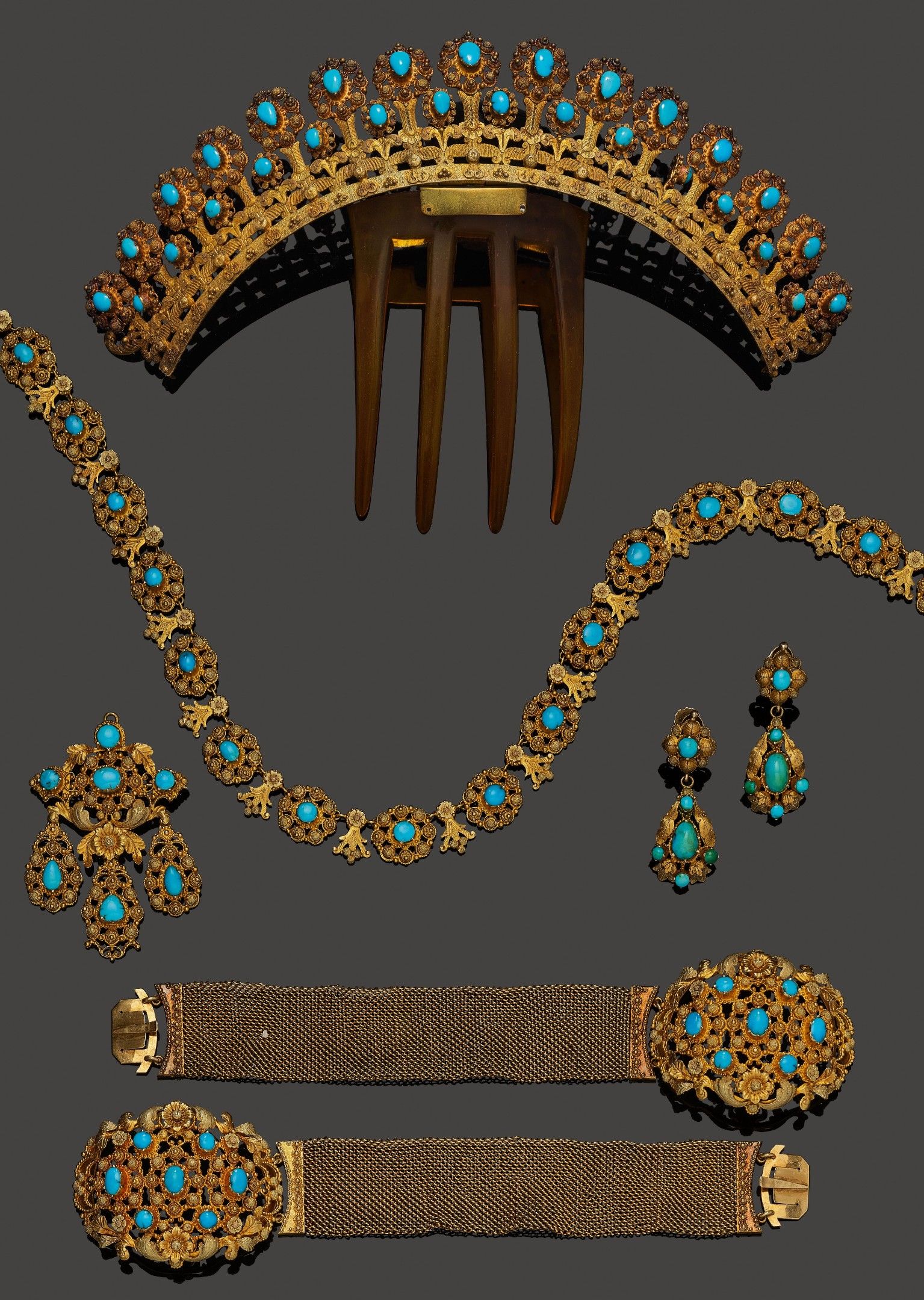 Parure comprising a tiara with attachable comb, 2 bracelets, a brooch, earrings and a necklace, each decorated with oval and round turquoise cabochons. Necklace L ca. 42 cm, bracelets L ca. 17.5 cm (gold mesh stretchable), brooch L ca. 5.5 cm, earrings L ca. 4.0 cm. Brooch with bail, also wearable as a pendant.