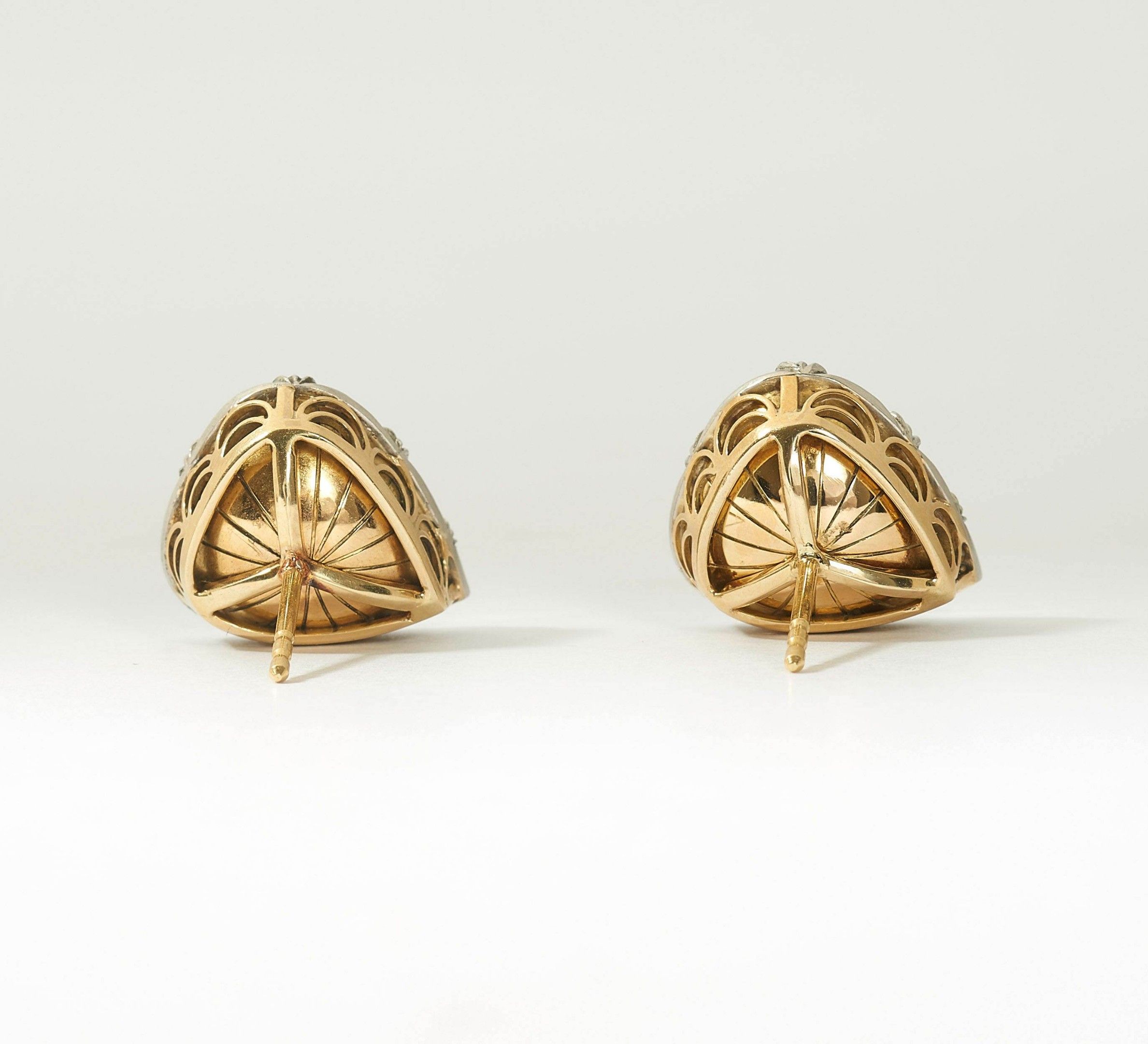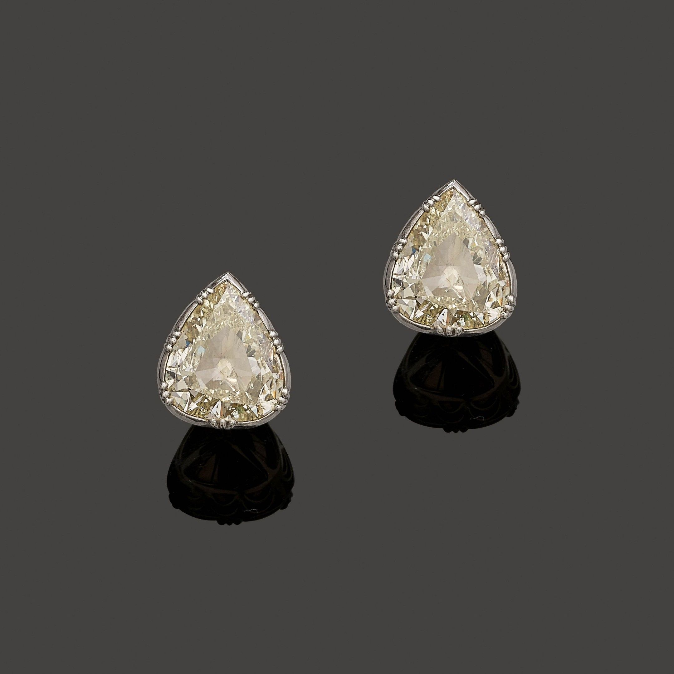 Set with pear-shaped–triangular diamonds in closed back setting and foiled. Each diamond ca. 6.4 ct, ca. O–P/I1, however difficult to determine due to the mounting style.