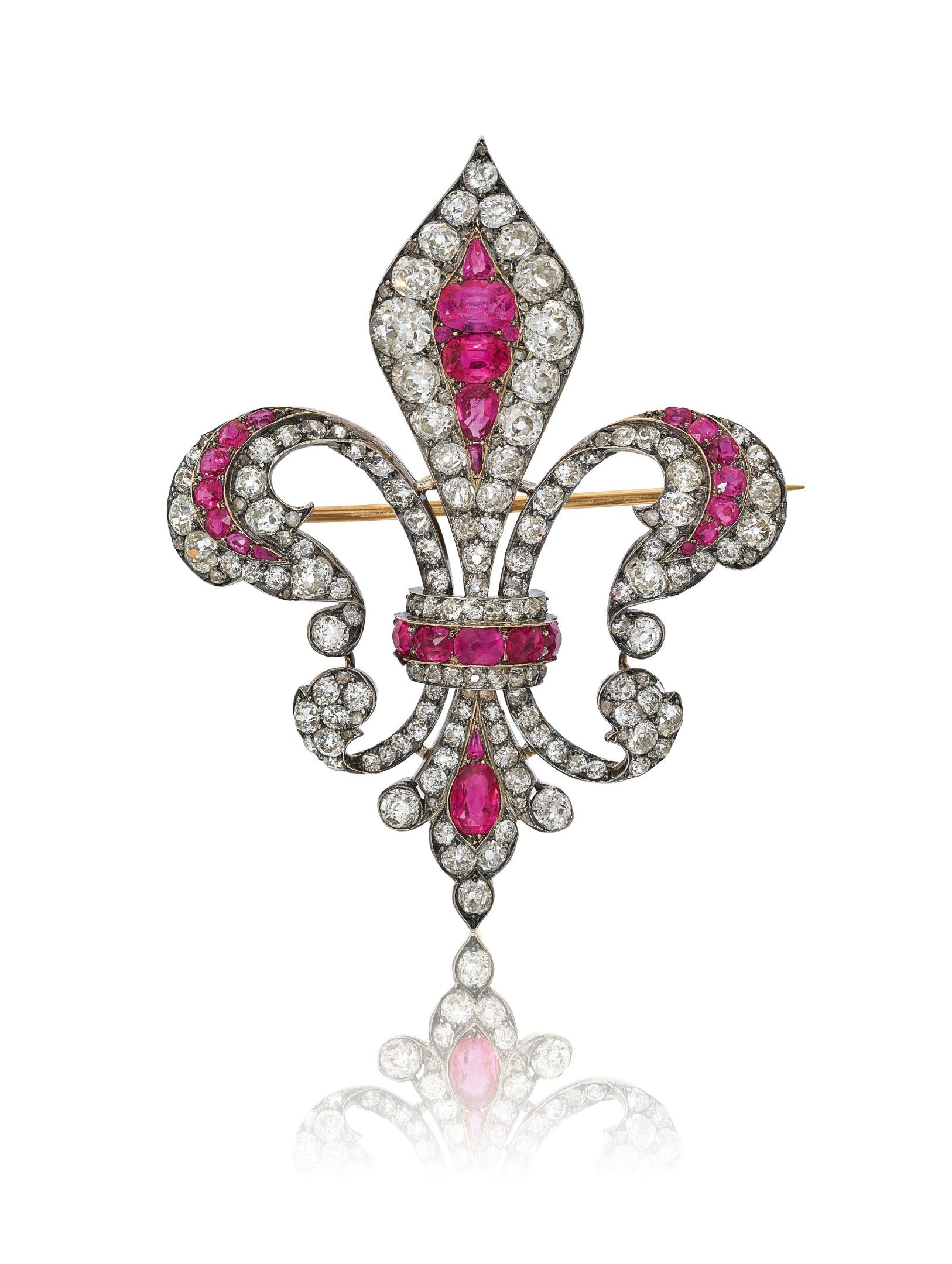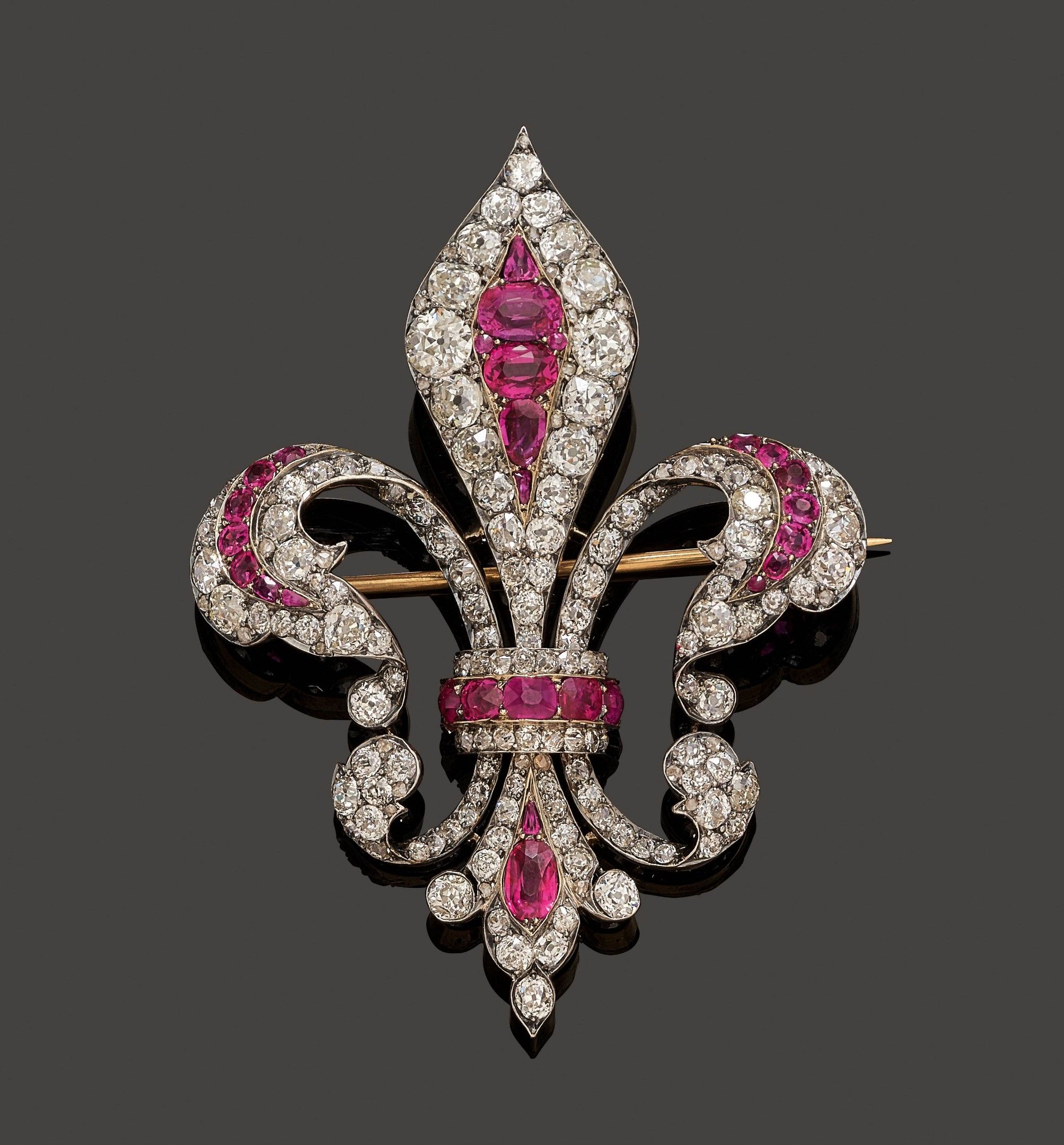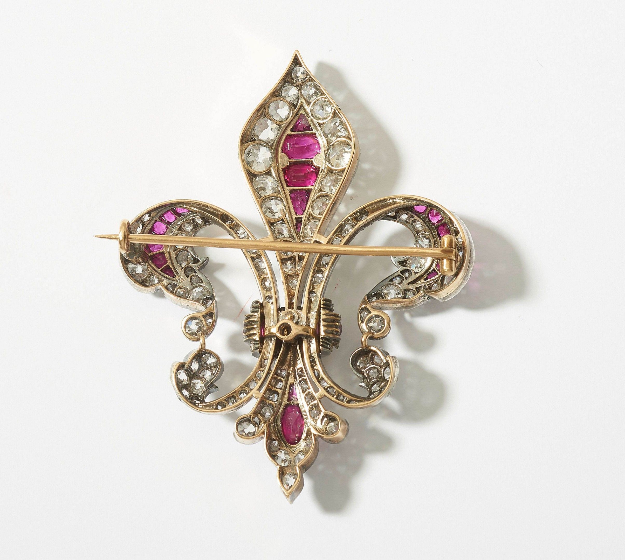 Very attractive brooch designed as a fleur-de-lis, decorated with oval, cushion-shaped and round rubies totalling ca. 2.0 ct, Burma, unheated, and decorated with circular-cut diamonds totalling ca. 7.0 ct. Rubies and diamonds of high quality. Screw mechanism at the back, probably intended to attach the brooch as an element of another jewel. Ca. 6.8 × 4.9 cm.