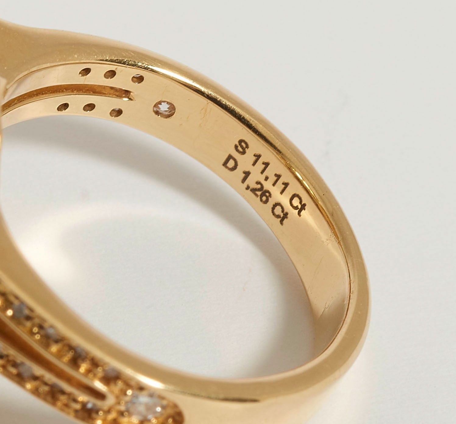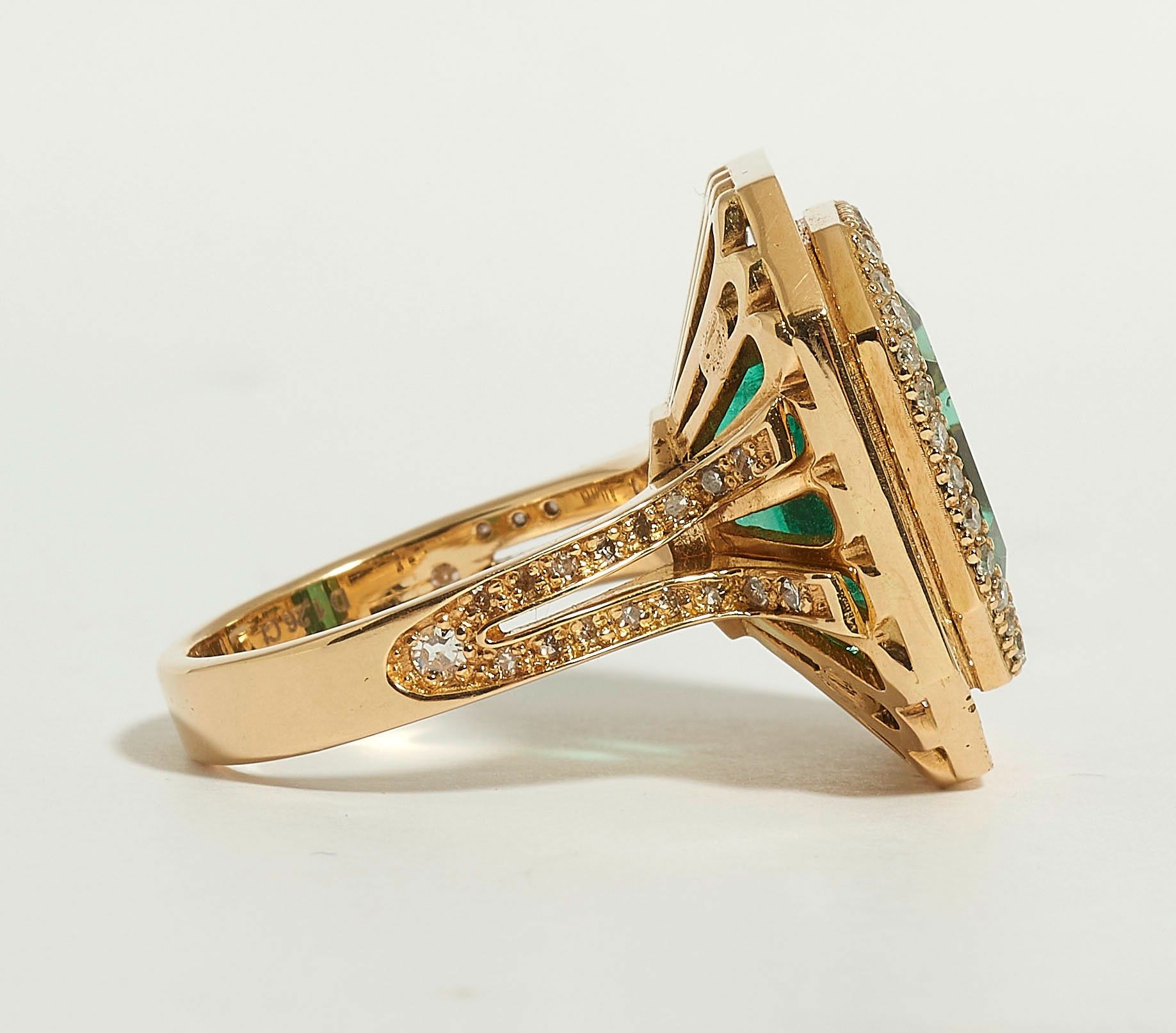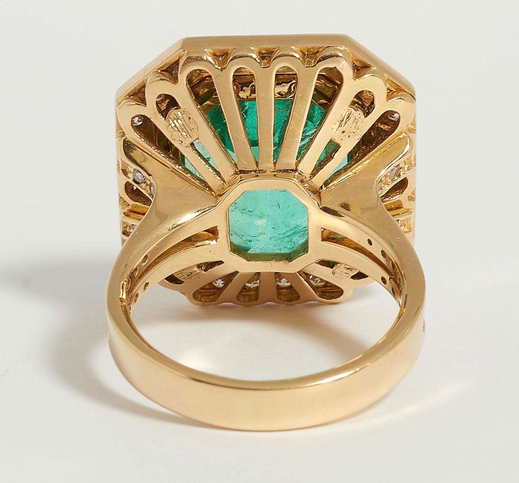 Set with 1 octagonal emerald of 11.1 ct, Colombia, minimally to moderately oiled, the surround and shoulders decorated with single-cut diamonds totalling 1.26 ct. Diamond weights engraved. Size ca. 55.
