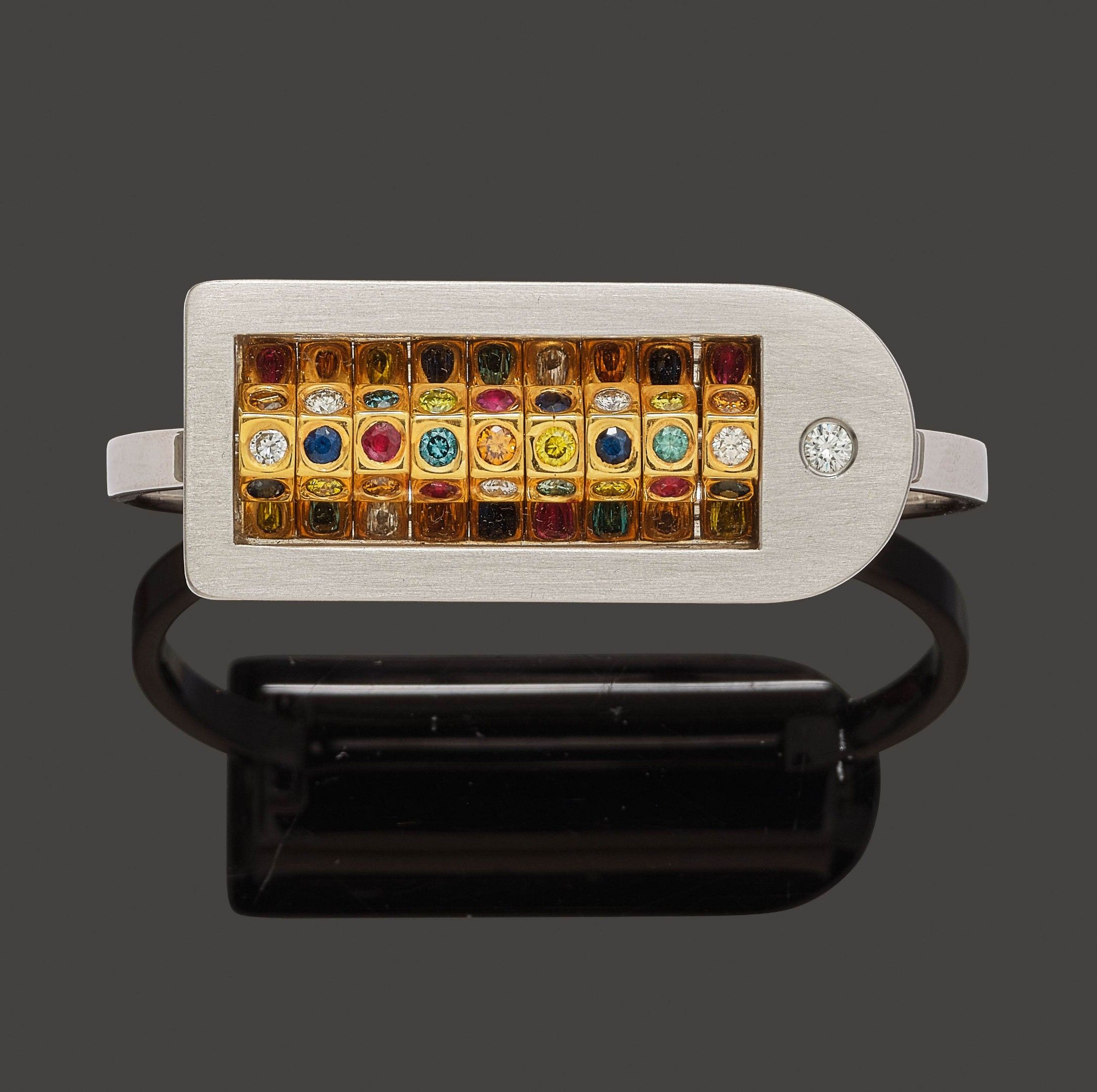 Bangle set with freely rotating gemstones including diamonds, rubies, sapphires, topazes, citrines and others, creating a dynamic play of colour. Accented by 1 brilliant-cut diamond of ca. 0.1 ct. Inner diameter ca. 5.5 × 3.8 cm.