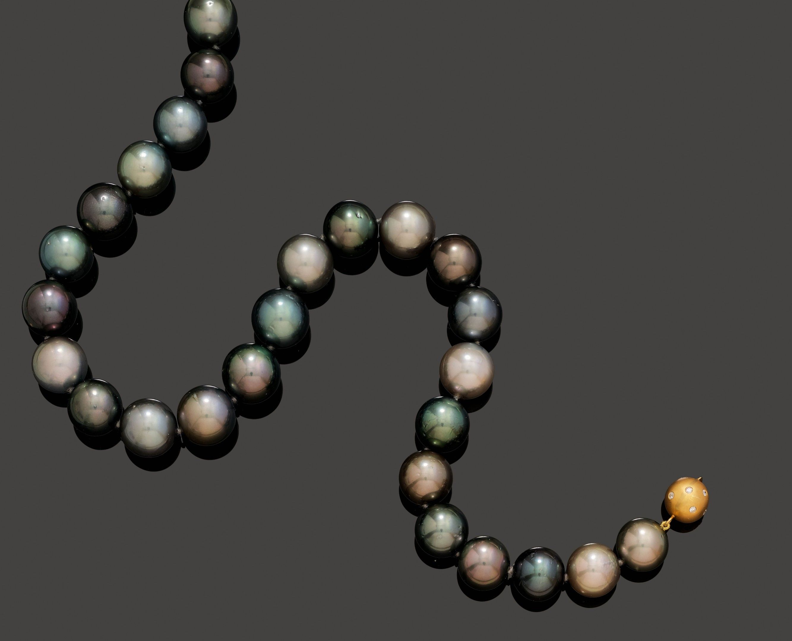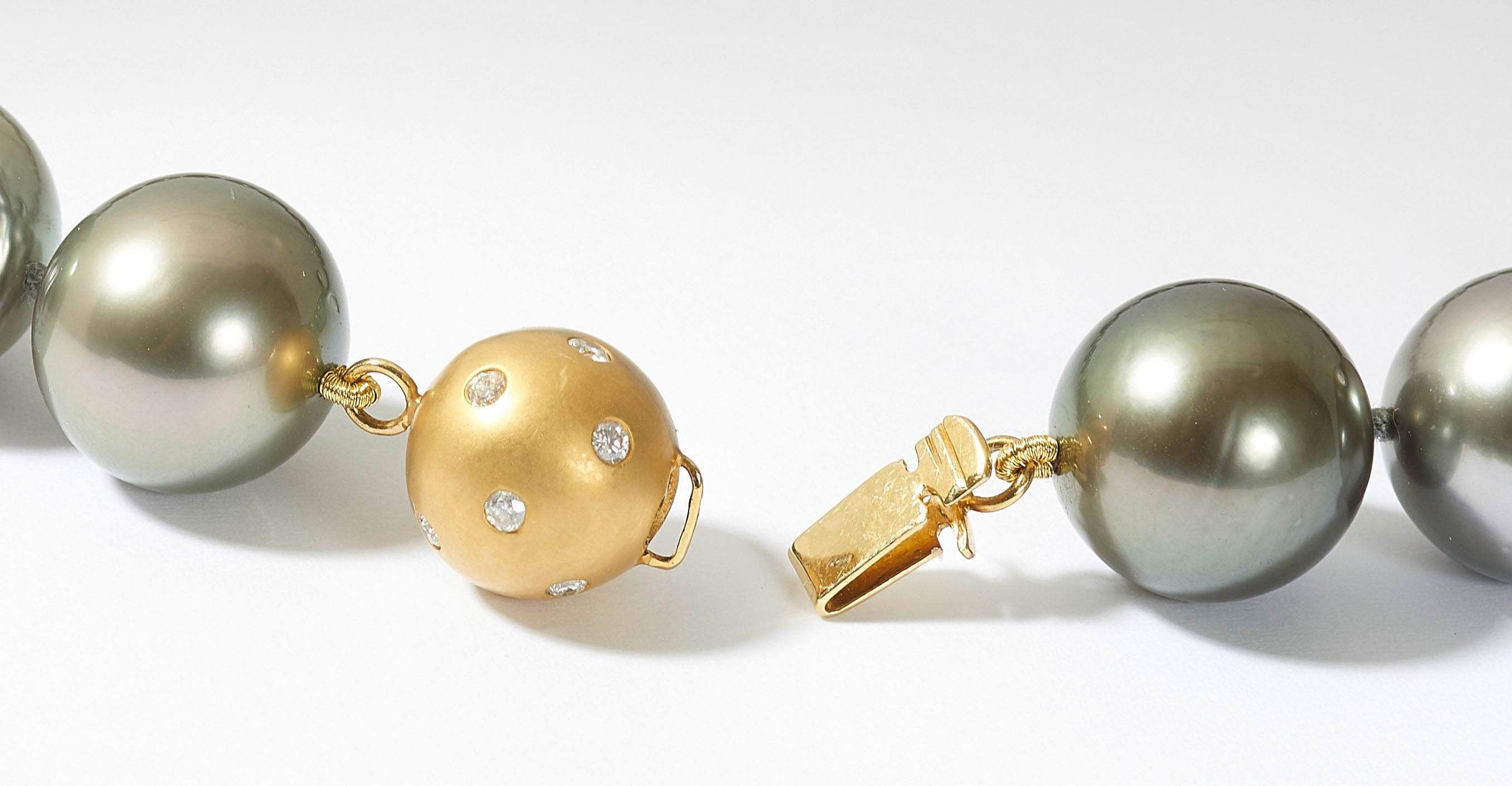 Necklace composed of graduated round Tahiti cultured pearls of 14.0 – 15.6 mm Ø, of silvery black colour. Clasp decorated with brilliant-cut diamonds totalling ca. 0.3 ct, diamond weight engraved. L ca. 46 cm.