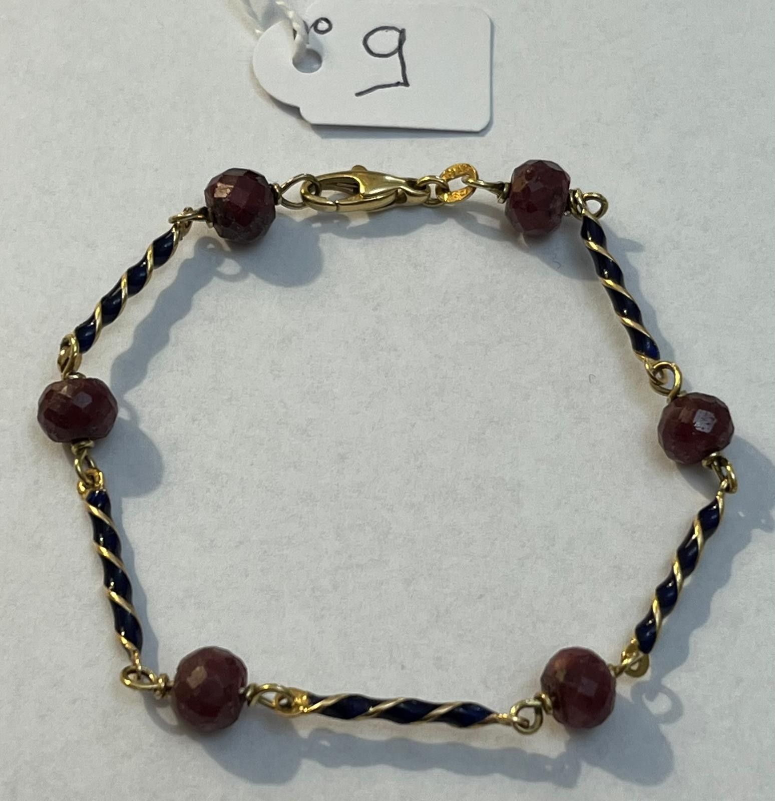 Bracelet in 18K yellow gold 750 thousandths and blue enamel, enhanced with 6 faceted ruby pearls, weighing ~ 6cts. 8.7g