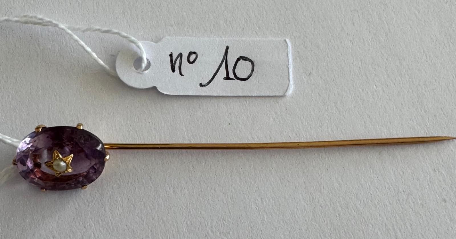 Pin in 18K yellow gold 750 thousandths, design set with an amethyst enhanced by a 1/2 fine pearl, 7.2cm. 3,8g
