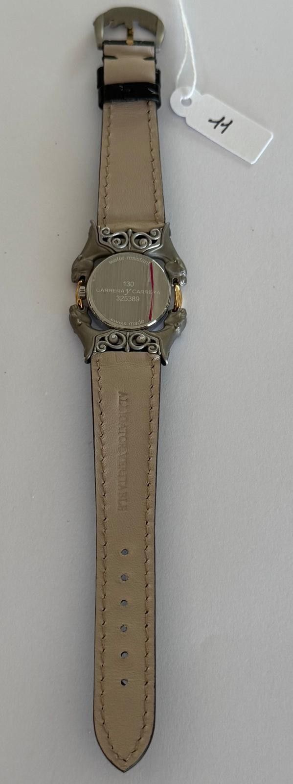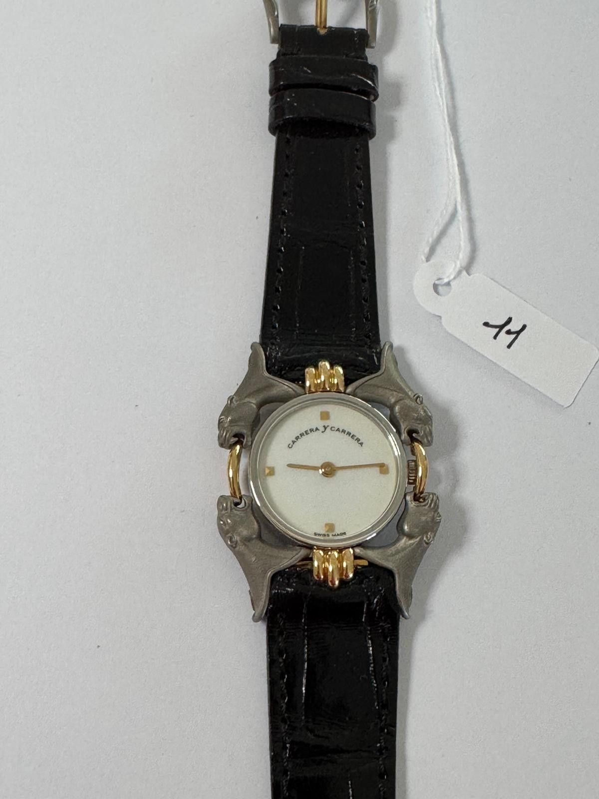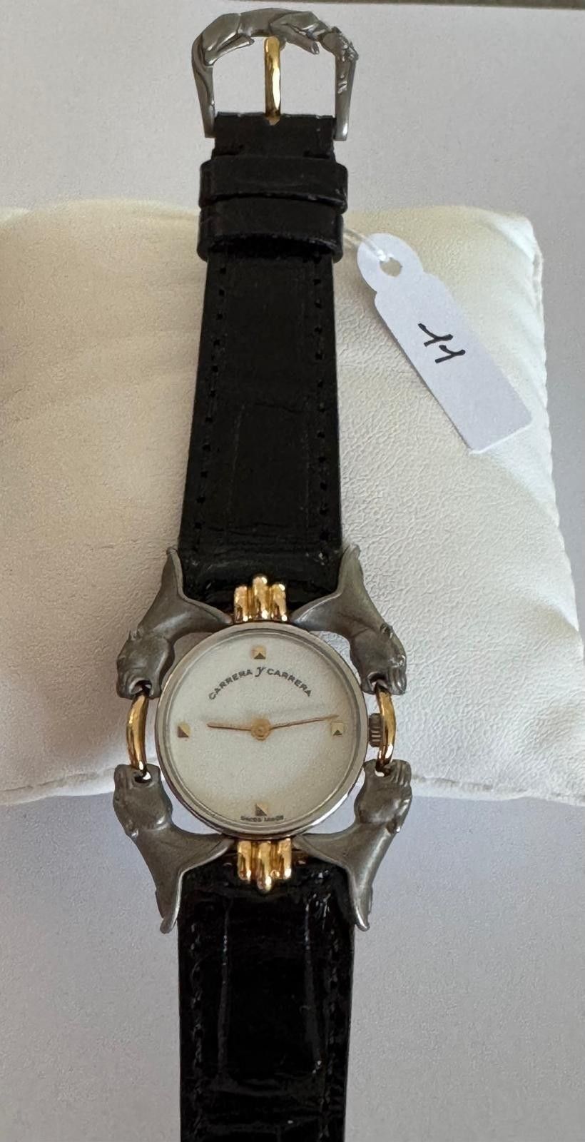 Gold-plated and satin-finished steel watch, signed - CARRERA Y CARRERA - with Panther motifs, Quartz movement / Black alligator strap with buckle signed CARRERA Y CARRERA / n° 130 / 325389 - 25,9g ( Near mint condition )