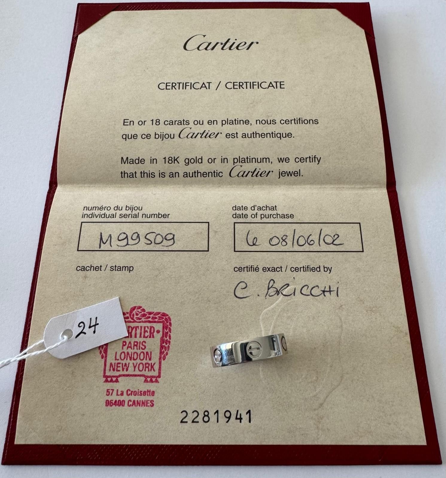 Ring in platinum 850 thousandths, signed - CARTIER - LOVE model - n° M 99509 - TDD / 58 - 10,3g ( Superb Condition / with CARTIER Certificate dated 2002 )