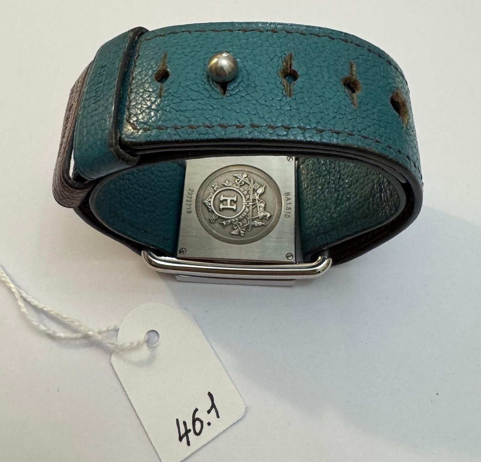 Steel watch, signed - HERMÈS - BARENIA - 32mm X 25mm - White caseback, Date at 3 o'clock, Reversible Blue and Brown leather strap, signed Hermès, n° BA1.510 / 2272719 - 44,g ( Super Condition )