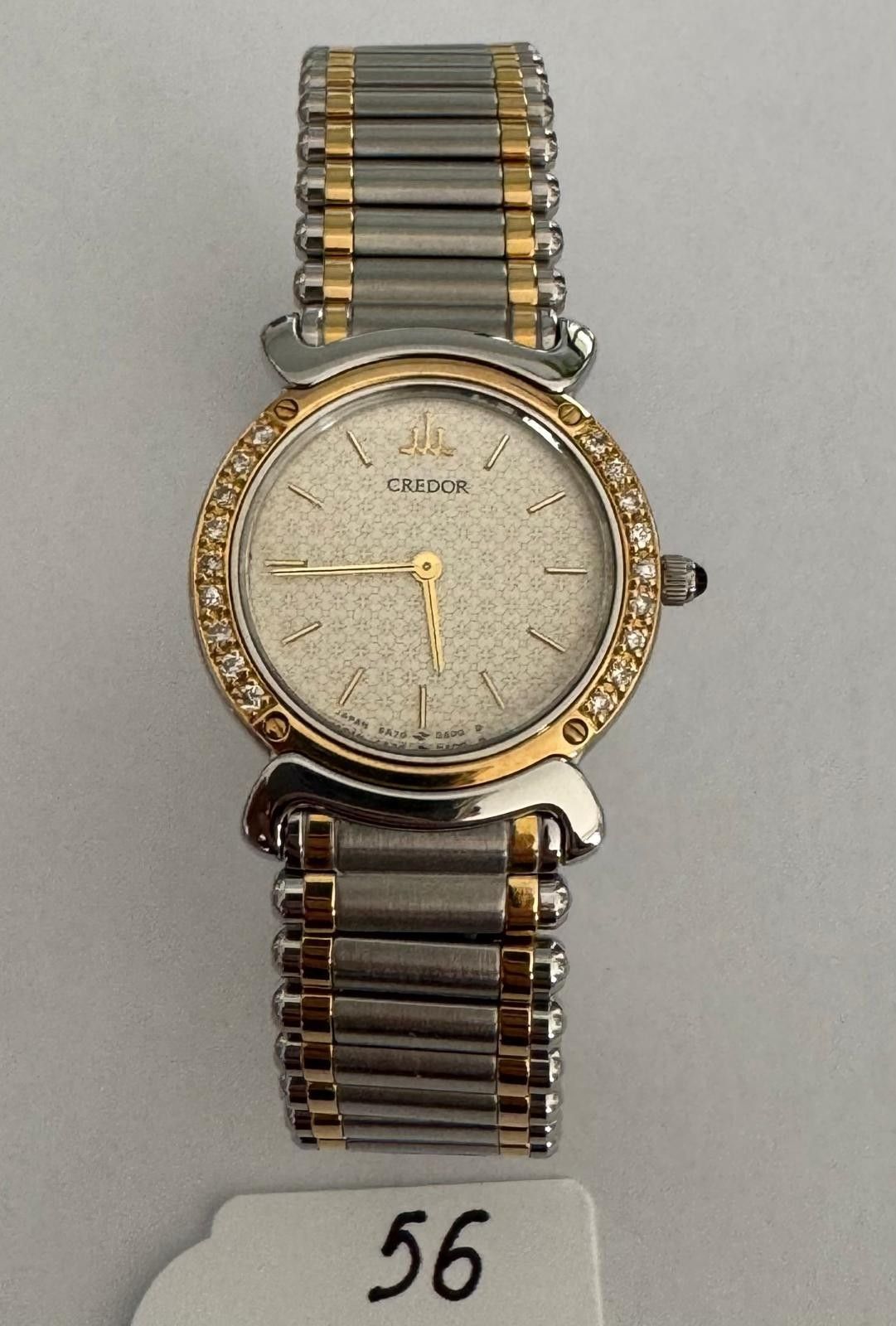 Gold and steel watch, signed - SEIKO - CREDOR - Ø 23mm - Bezel set with 18 brilliant-cut diamonds, gold index, winding mechanism set with a black onyx cabochon, butterfly clasp signed, n° 5A70 - 02210 / 152331 - 45,5g ( Very good Condition )