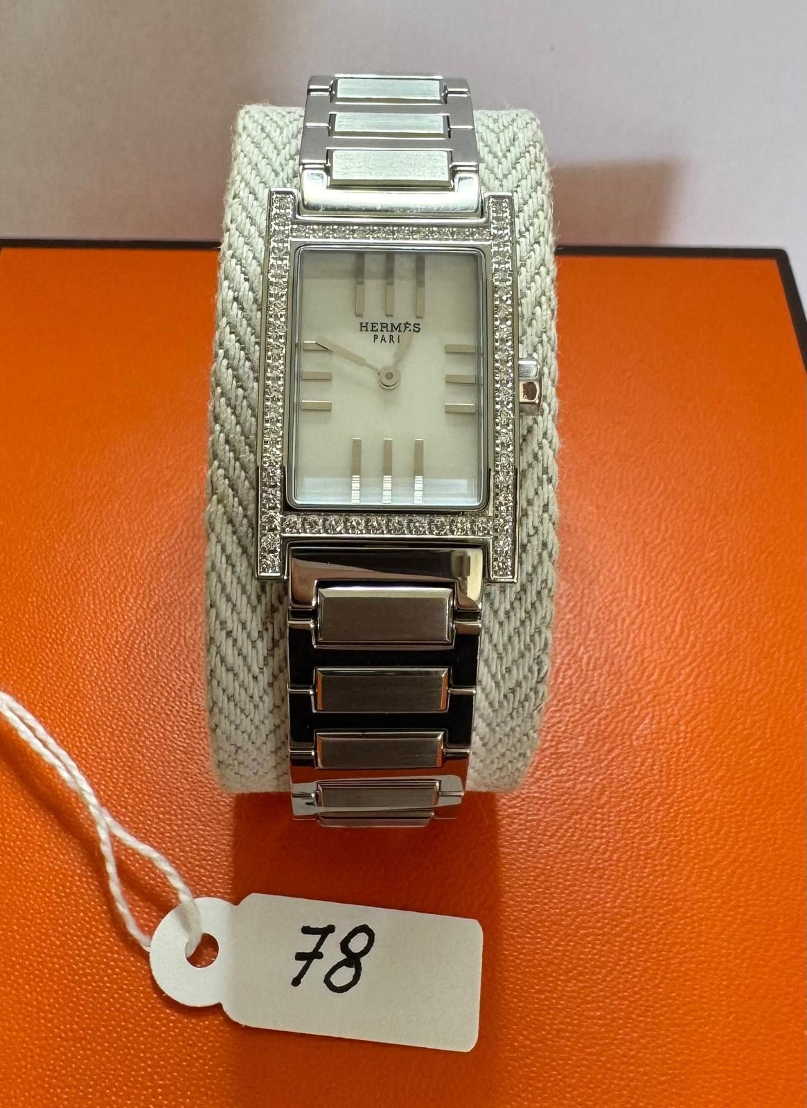 Steel watch, signed - HERMES - TANDEM - Dial entirely set with 58 beautiful brilliant-cut Diamonds for ~ 0,70ct - F to G (Extra White) / V.V.S - 50mm X 30mm - Mother-of-pearl caseback, Quartz movement, Steel bracelet with folding clasp / n° TA1. 231.222.2645 - 18cm wrist circumference - 62,7g ( With Hermès Case and Certificate )