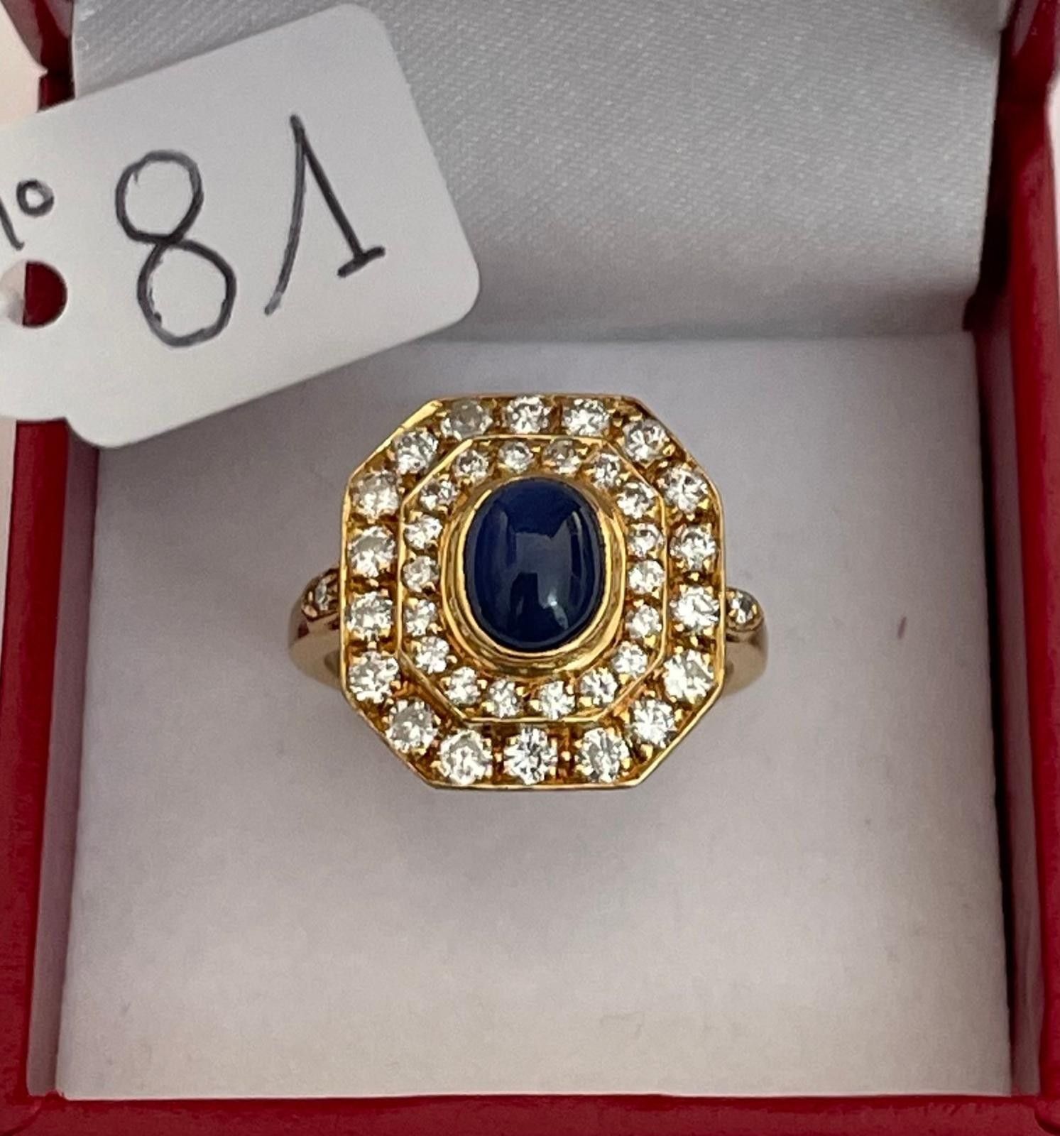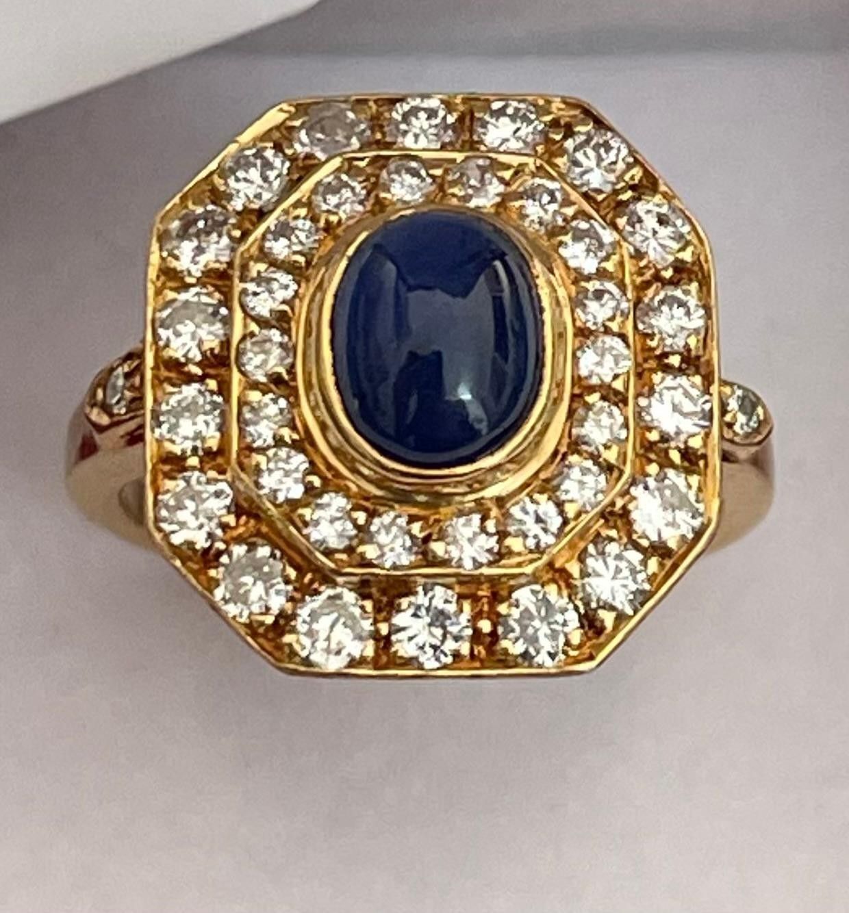 Pompadour ring in 18K yellow gold 750 thousandths, set with a beautiful cabochon of Ceylon sapphire ~ 1.40ct in a double surround of 38 brilliant-cut diamonds - H / V.S - for ~ 1.40ct - TDD / 54.5 - 6.1g