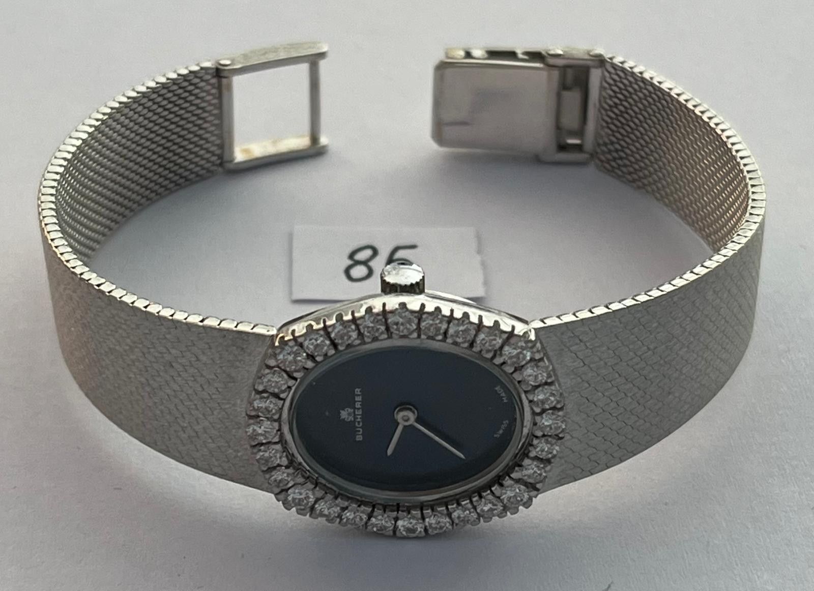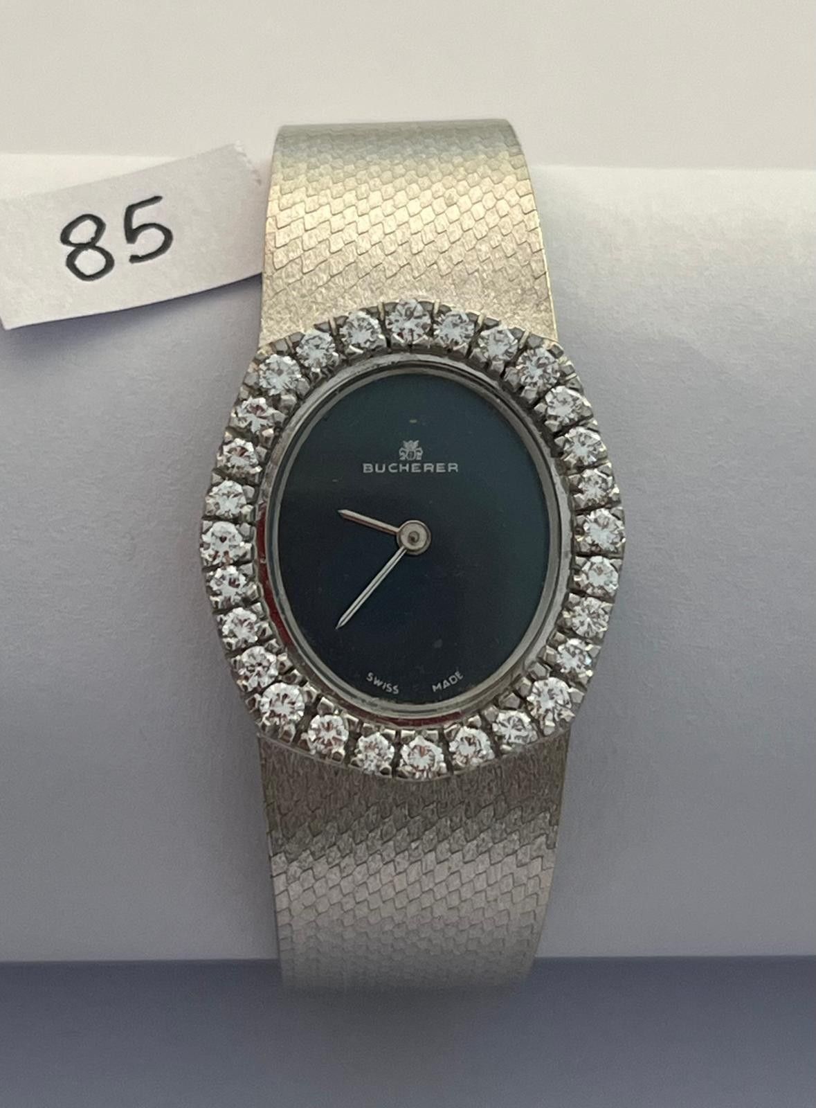 Ladies' watch in 18K white gold 750 thousandths, signed - BUCHERER - Dial entirely set with 28 beautiful brilliant-cut diamonds, for ~ 1.40cts - F to G / V.V.S - Mechanical movement, delivered with original papers from 1975 n° 457 405 - Size 16cm to 16.5cm - 49.9g ( Very Good Condition and Works Perfectly )