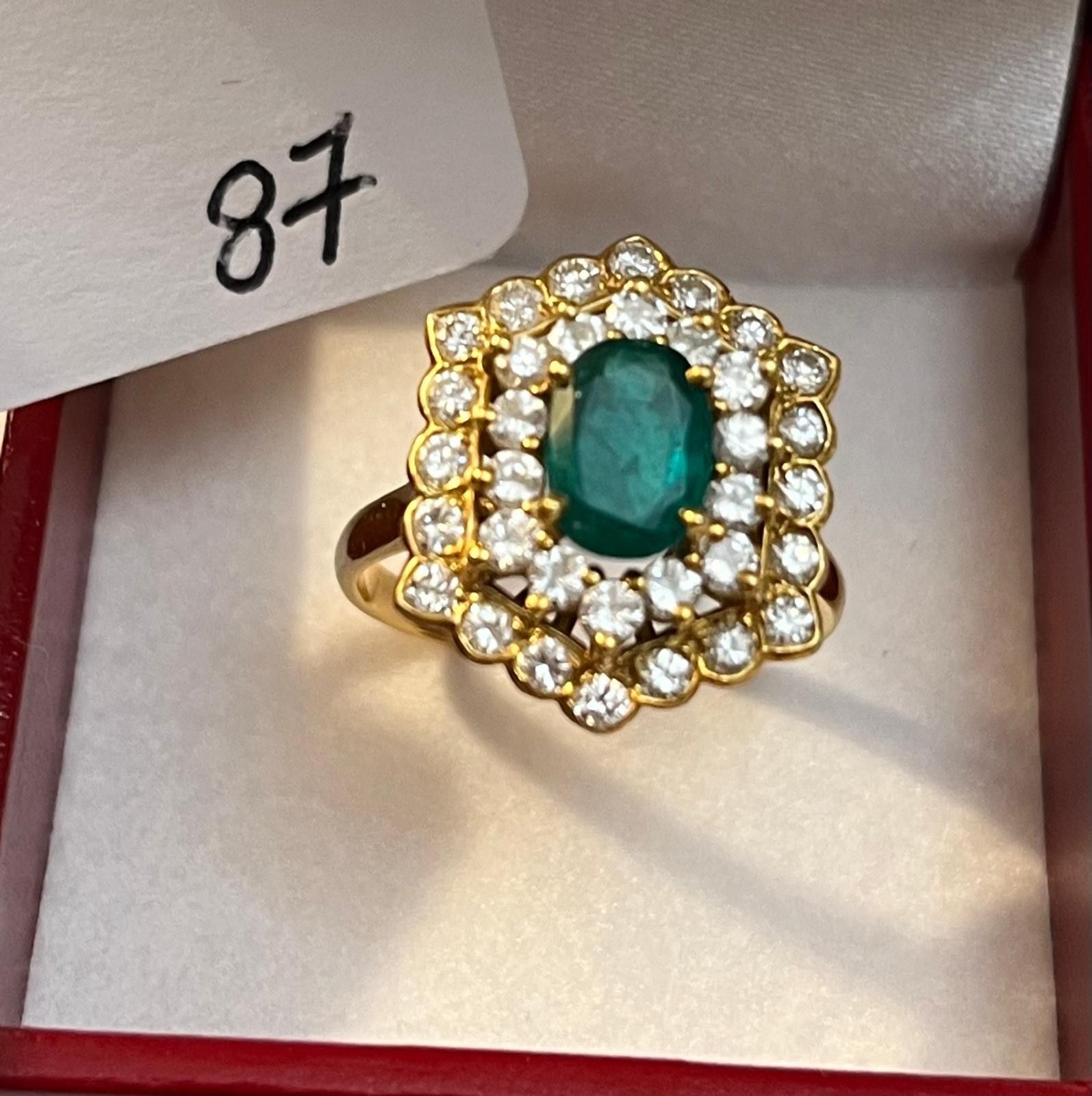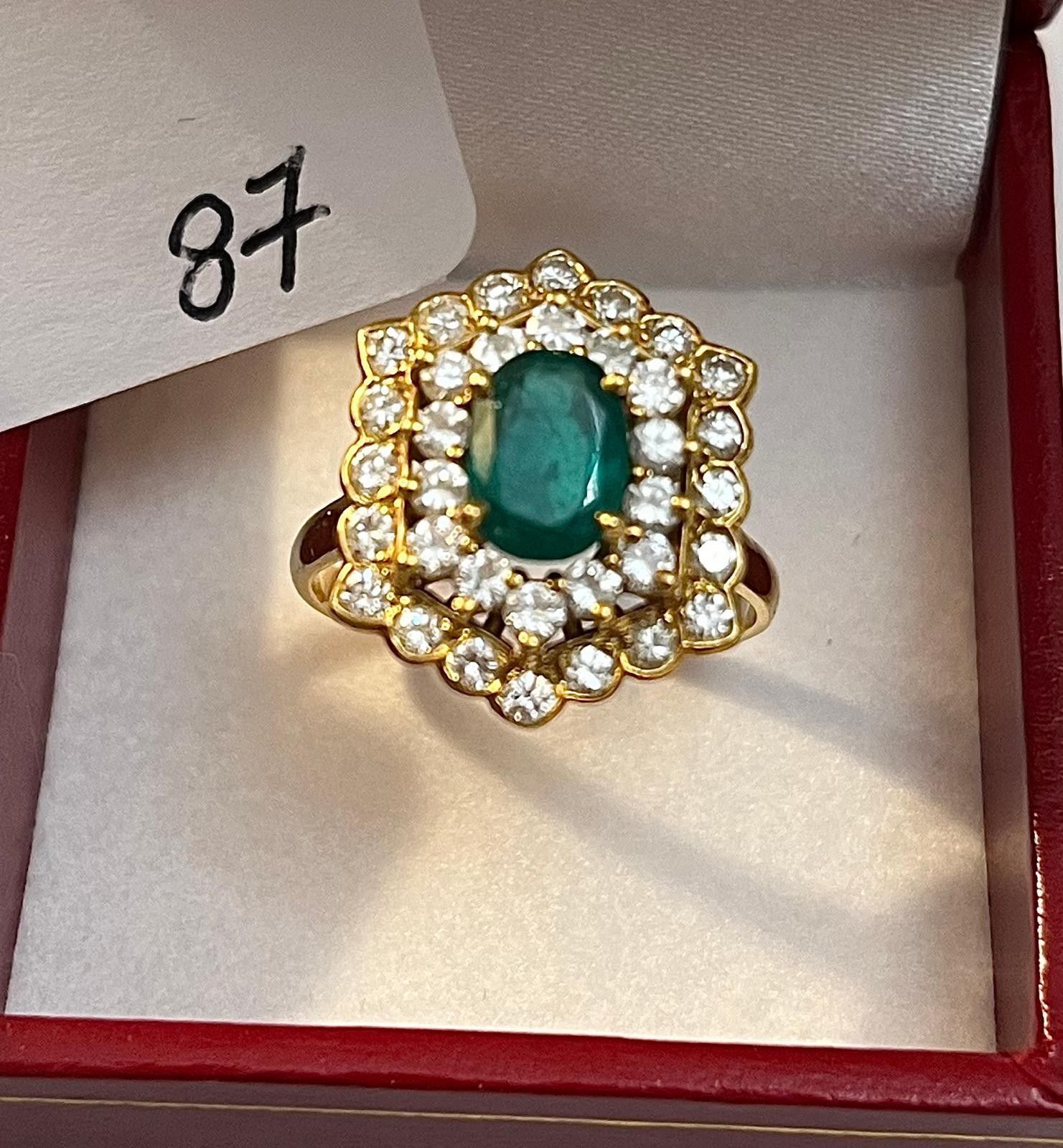 Ring in 18K yellow gold 750 thousandths, set with a beautiful oval emerald ~ 1.40ct, in a double surround of beautiful brilliant-cut diamonds, for ~ 1.30ct - G / V.S - TDD / 56 - 5.3g