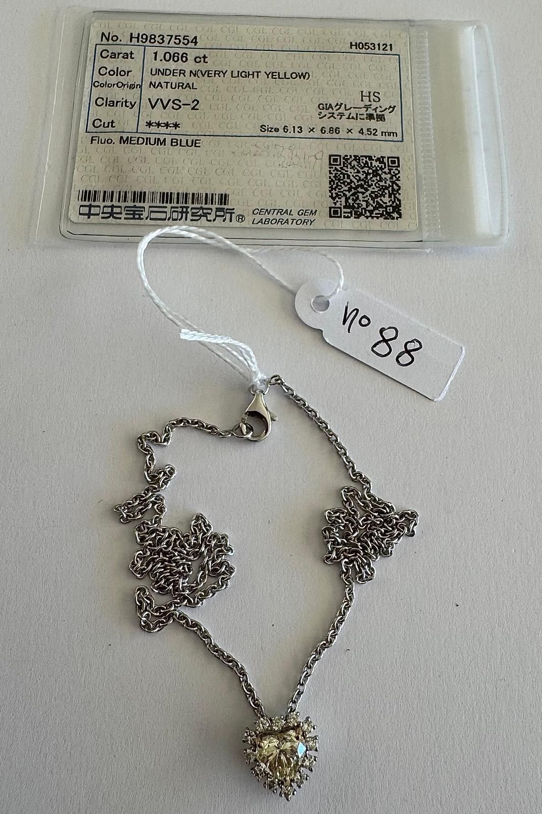 18K 750 thousandths white gold Forçat chain, supporting a Platinum and Yellow gold "Heart" pendant, set with a 1.066ct Very Light Yellow / V.V.S.2 Beautiful Heart-cut diamond with Certificate, surrounded by 12 brilliant-cut diamonds, weighing ~ 0.40ct - 6.3g