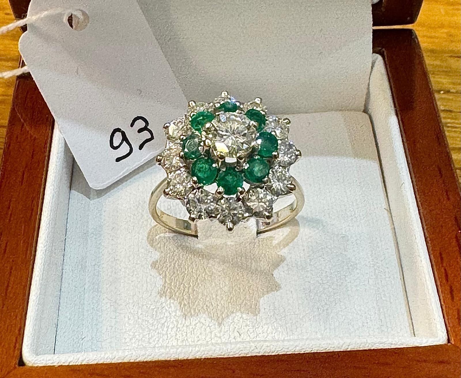 Marguerite" ring in 18K white gold 750 thousandths, set in the centre with a beautiful diamond of ~ 0.80ct - in a double setting of 8 emeralds ~ 0.64ct and 12 brilliant-cut diamonds, for ~ 2.60cts - H / V.S - TDD / 55 - 7.6g.