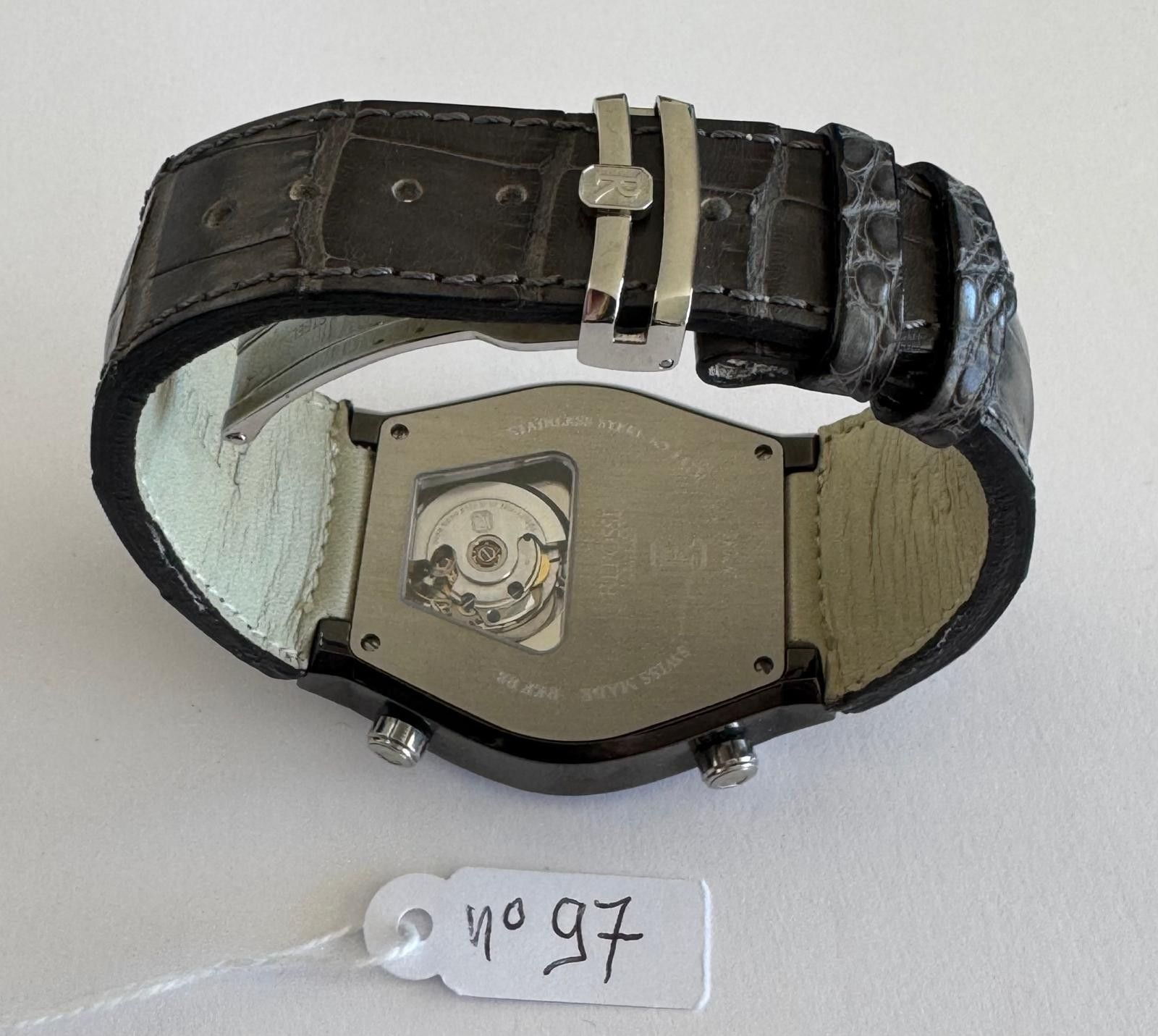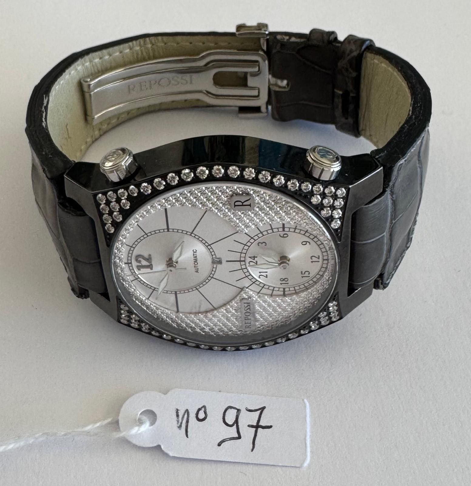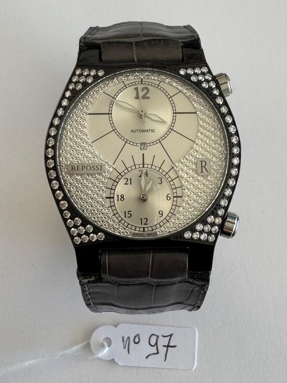 Pretty Automatic watch in steel, signed - REPOSSI - R.8 MONACO - 48mm X 40mm - Silver guilloché caseback - Framing set with 62 beautiful brilliant-cut diamonds - F / V.V.S ~ 1,20ct - Double Time Zone with Dater - Transparent caseback revealing the Movement, Croco strap with folding clasp signed REPOSSI, n° 035 - 91,3g ( Brand new from Stock with REPOSSI Case and Certificate )