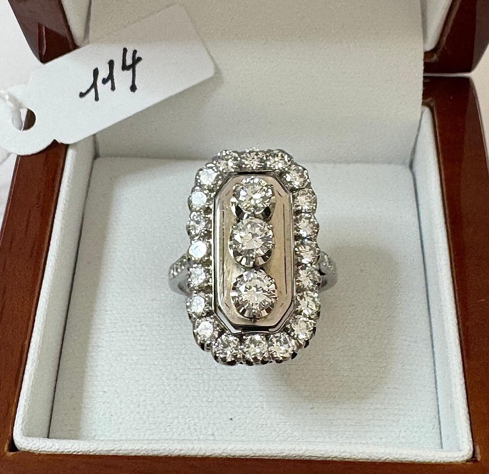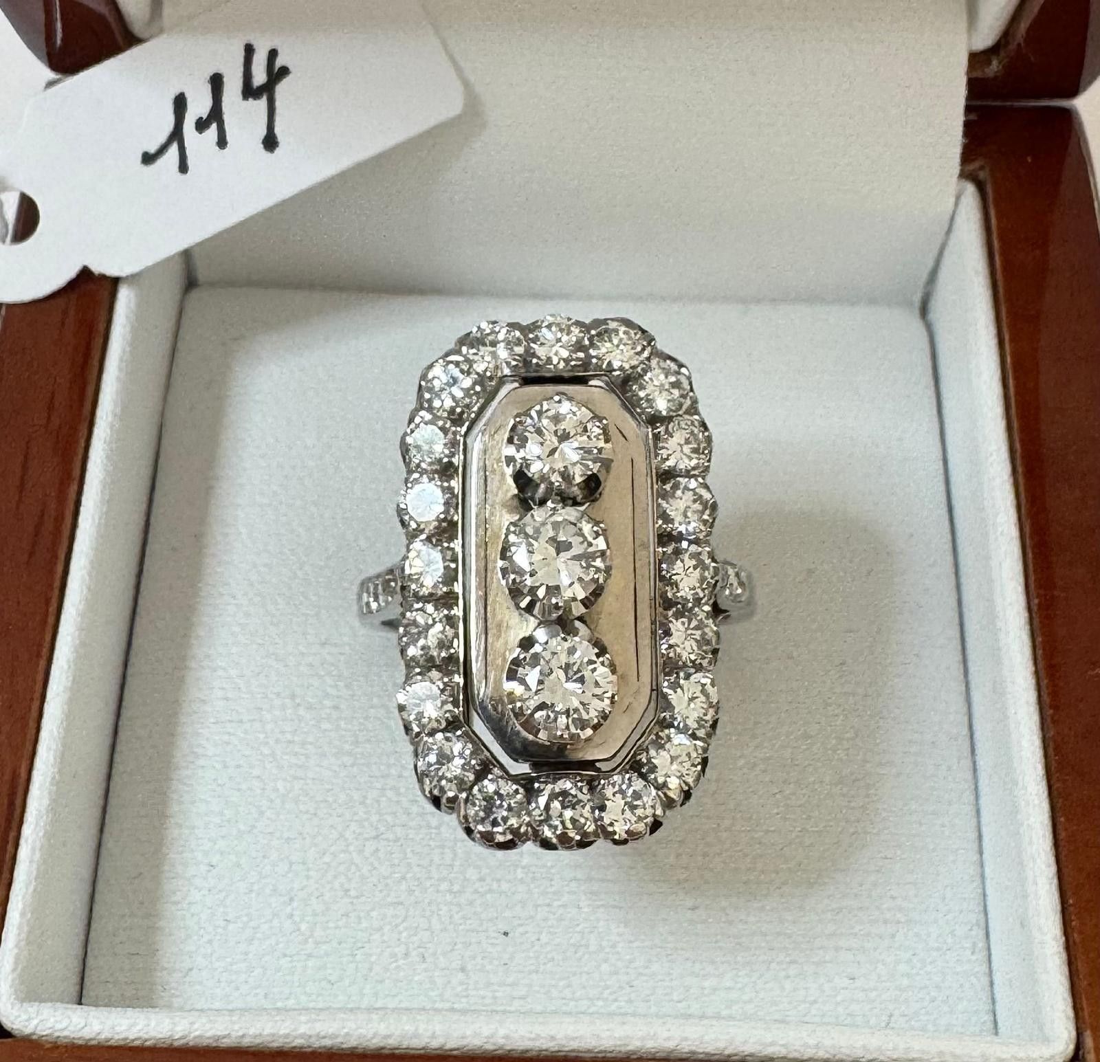 Marquise" ring in 18K 750 thousandths white gold and 850 thousandths platinum, set with 3 brilliant-cut diamonds in a setting of 20 brilliant-cut diamonds, totalling ~ 2.60cts - H / V.S - shoulders set with 6 diamonds - TDD / 55 - 10.2g