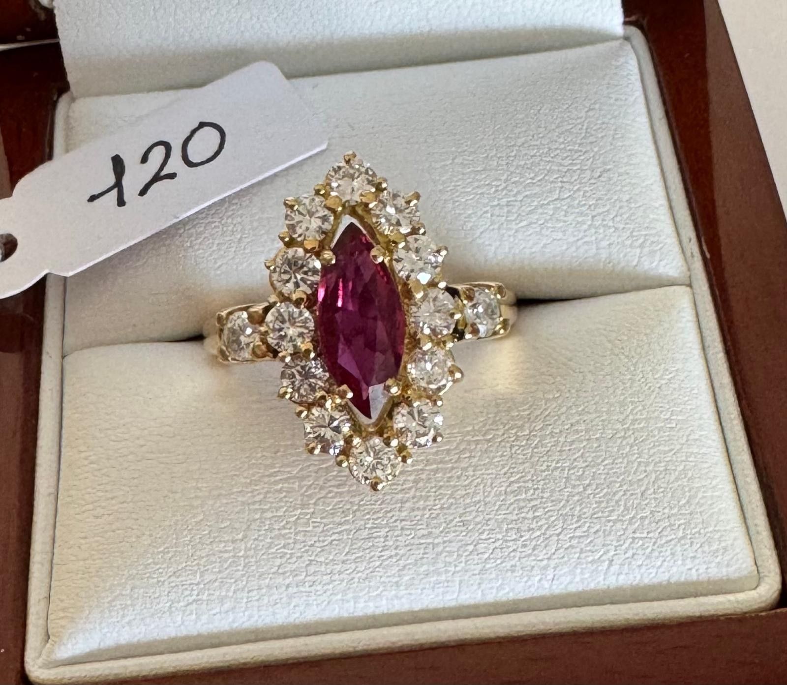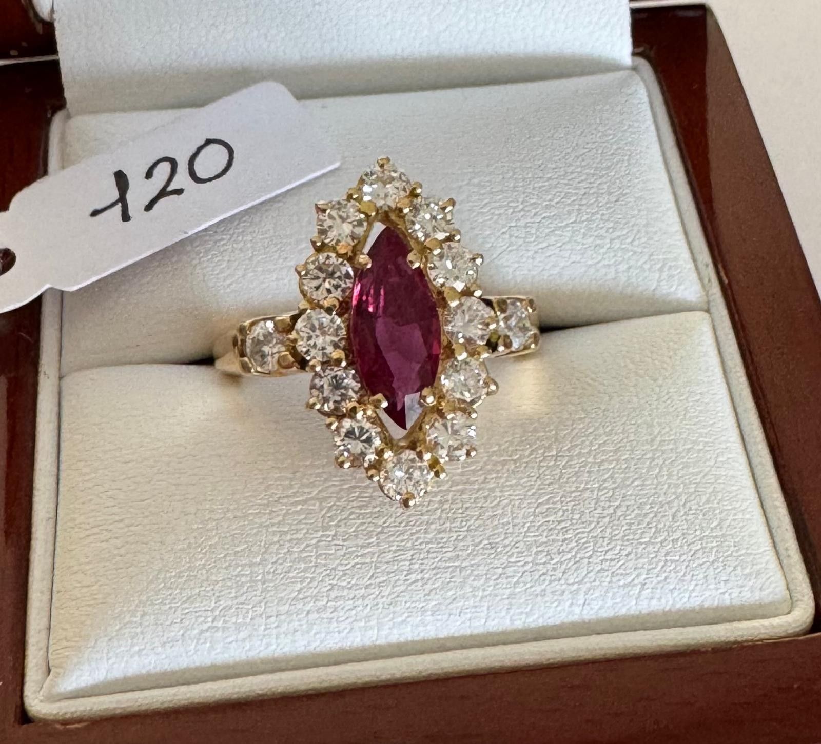 Marquise ring in 18K yellow gold 750 thousandths, set with a beautiful Navette-cut ruby in a setting of 14 beautiful brilliant-cut diamonds, totalling ~ 2.30cts - G to H / V.S.1 - TDD / 55 - 5.8g