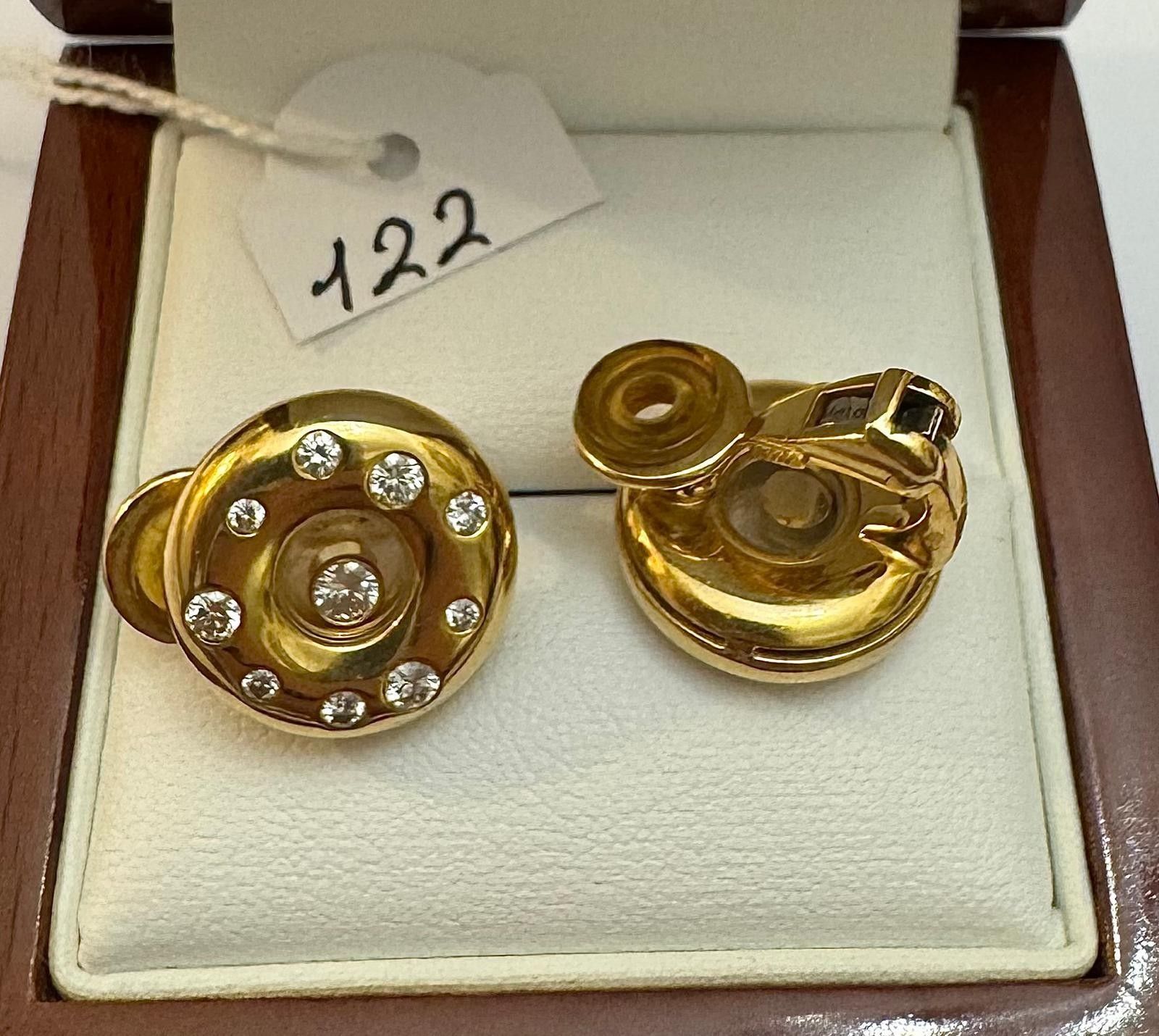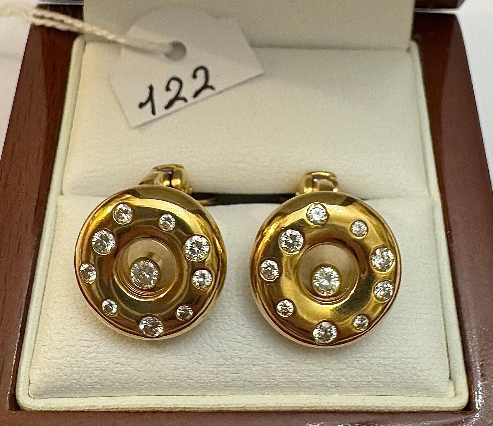 Pair of Earrings in 18K Yellow Gold 750 thousandths, Signed - CHOPARD - HAPPY DIAMONDS - Ø 18mm - Set with 20 beautiful brilliant-cut diamonds, for ~ 1.50cts - F to G / V.V.S - Including 2 mobile diamonds, Raquettes Clasps, n° 1868 - 16.2g ( With Case / Value 7650€uros )