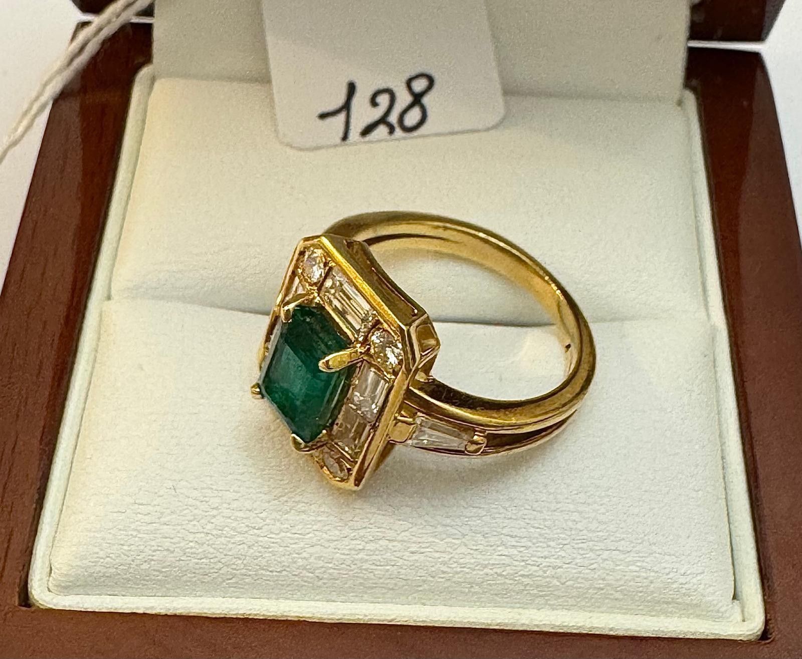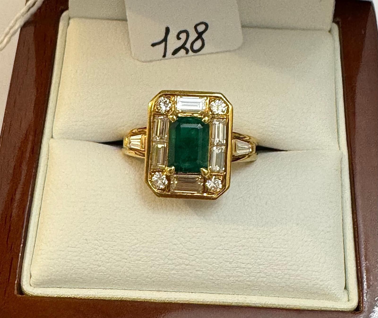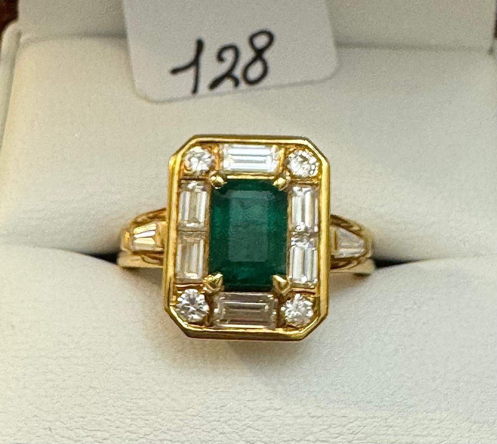 Ring in 18K yellow gold 750 thousandths, set with a beautiful Emerald-cut Emerald in a setting of 6 baguette-cut diamonds and 4 brilliant-cut diamonds, shouldered by 2 trapeze-cut diamonds, totalling ~ 2.10cts - G / V.S - TDD / 53.5 - 6.7g.