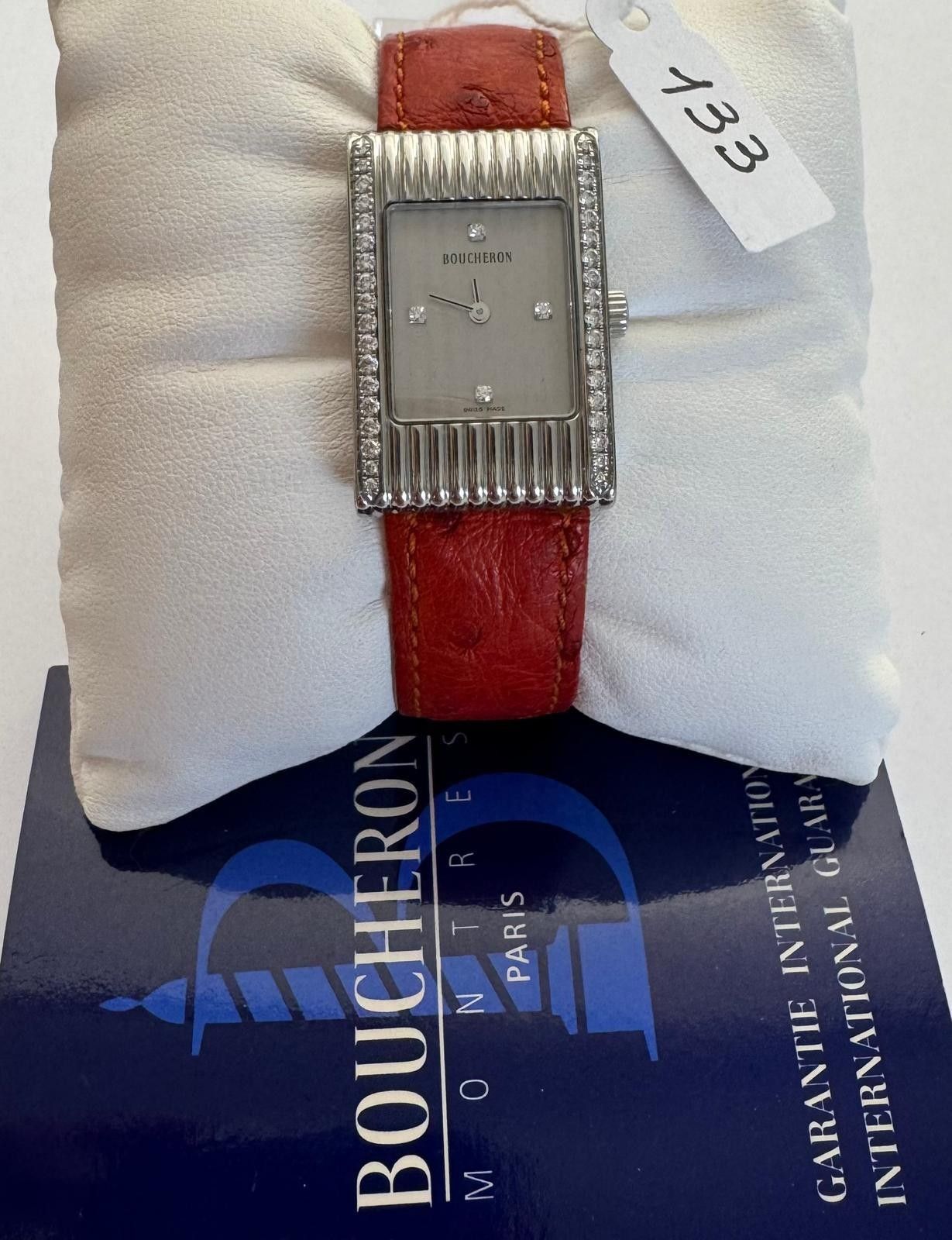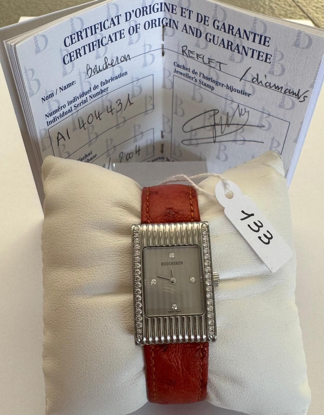 Steel watch, signed - BOUCHERON - REFLET - Dial and hour-markers, set with 40 beautiful brilliant-cut diamonds, for ~ 1ct - F to G / V.V.S - Quartz movement / 33mm X 21mm - Ostrich bracelet with Boucheron steel buckle, Ref AI 404431 - 24,7g ( Very good Condition / Boucheron Certificate / Value 7750€uros )