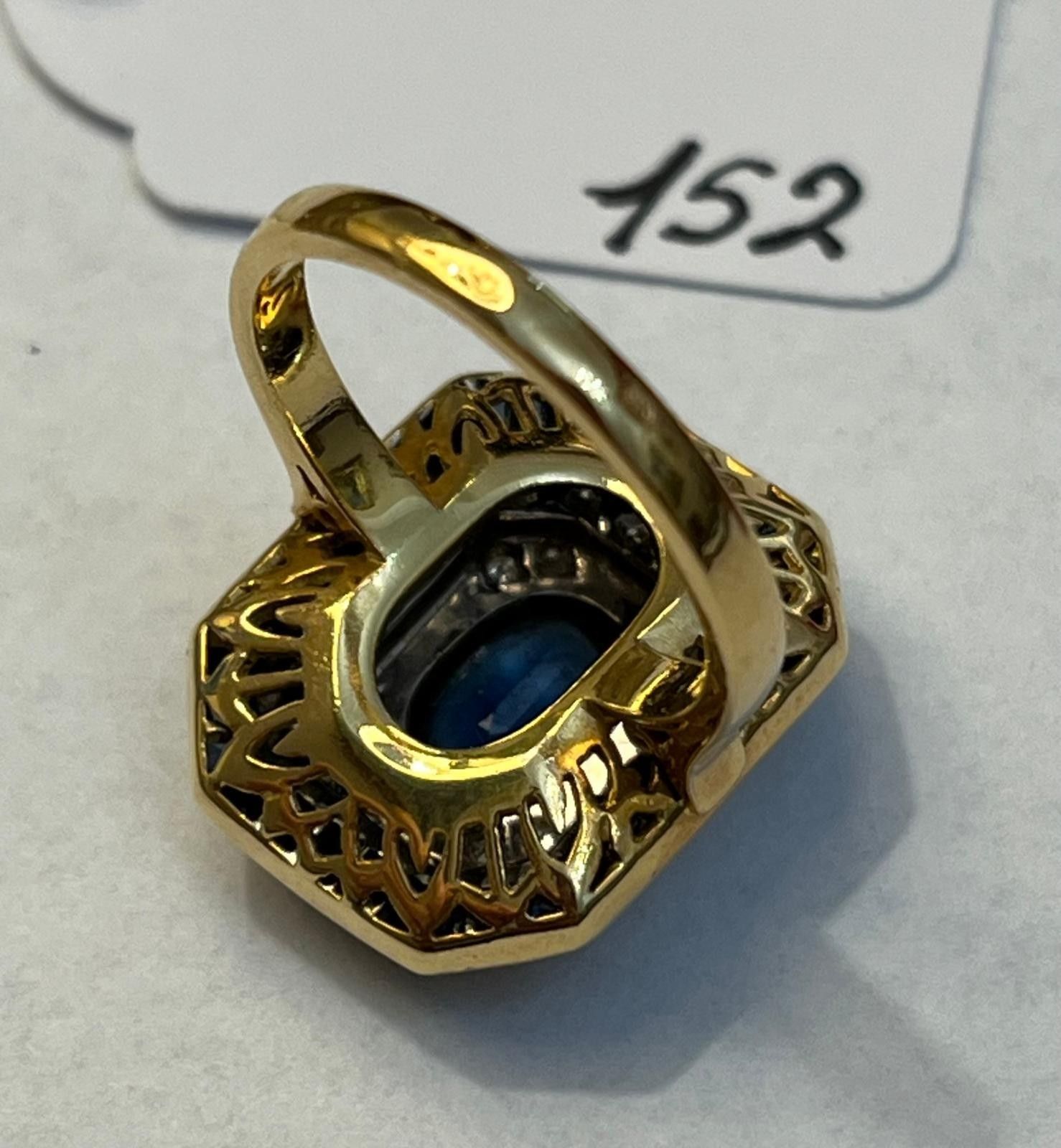 Ring set in 2 golds, set with a beautiful oval blue sapphire ~ 1.95ct in a double setting of 28 brilliant-cut diamonds, for ~ 1.40ct - G to H / V.S.1 and 32 calibrated sapphires, for ~ 1.50ct - TDD / 54 - 7.9g