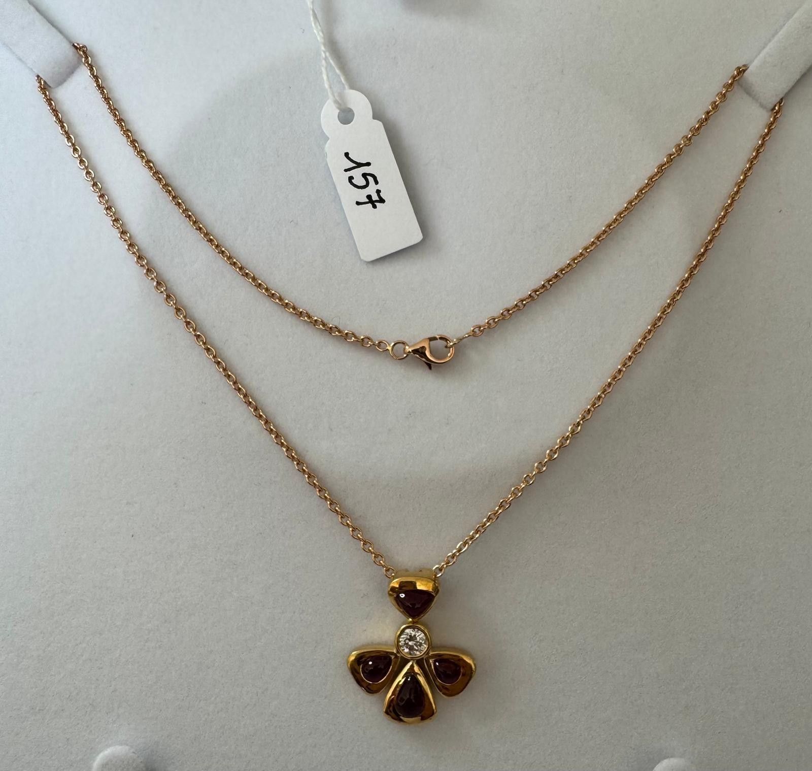 18K yellow gold forçat chain, supporting a yellow gold pendant, set with a beautiful brilliant-cut diamond measuring ~ 0.50ct, shouldered by 4 cabochon rubies, for a total of ~ 2.20cts - H / V.S - 13.4g