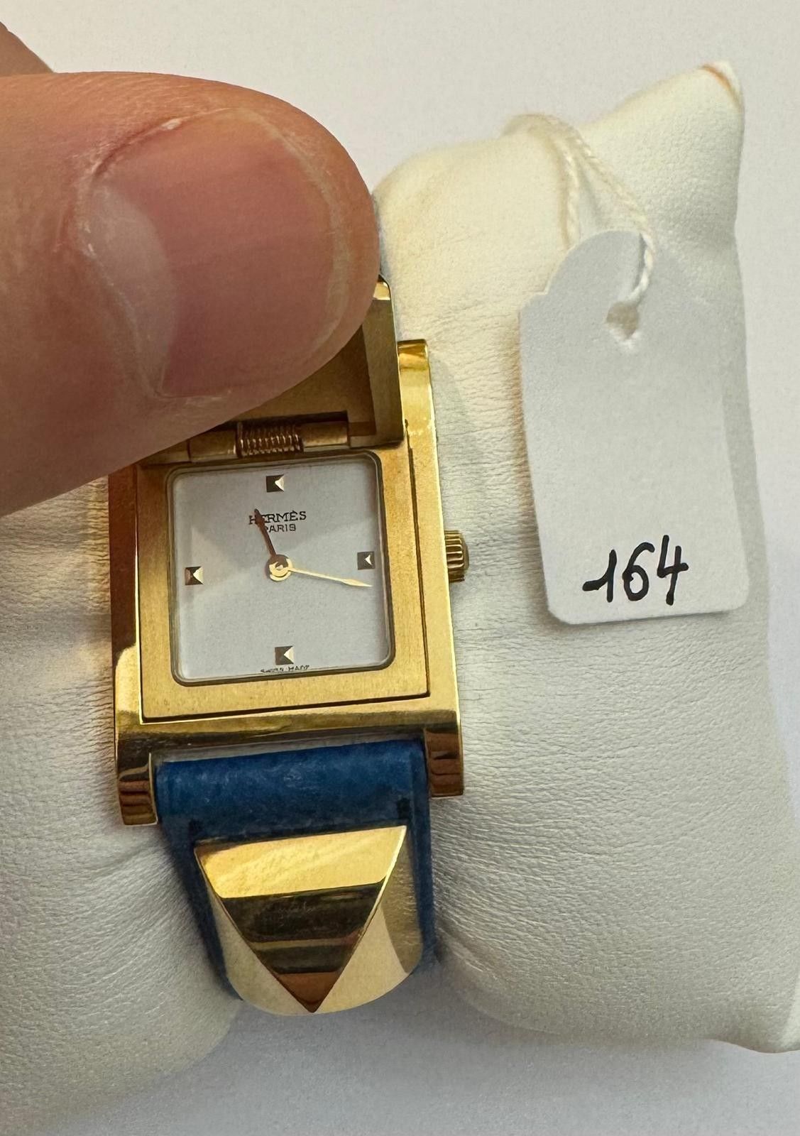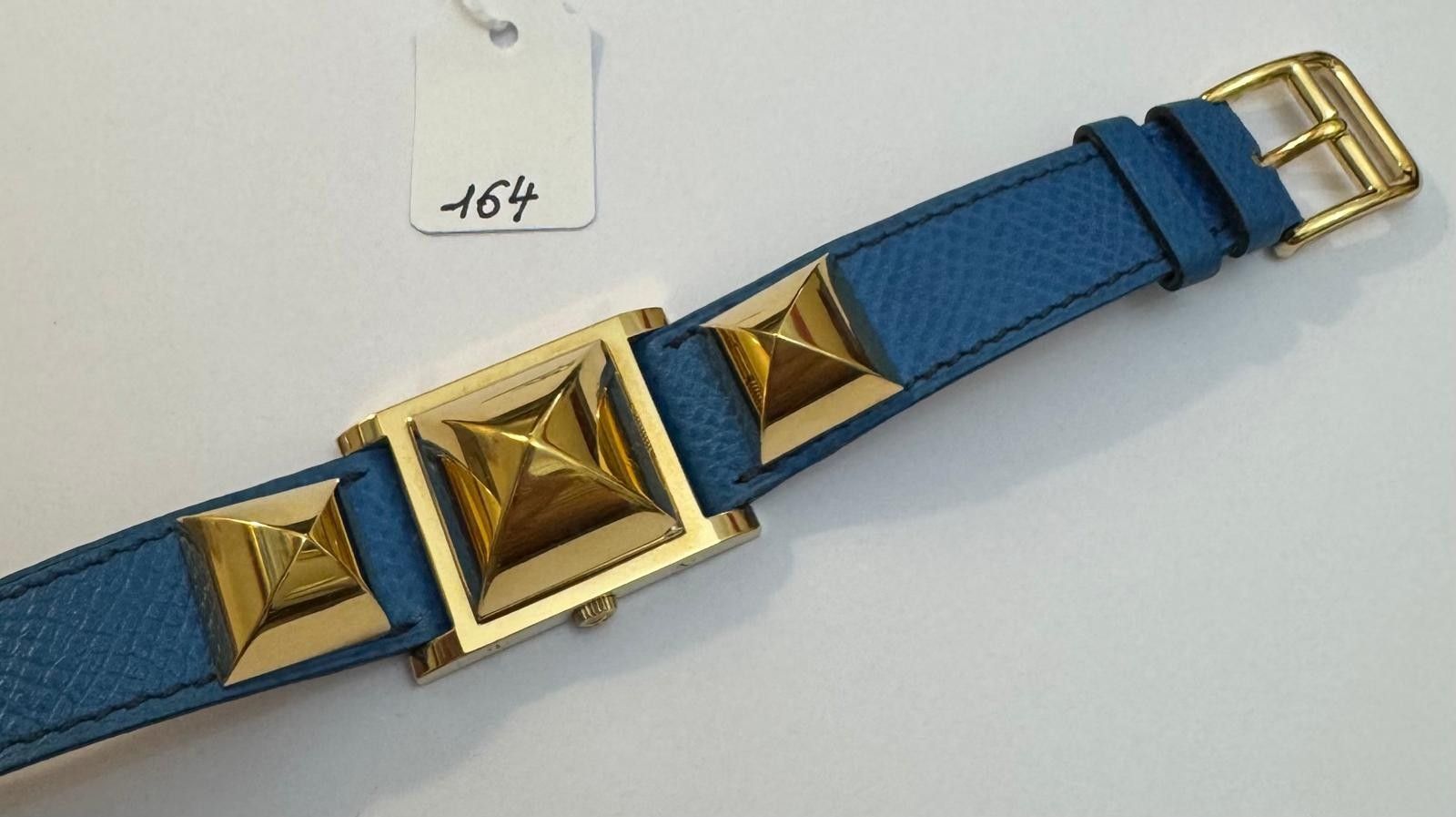 Gold-plated watch, signed - HERMÈS - MEDOR - Blue leather strap, with pin buckle, signed Hermès, n° ME1.201 / 744322 - 42,9g ( Very Good Condition )
