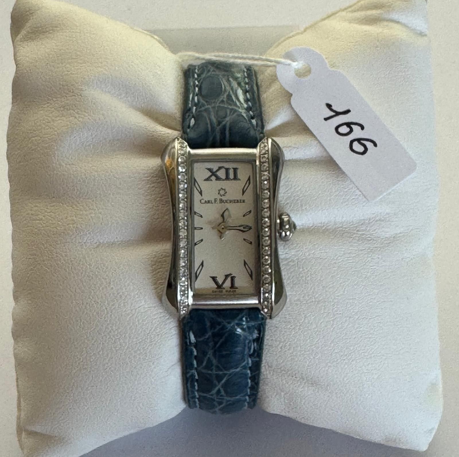 Steel watch, signed - CARL F. BUCHERER - ALACRIA - Dial set with 40 beautiful brilliant-cut diamonds, for ~ 0.50ct - F to G / V.V.S - Quartz movement / 30mm X 20mm - Alligator strap with folding clasp, Ref 10703.08 / 18.0763 - 29.3g ( Good Condition / Brand on strap )