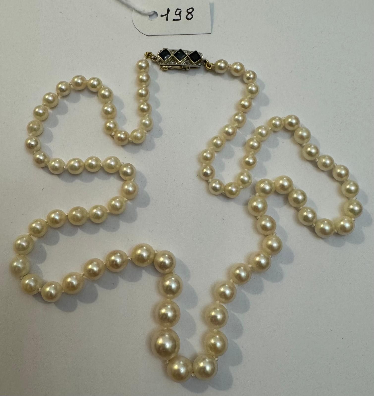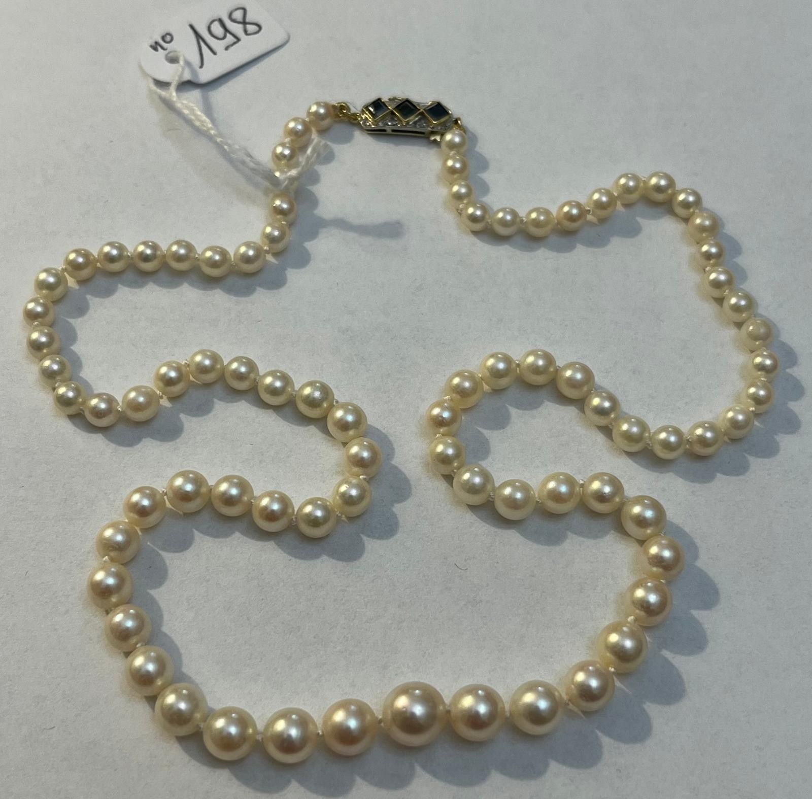 Necklace of falling pearls, clasp in 2 18K 750 thousandths gold, set with 3 sapphires and 8 diamonds, 46cm long / 20.1g