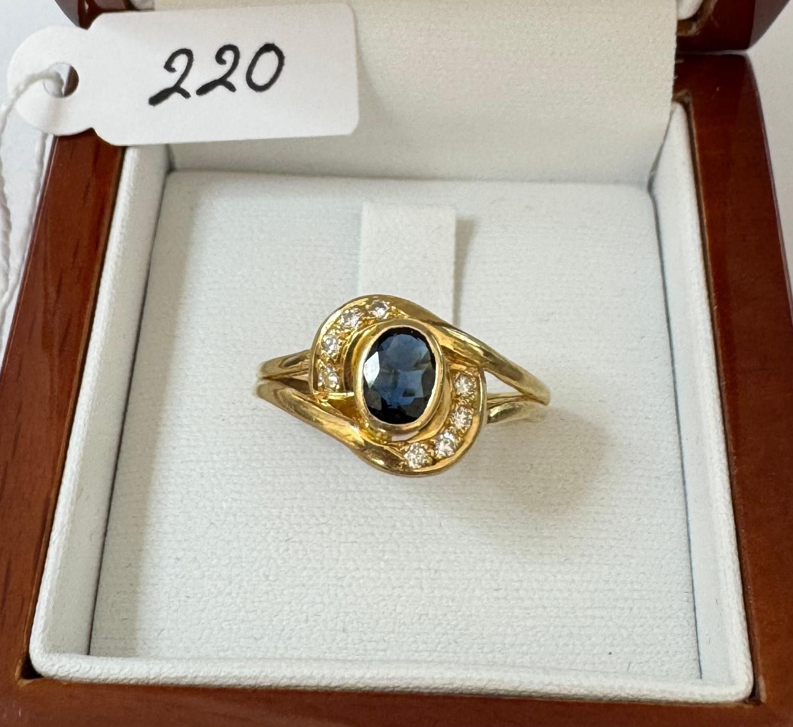 Ring in 18K yellow gold 750 thousandths, set with an oval sapphire set with 8 brilliant-cut diamonds - H / V.S - TDD / 59 - 4.3g