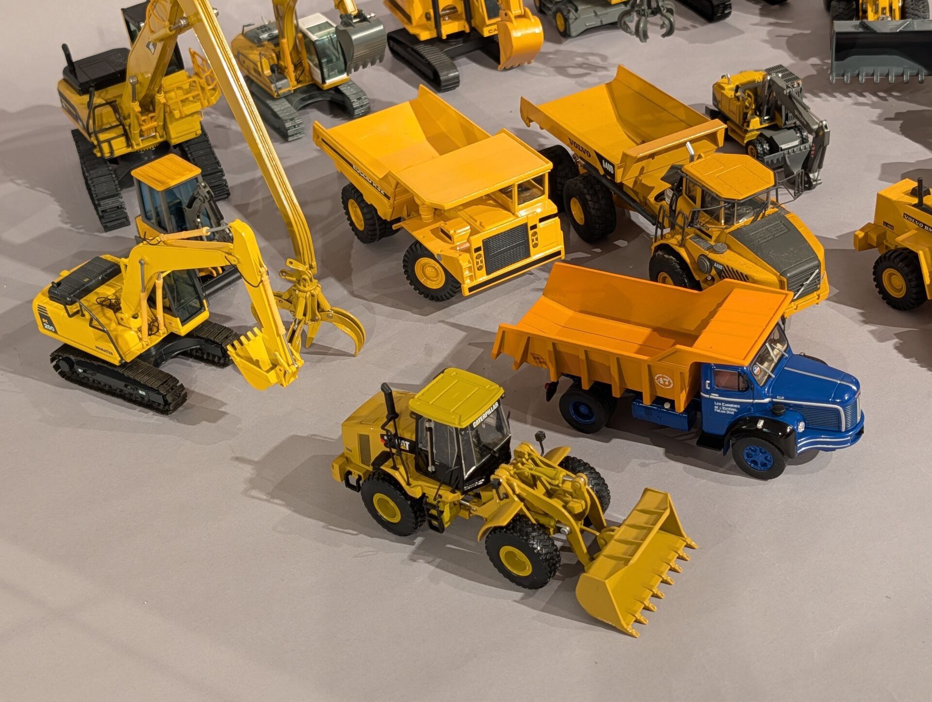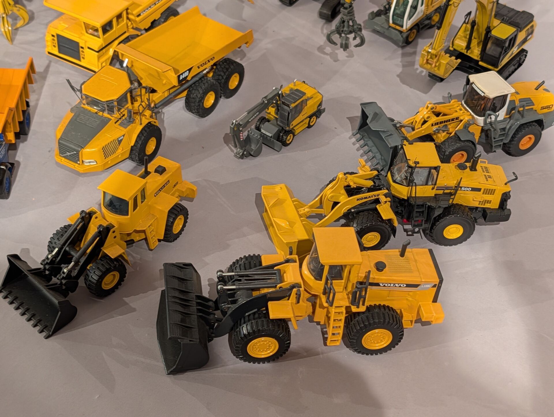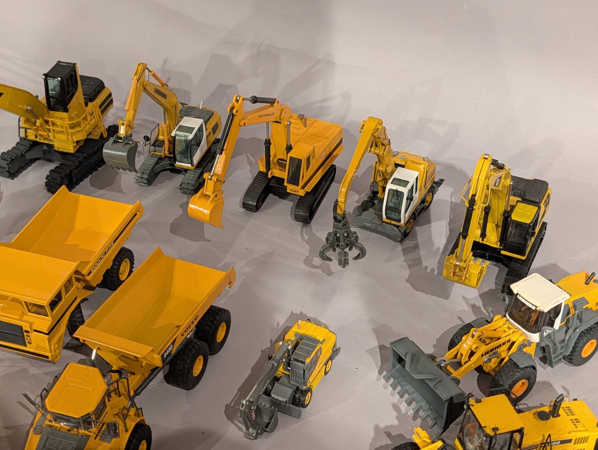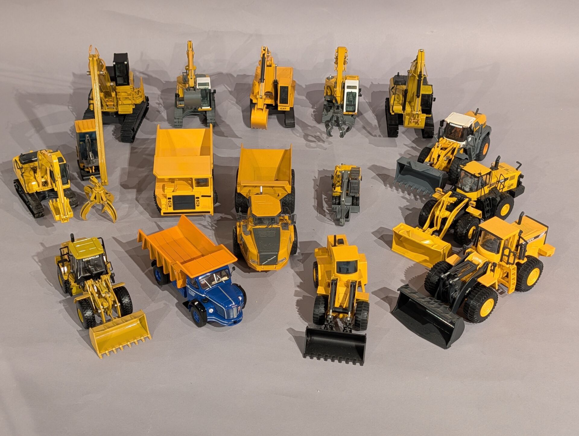 Set of fourteen miniature public works vehicles (including 1/50 scale) including mini excavator and digger