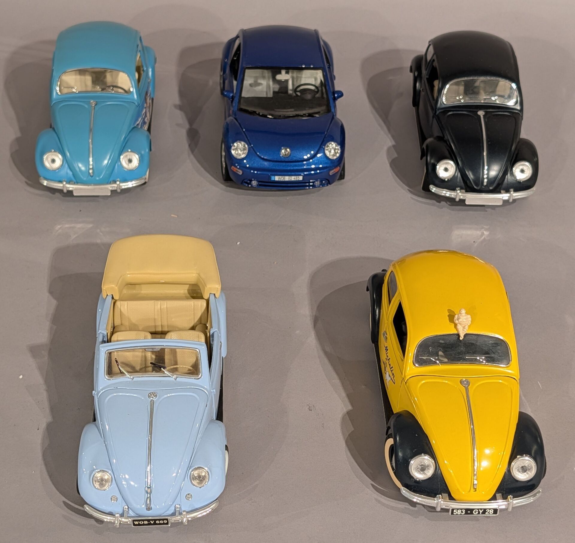 Suite of five 1/17 scale miniature Beetles from different periods including advertising (SUCHARD and MICHELIN)