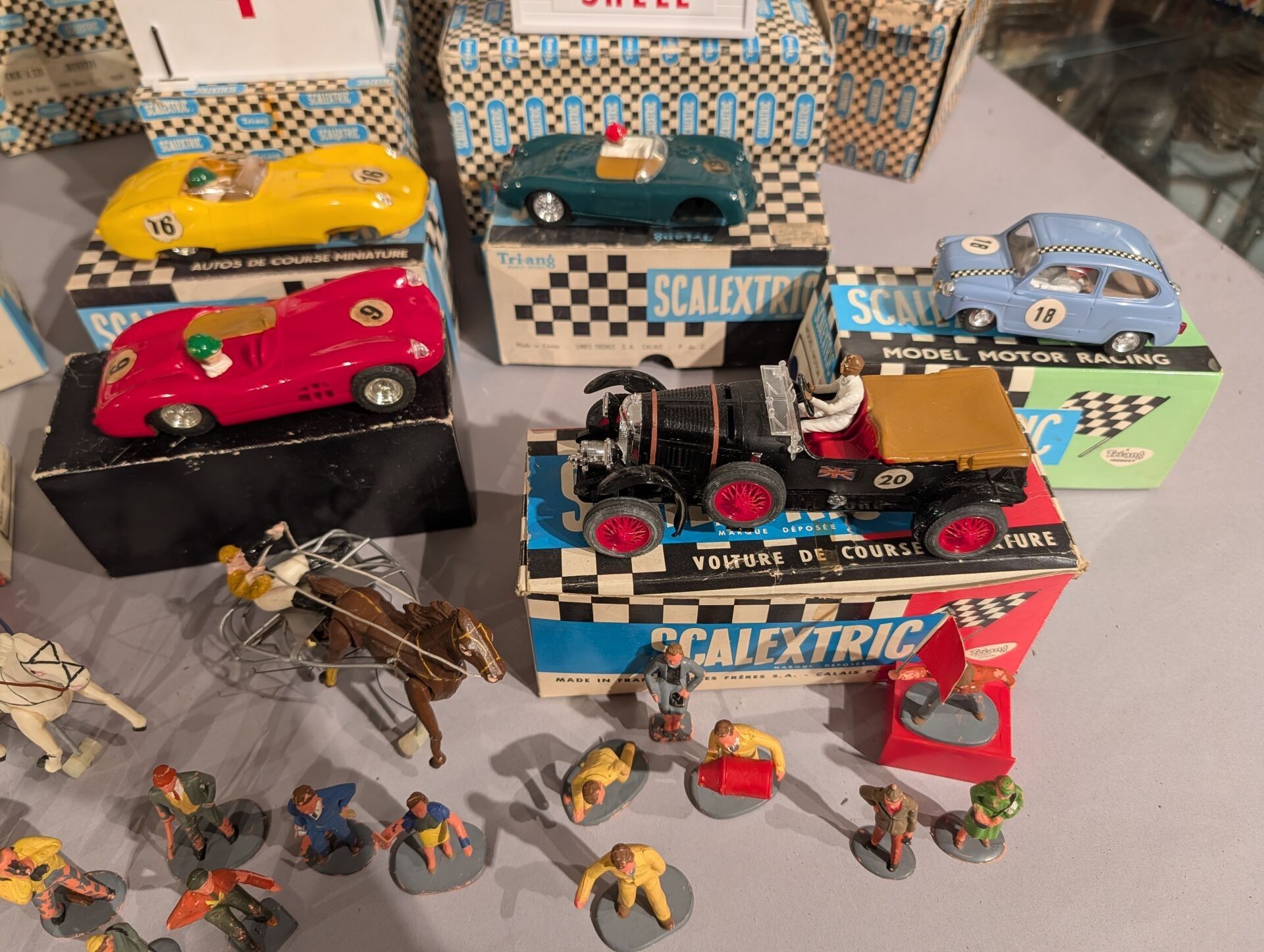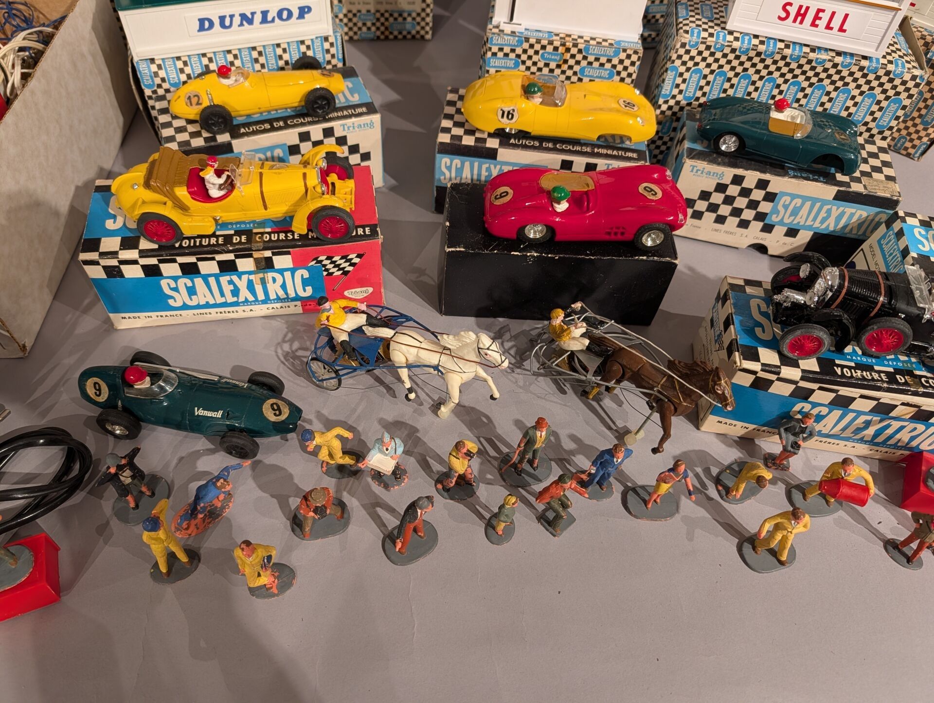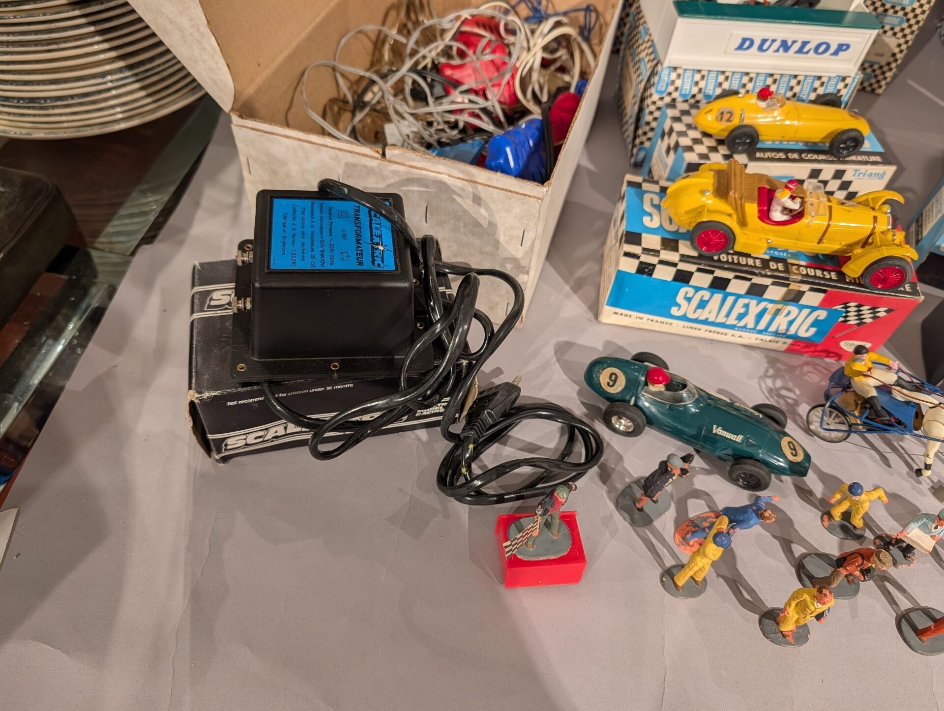 Car circuit comprising a ref 29 box, two boxes of rails, eight cars (including Bentley, Alfa Romeo, Porsche, etc.), seven stand elements (grandstand, racer's stand, etc.), joysticks, two sulky horses, small characters and the transformer.