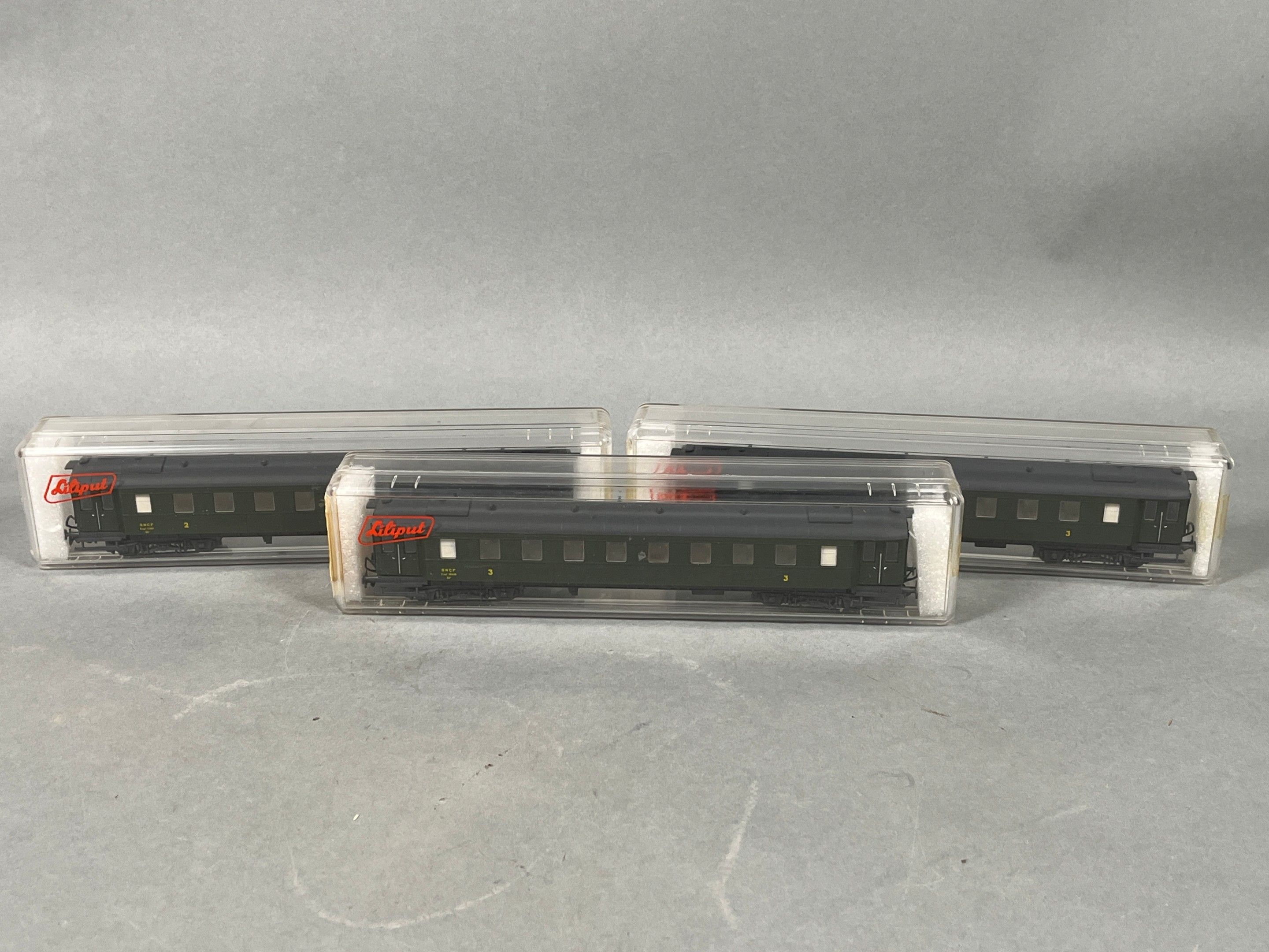 HO Lot of 3 LILIPUT SNCF 2nd and 3rd class passenger carriages; new in boxes.