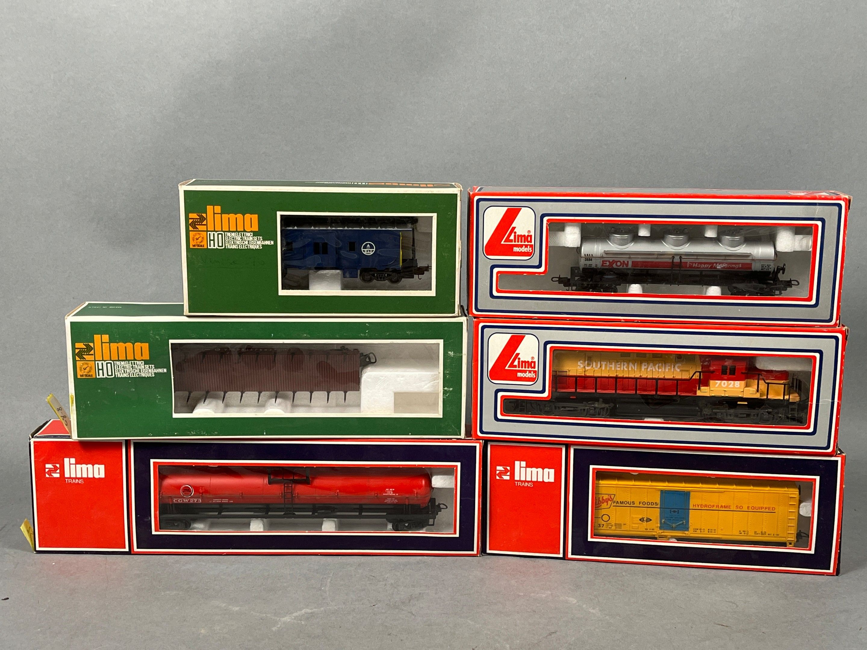 HO Set of 5 LIMA freight cars, item nos. 3232 / 3625 / 3221 / 3121 / 3263 + 1 Southern Pacific LG 208089 locomotive. With boxes.