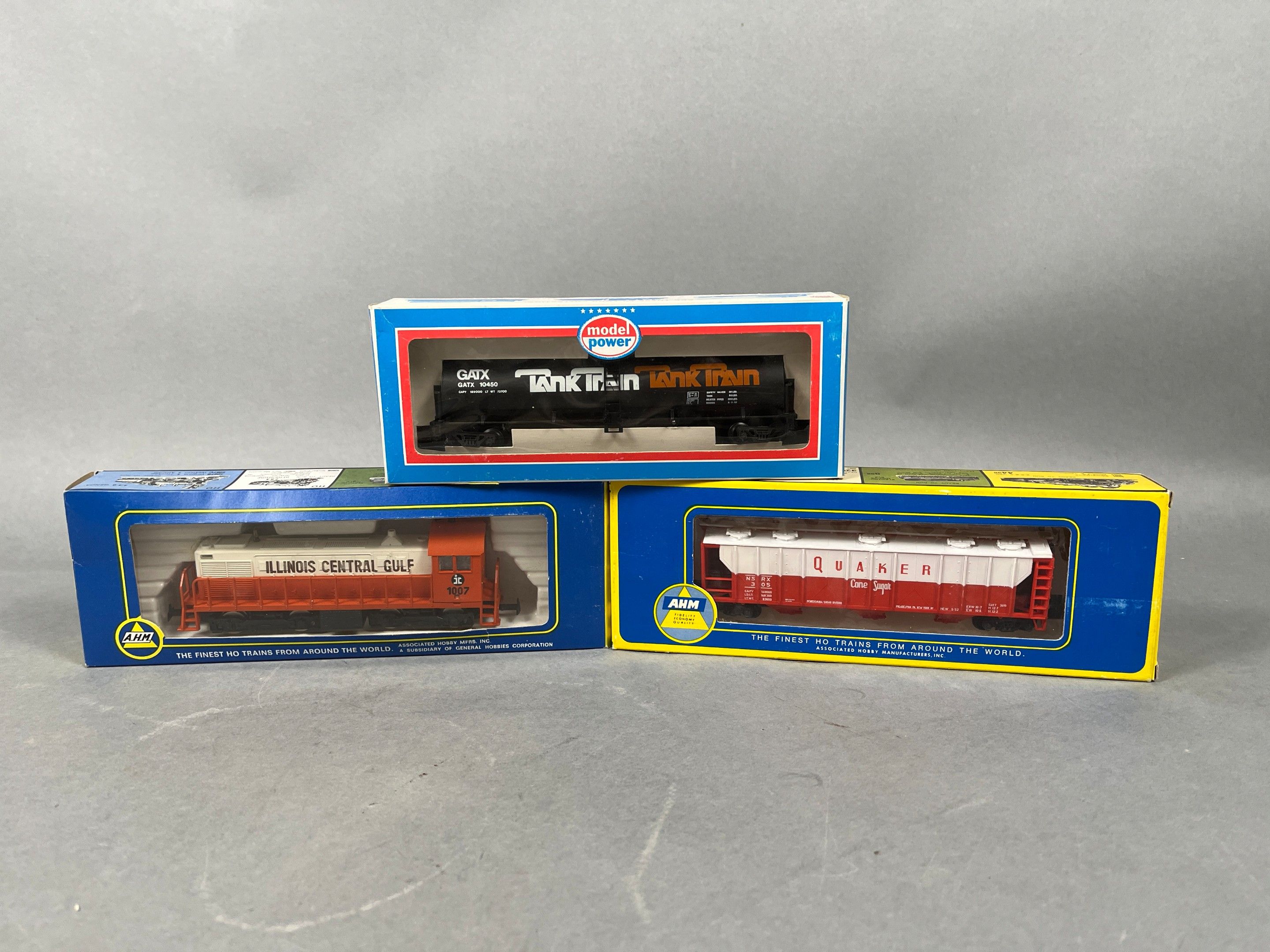 HO Lot of 2 freight cars (MODEL POWER AND AHM) + 1 central Illinois Gulf AHM locomotive. Very good condition, in boxes.