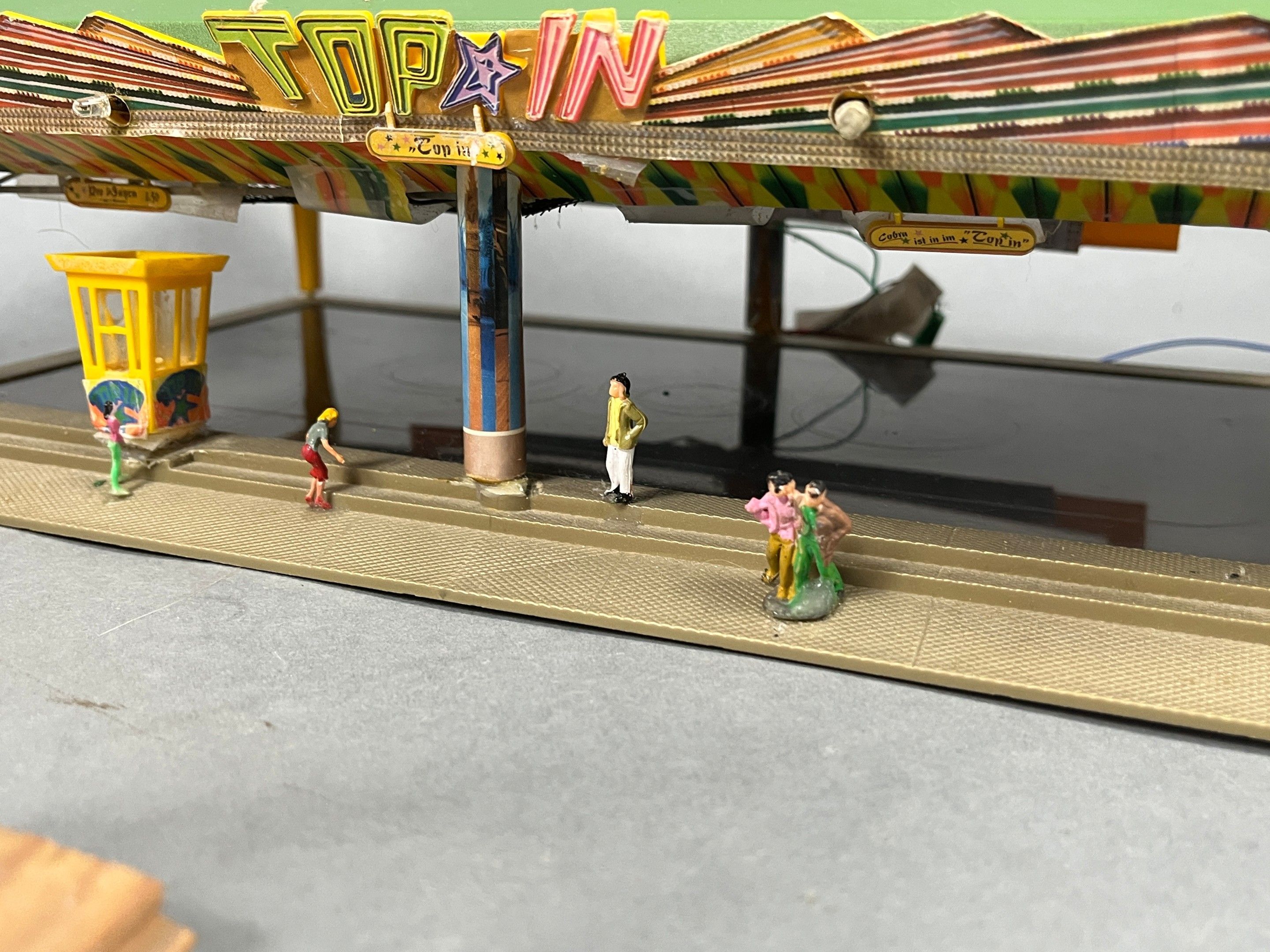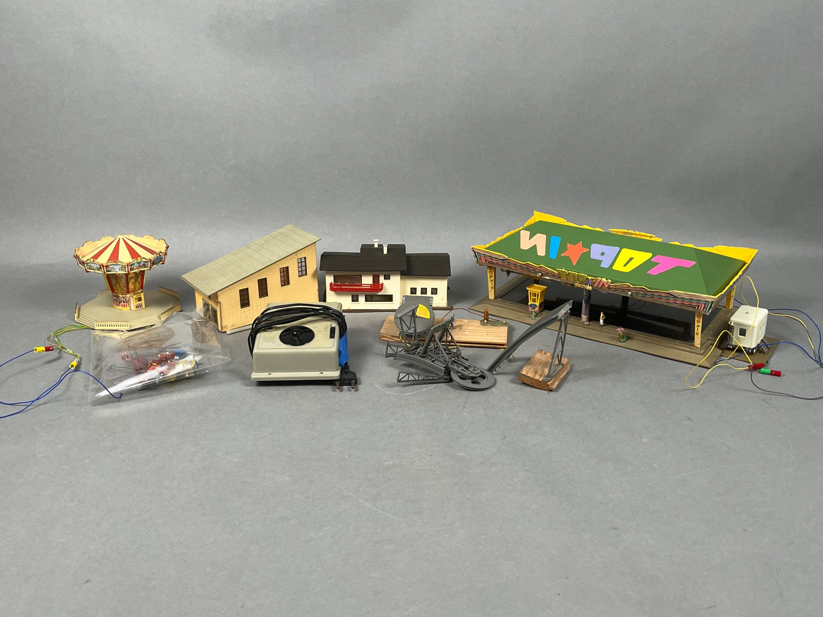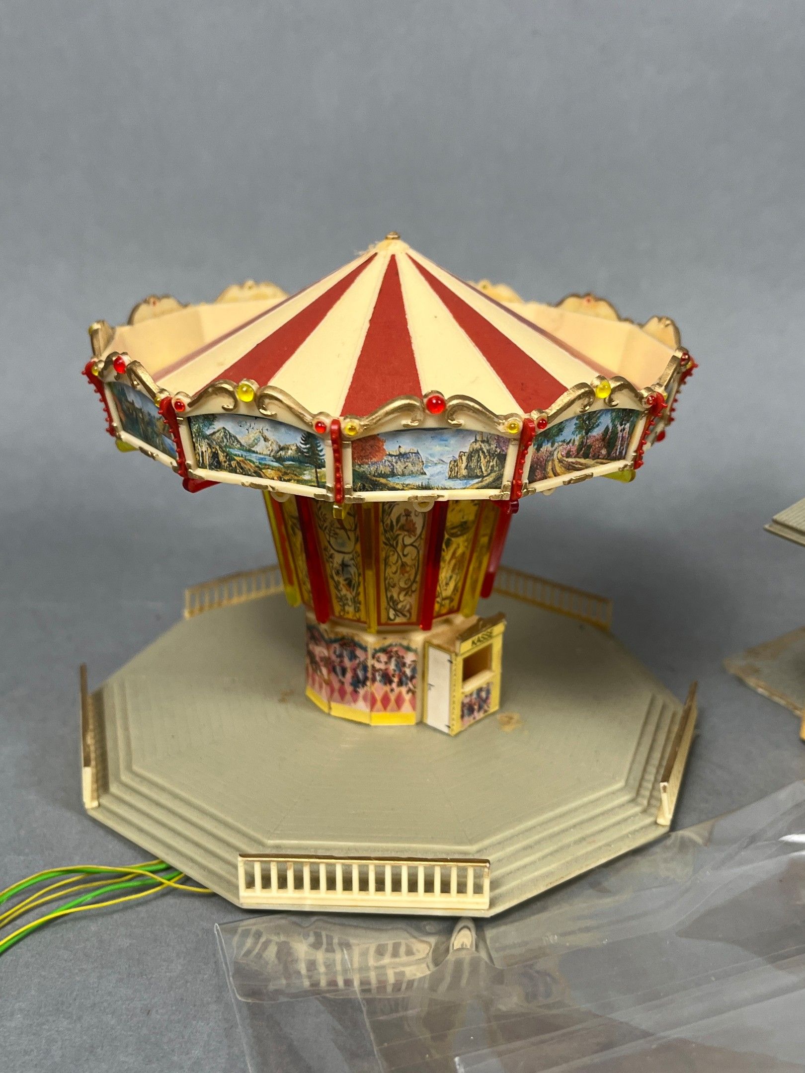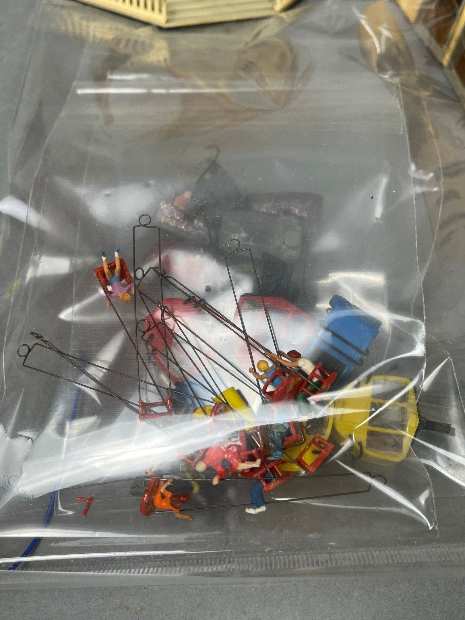 HO Lot comprising 1 cable car + 1 car scooter ride + 1 small flying chair ride (1 chair missing) all in working order, works and lights up; supplied with 1 DC and AC transformer to power the set.