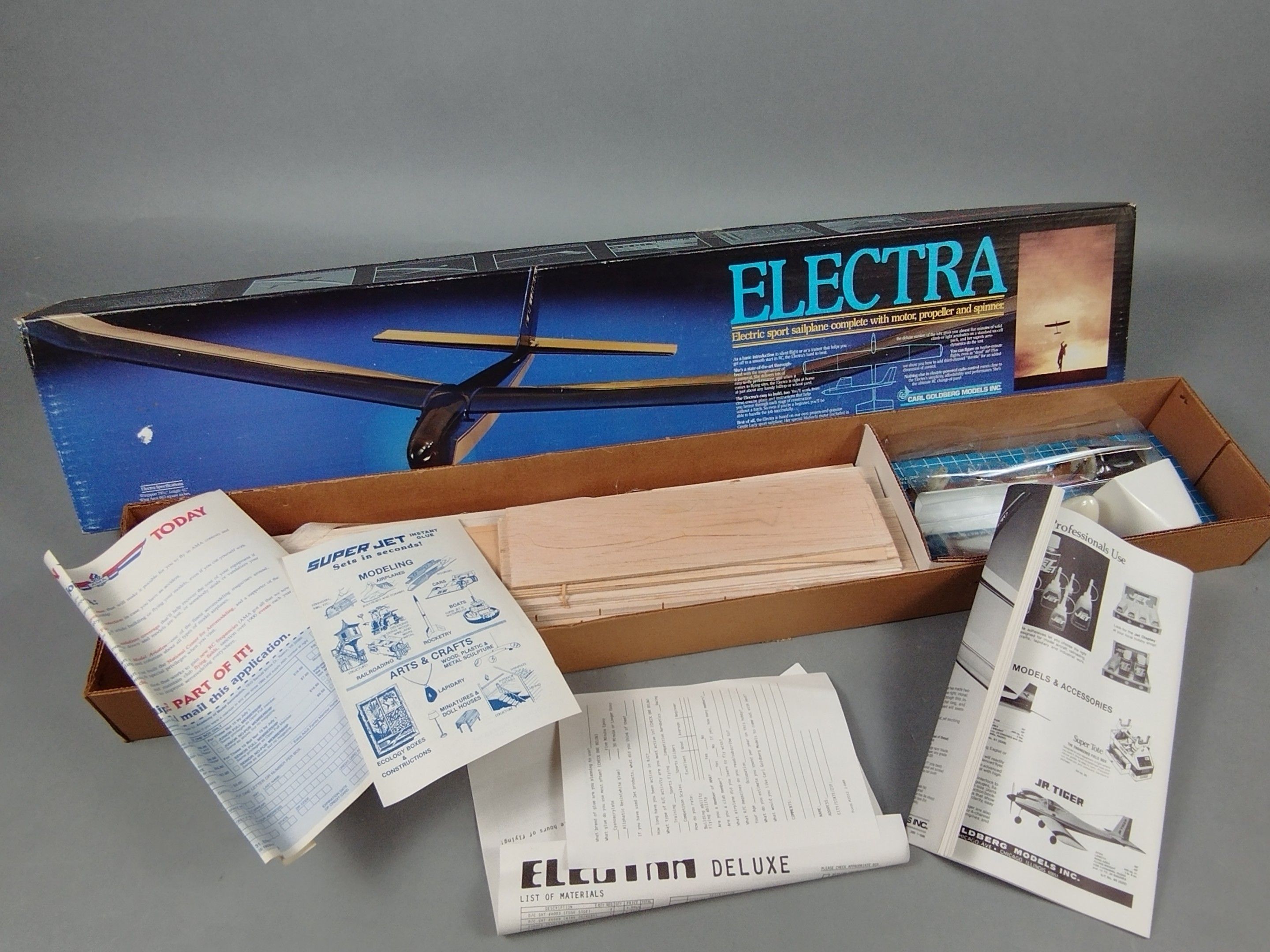 ELECTRA electric motorglider box, complete with 55.0 turbo motor, propeller and instructions. Choice of 2 or 3 channels; the wooden parts are pre-cut. Wingspan: approx. 2 m.