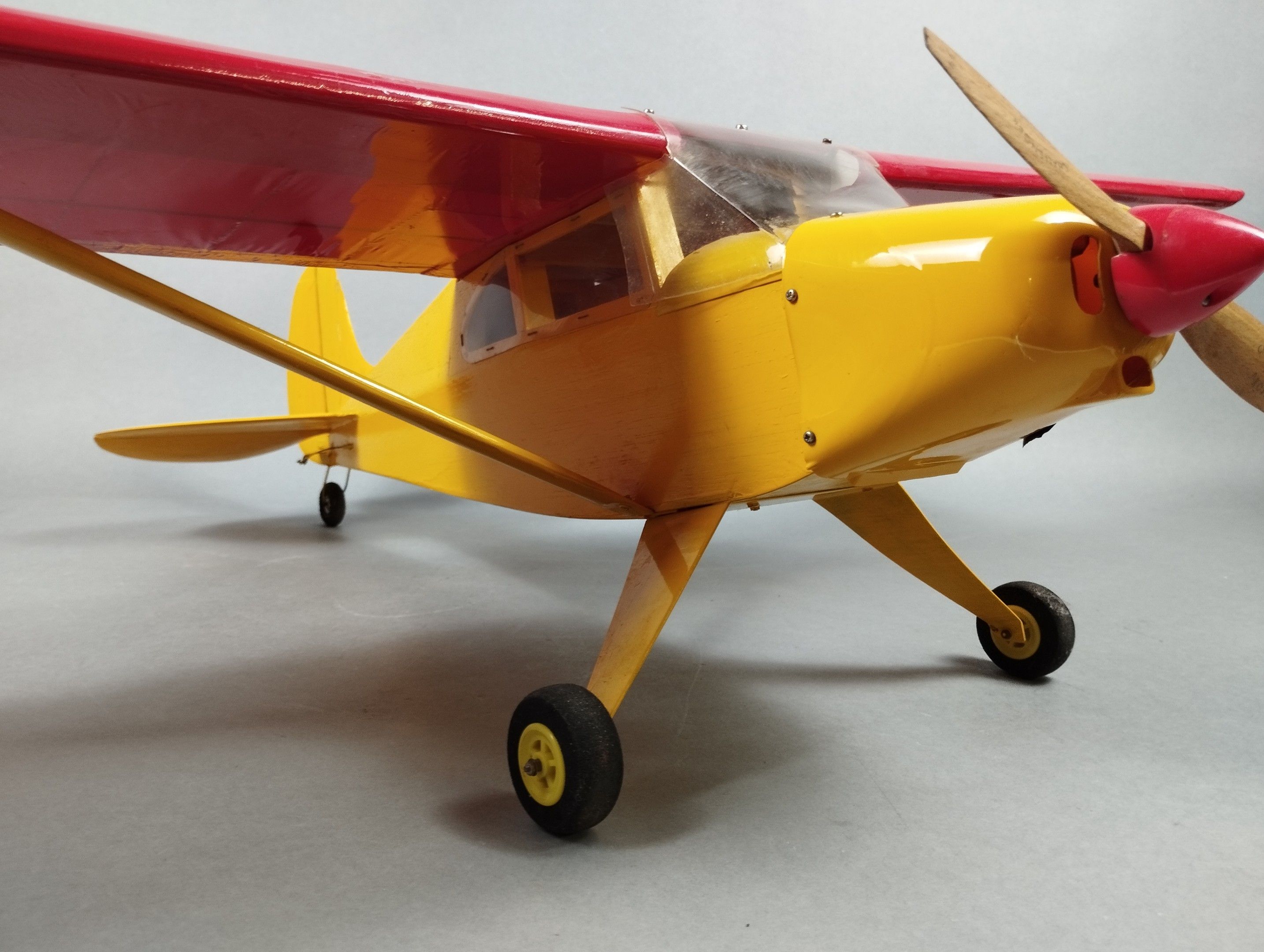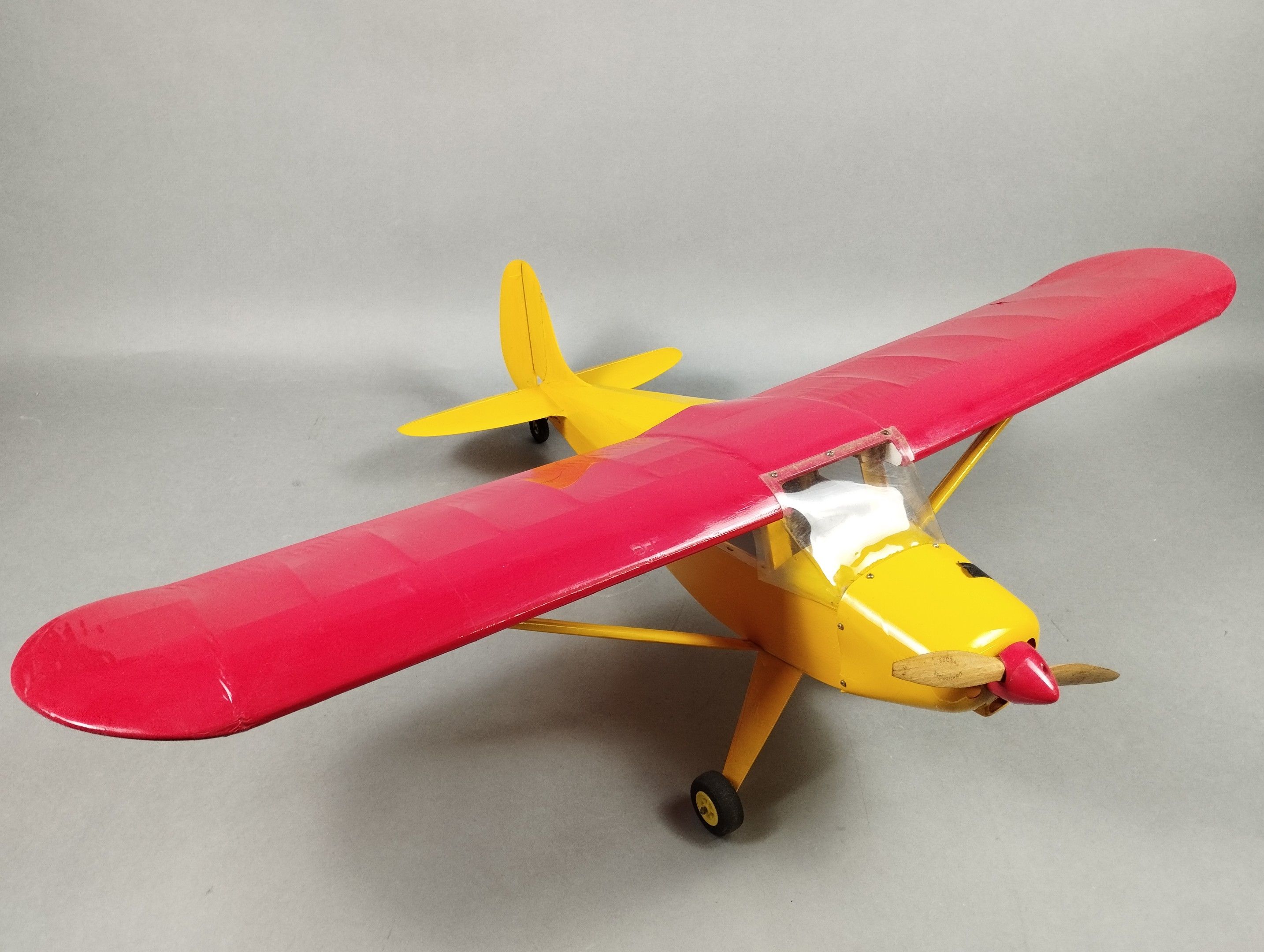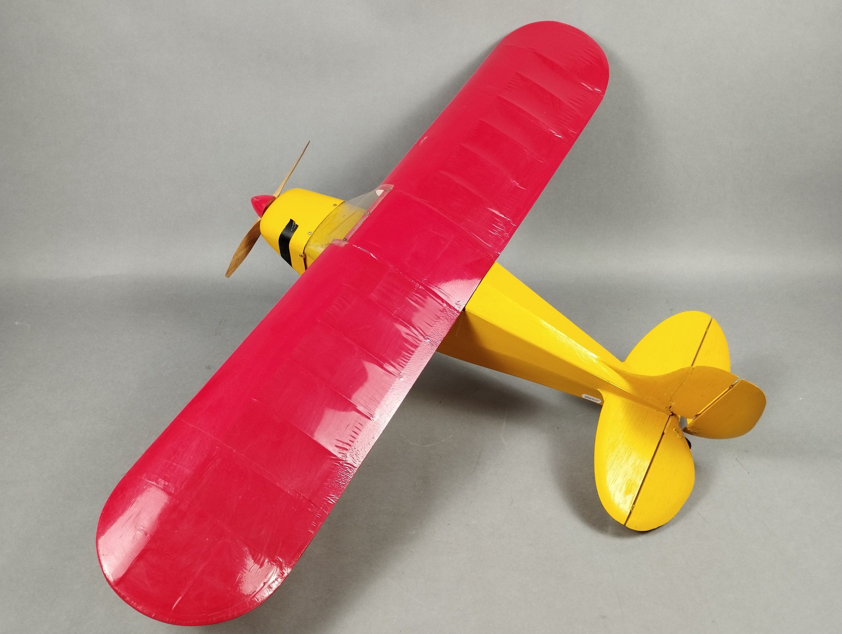 Red and yellow high wing for beginners or for decoration to equip. No motor or servo. Wingspan: 101.5 cm. Minor damage to the nose.