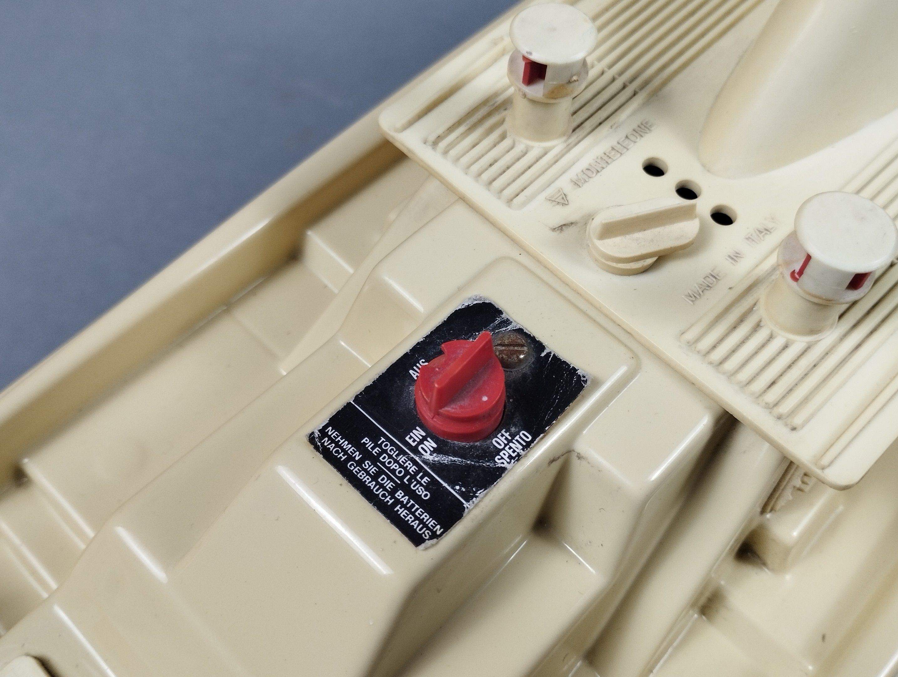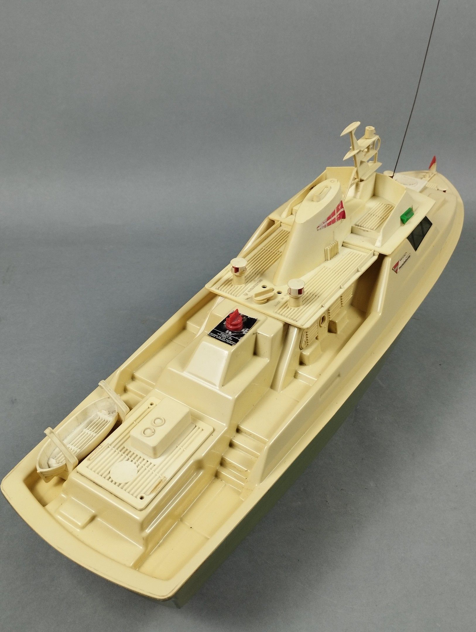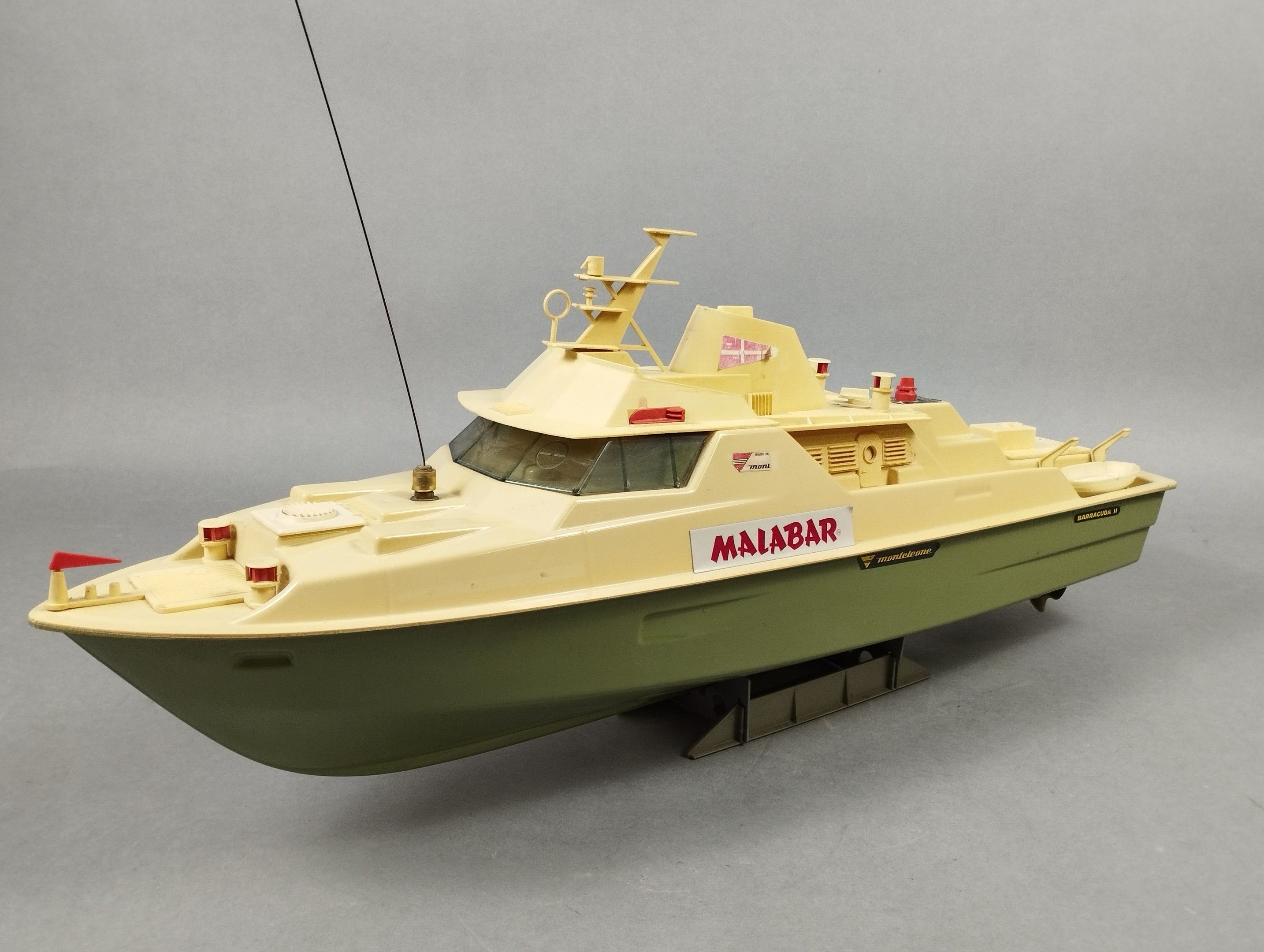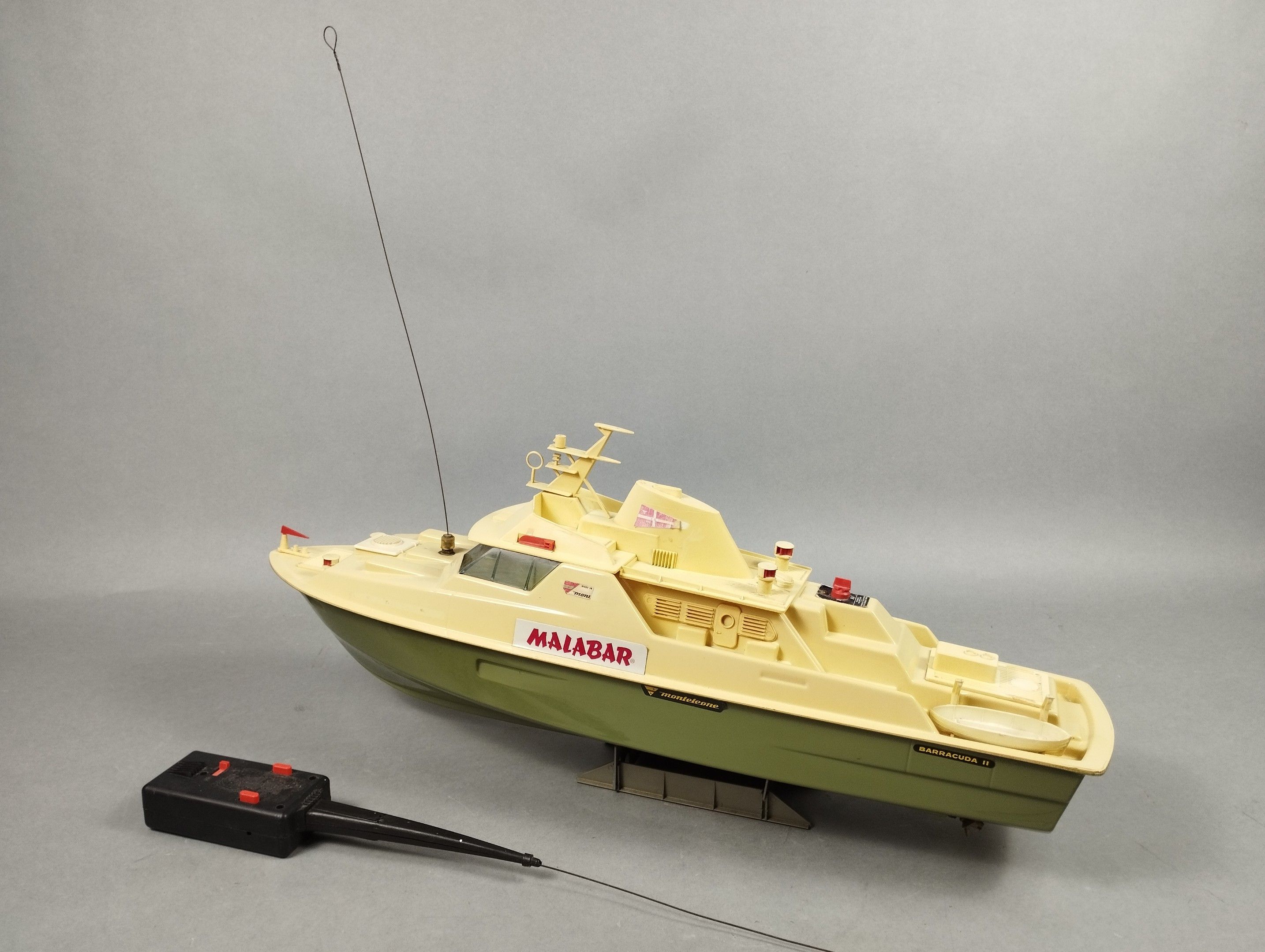 Remote controlled sailing toy Malabar boat "Baracuda II" from MONTELEONE; 2 electric motors. L. = 66 cm. Missing battery cover on remote control, otherwise very good condition.
